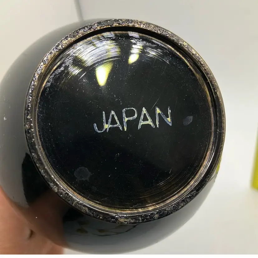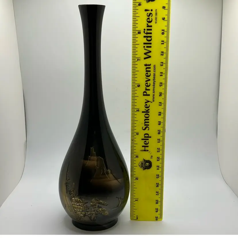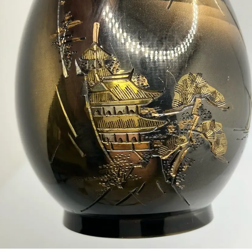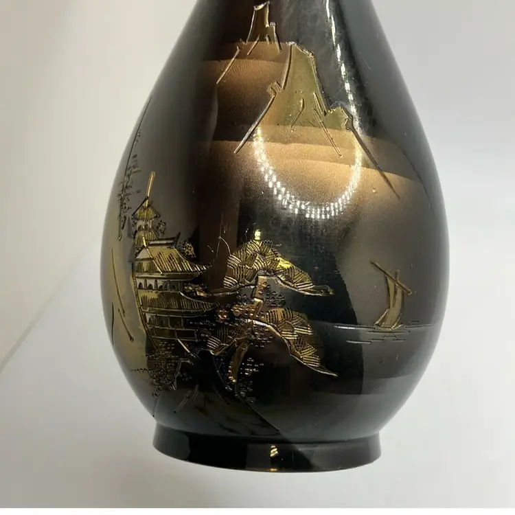 Black metal vase with gold Anna copper toned etching. Good condition - no issues. Etched scene includes mountains, water, boat, trees, pagoda. Tall, thin vase marked Japan on bottom.