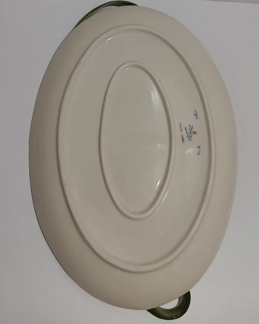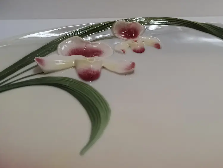 Stunningly Gorgeous Franz Porcelain Platter in the Rare Ladies Slipper Orchid Design Pattern. Signed and Marked; No Chips or Cracks or Crazing! The most beautiful colors! 13" W thru Handles x 8.75" L x 1" H; Excellent Condition!