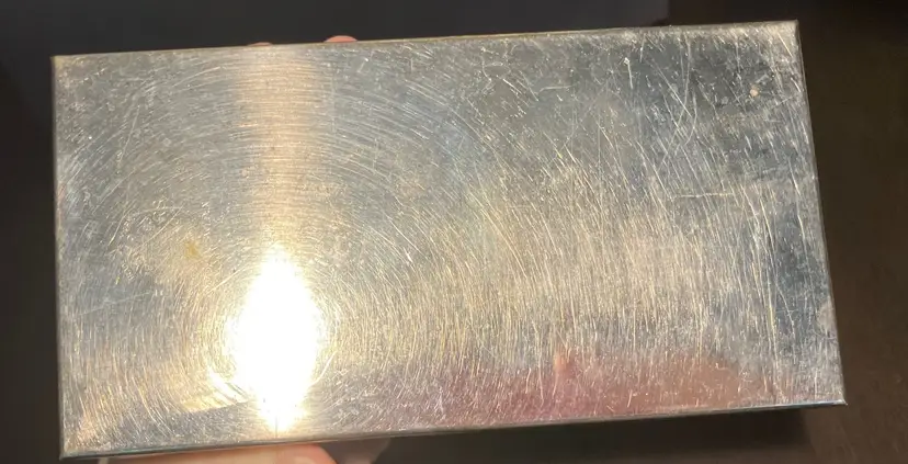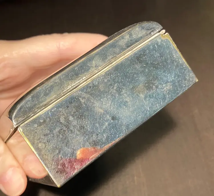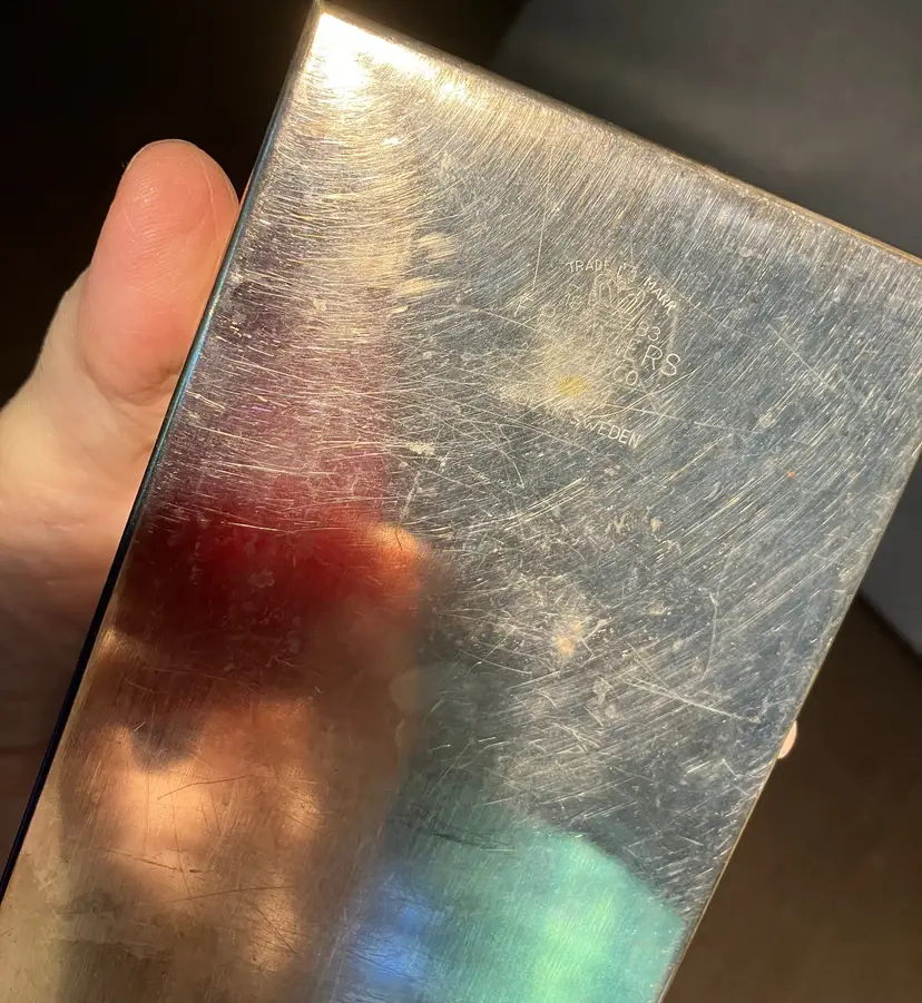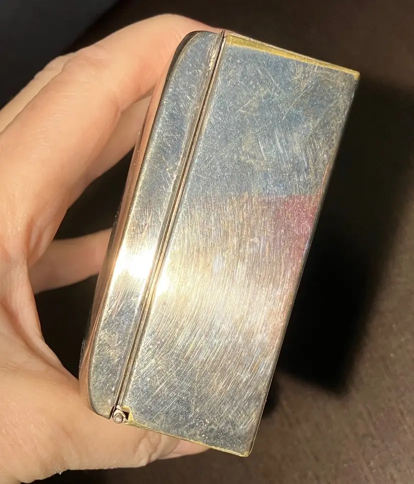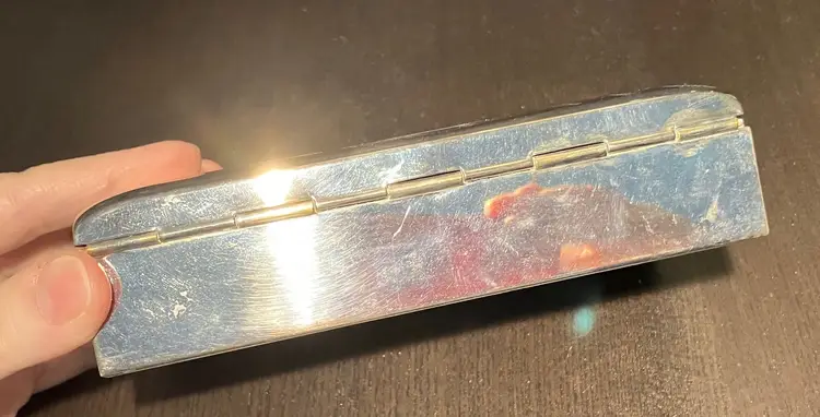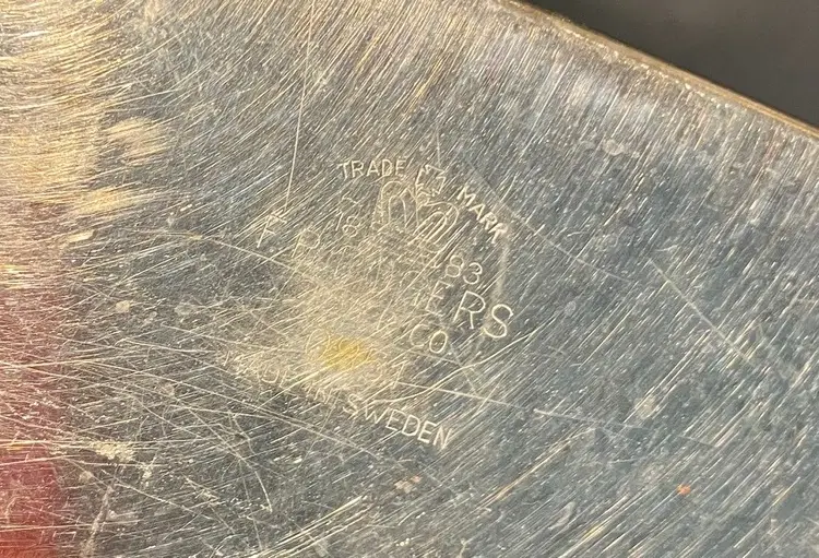 Beautiful metal box. On the back, it says FB Rogers, 0851 and made in Sweden. It has a wooden insert that can be removed. In some of the photos the finish looks red, but that is only because my phone has a red case, so the red is reflecting off the box. The box is not red. There is wear and tarnish consistent with age. Measurements: 6 1/4" by 3 1/4" by 1 1/2" tall.