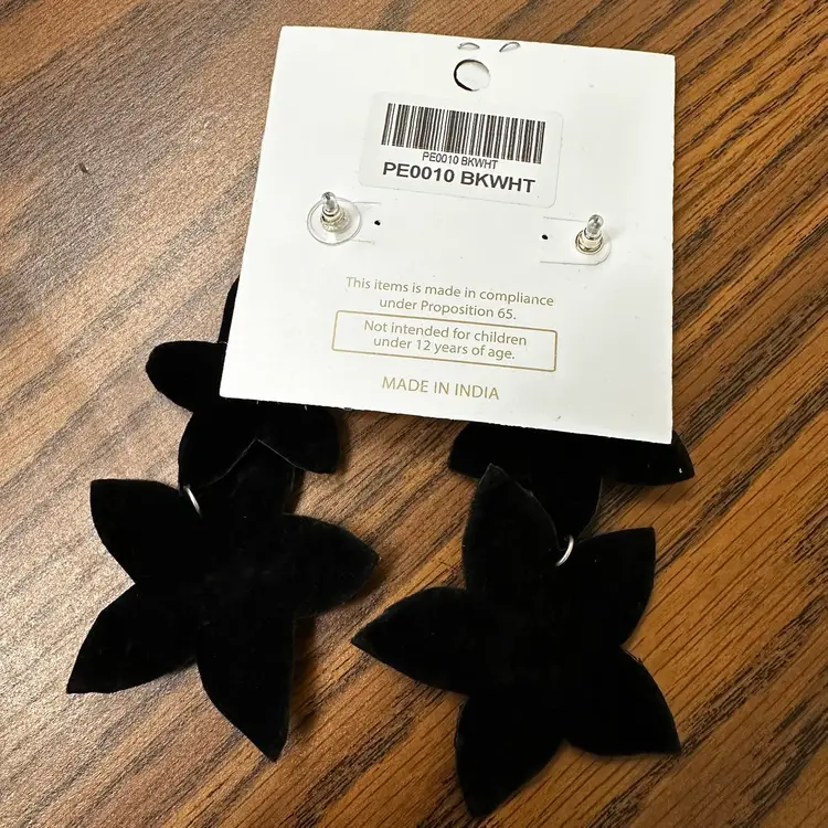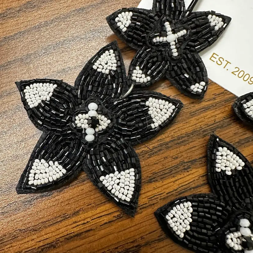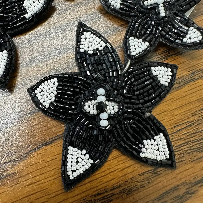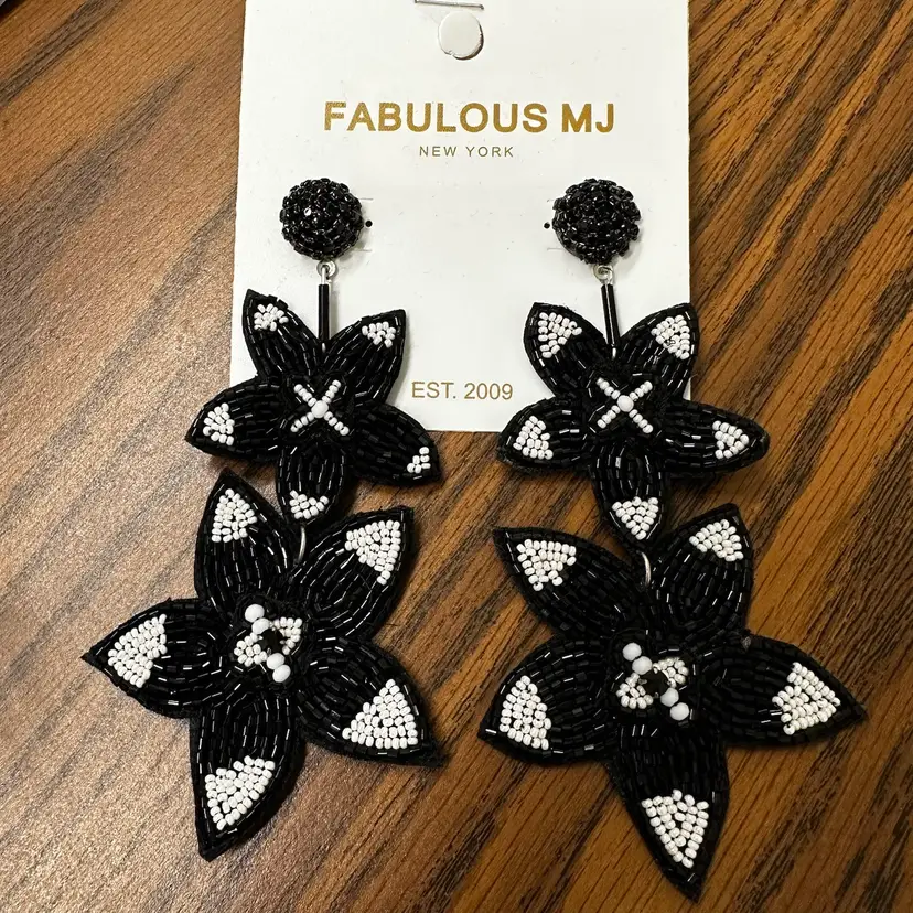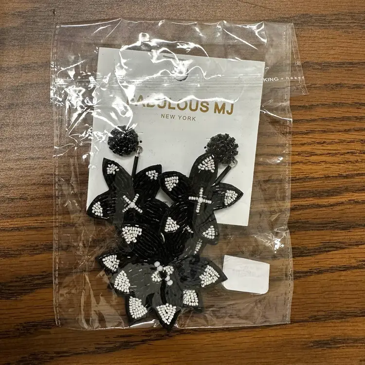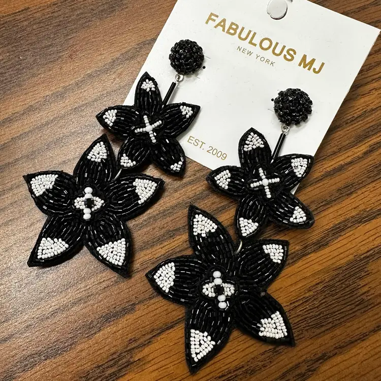 Fabulous MJ Black and White Beaded Floral Earrings. 4” long. Felt backing.