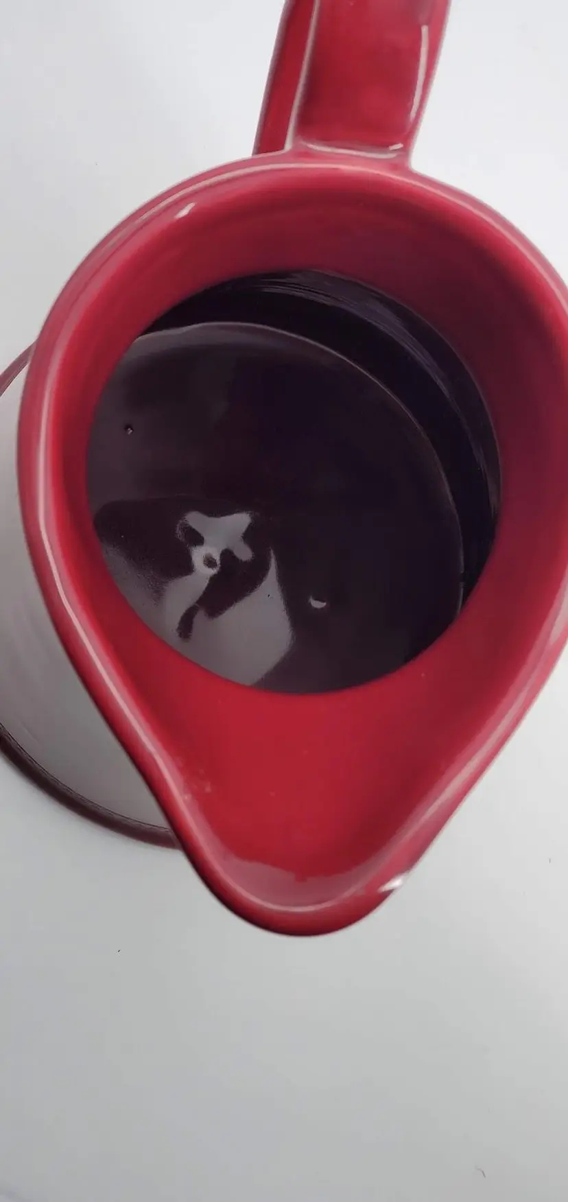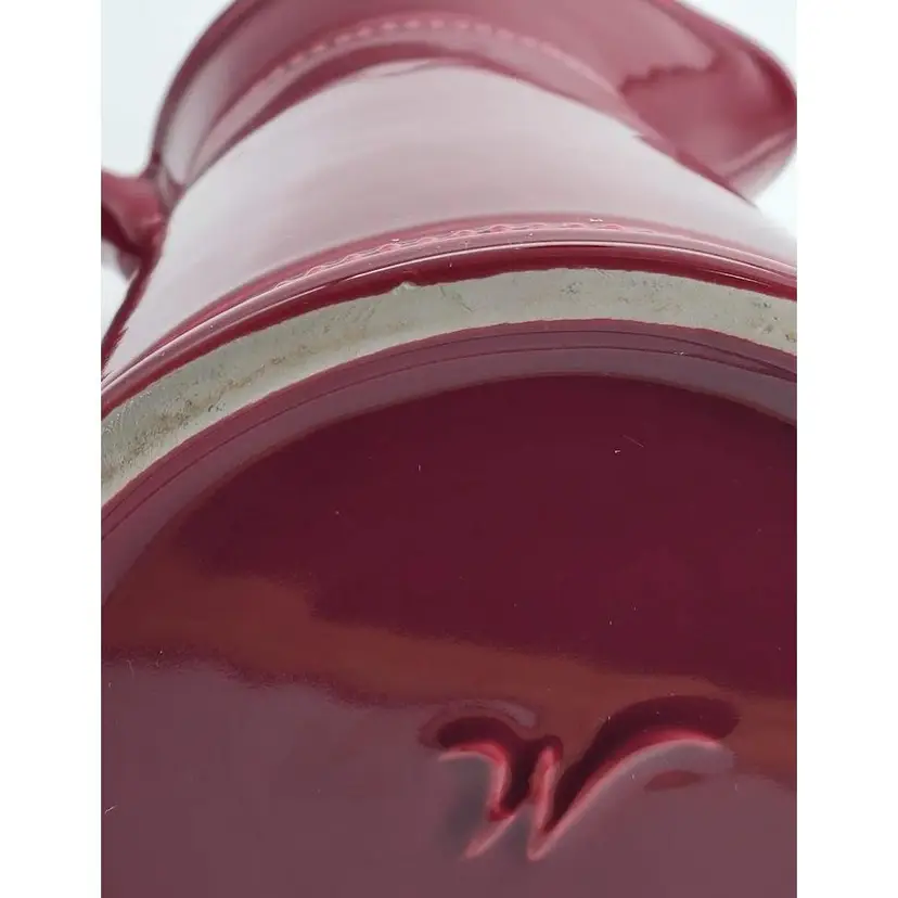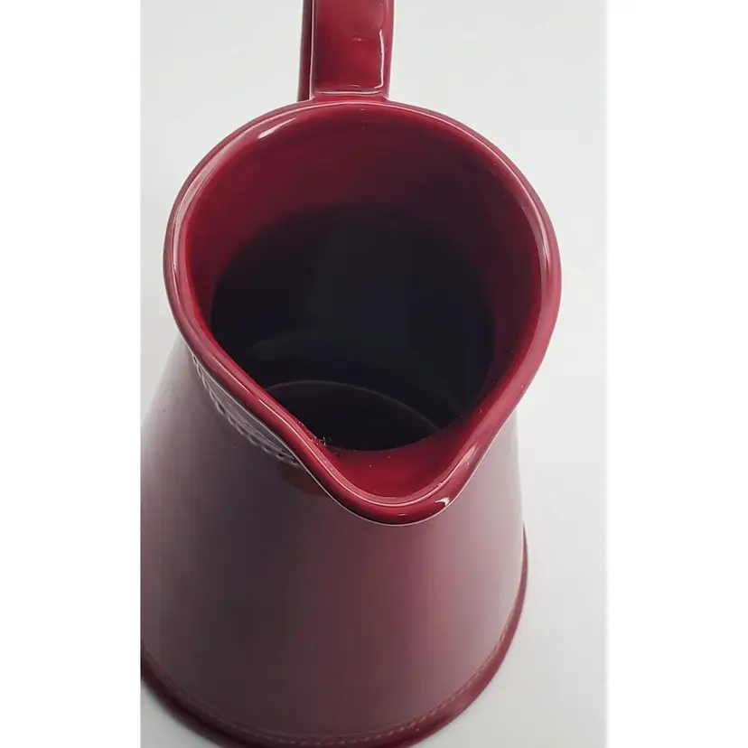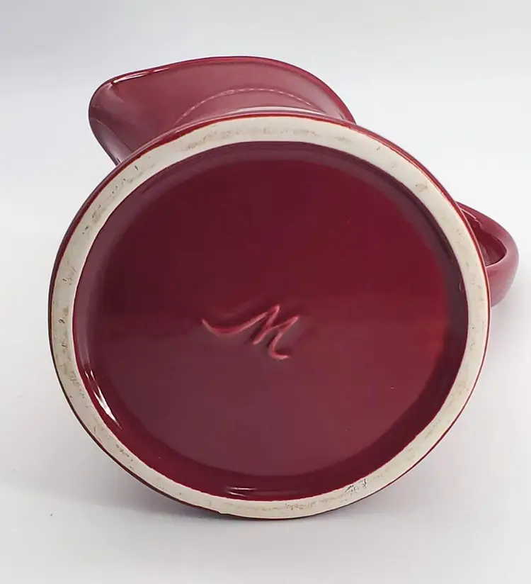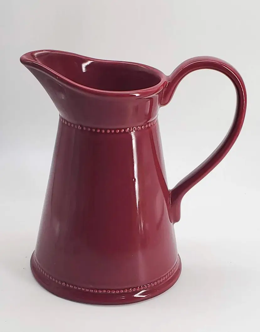 This gorgeous maroon pitcher by Martha Stewart is in almost perfect condition. It has one tiny fleabite on the underside on the bottom. It has nice beaded detailing under the spout and around the base. Just a beautiful piece in a great color! Perfect for pouring your favorite beverage or for holding flowers!