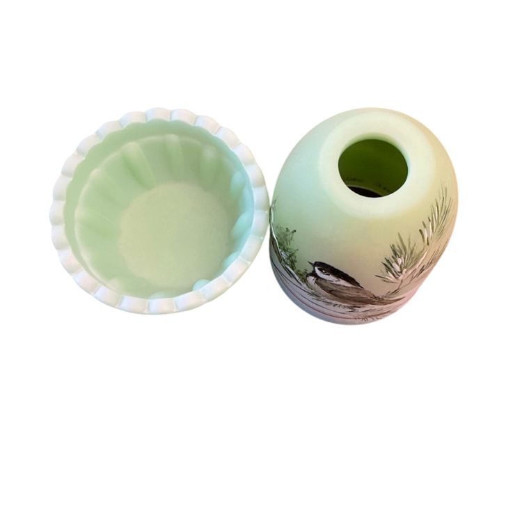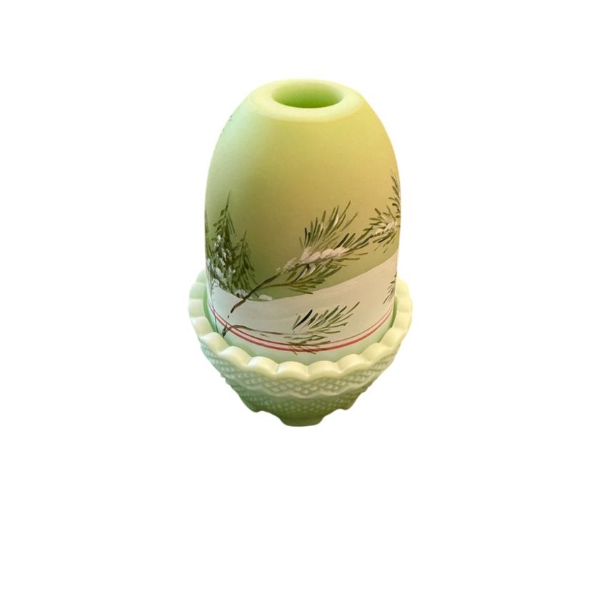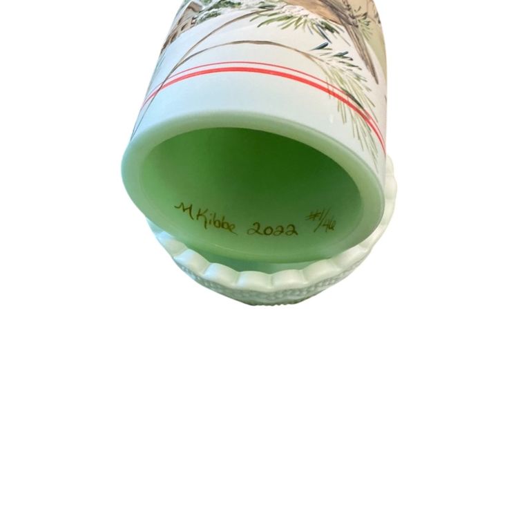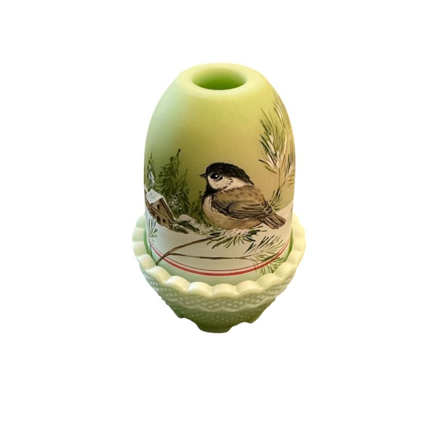 Adorable hand painted by M Kibbe in 2022 this fairy lamps was pressed by Mosser. The jade satin glass depicts a Chickadee winter scene. 5” by3 1/2.” No glow.