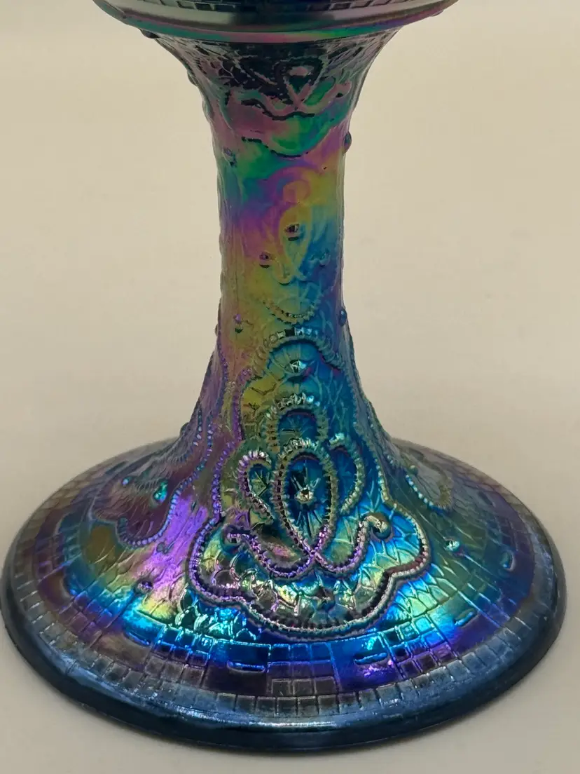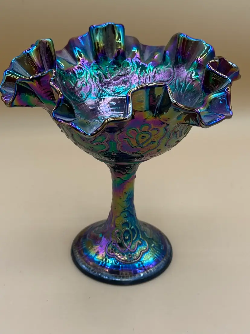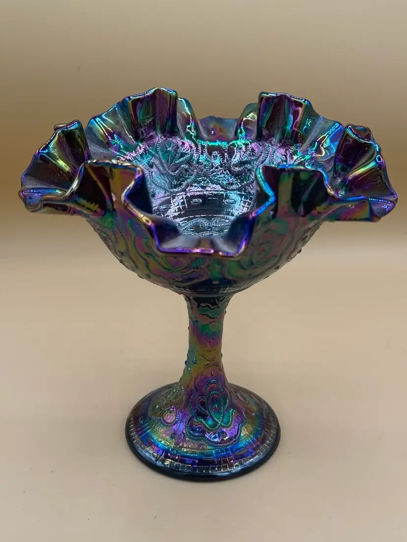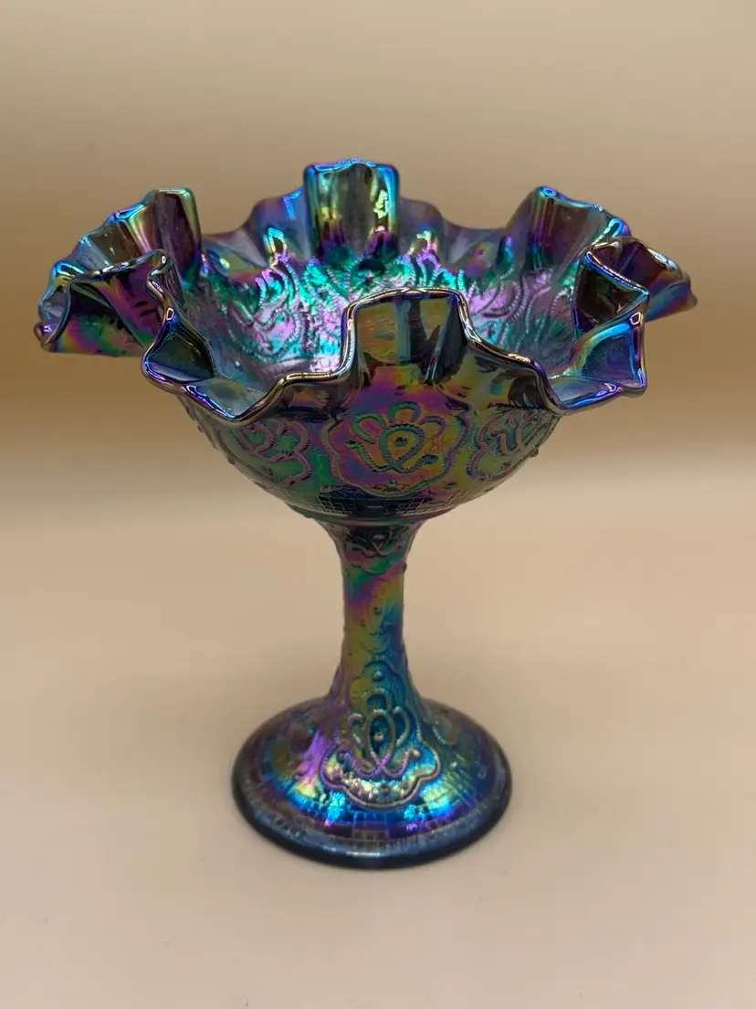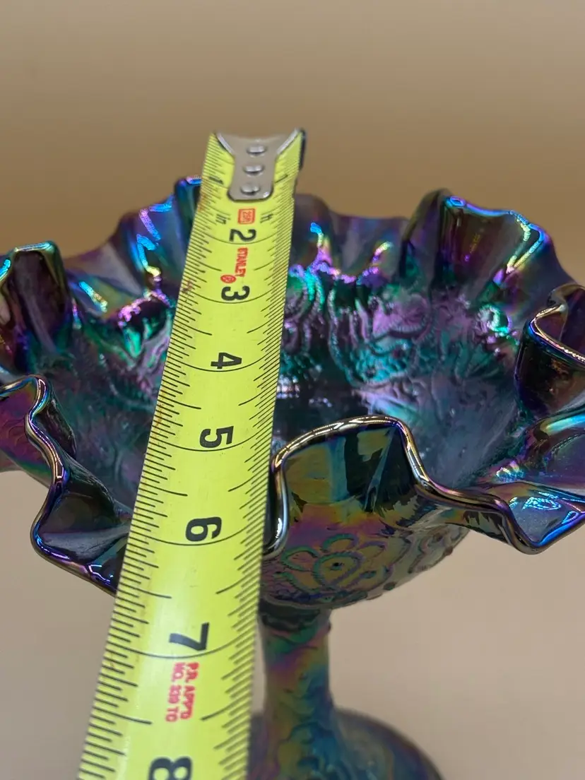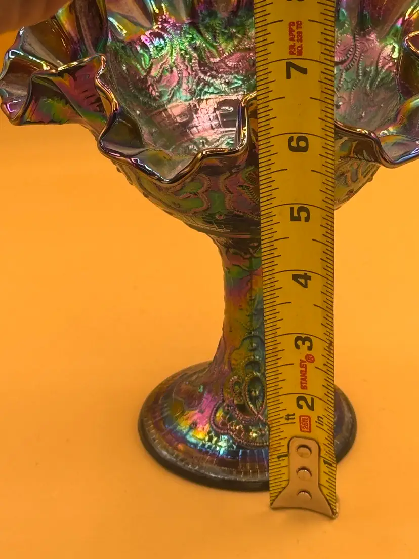 BEAUTIFUL iridescent carnival glass compote with Fenton signature. The depth of iridescence is amazing in this piece. It measures 6.5” tall and 6.25” diameter at the top.
