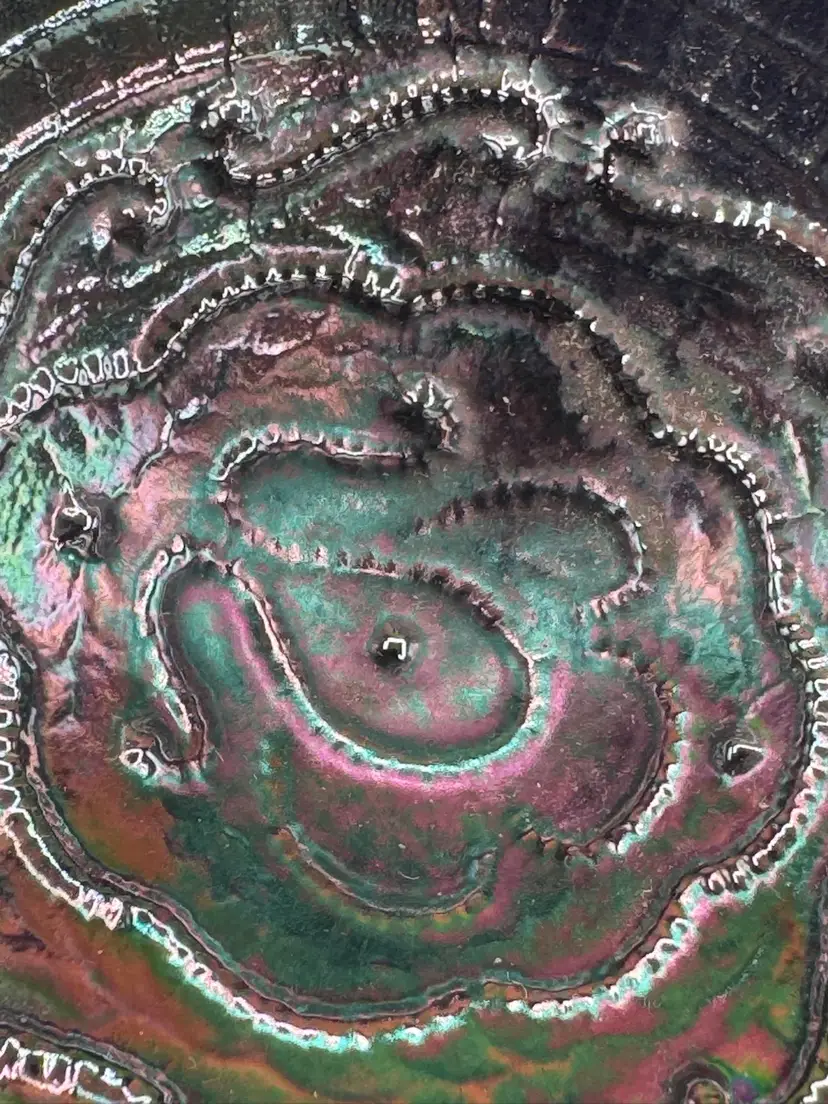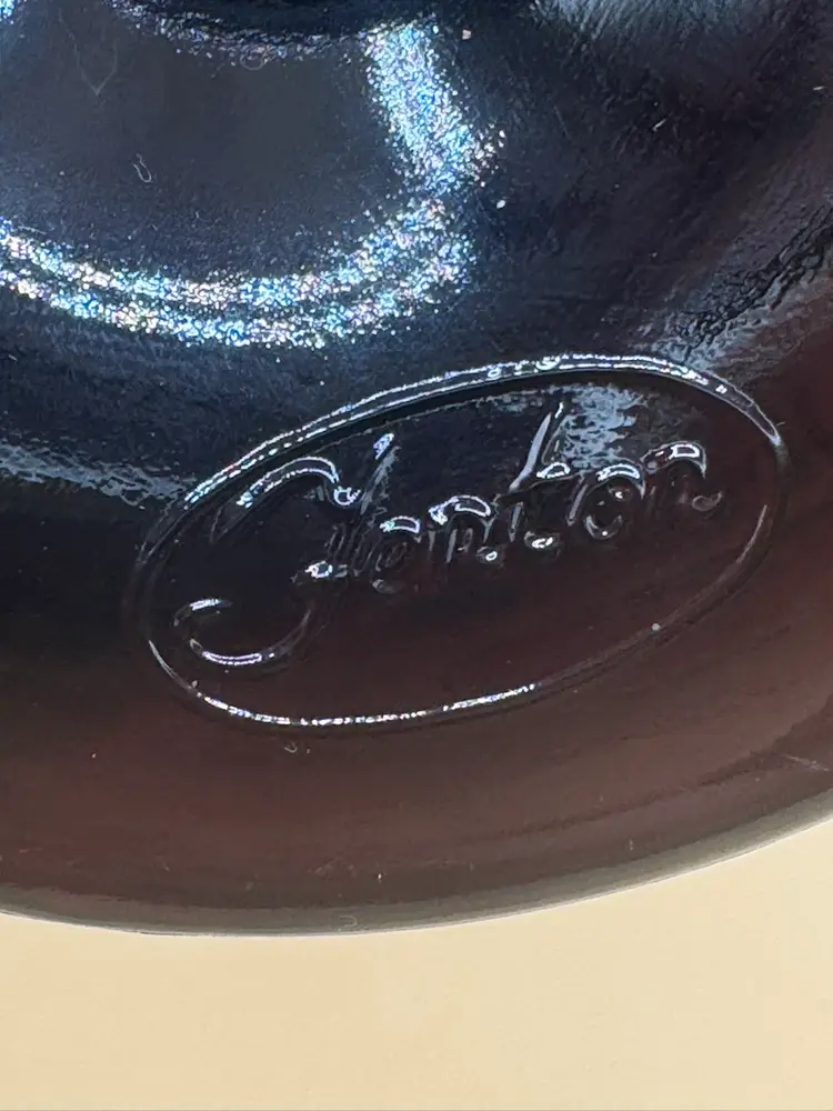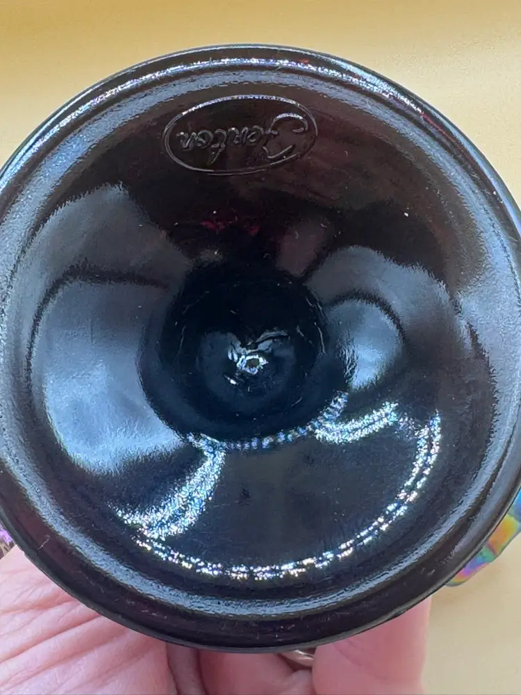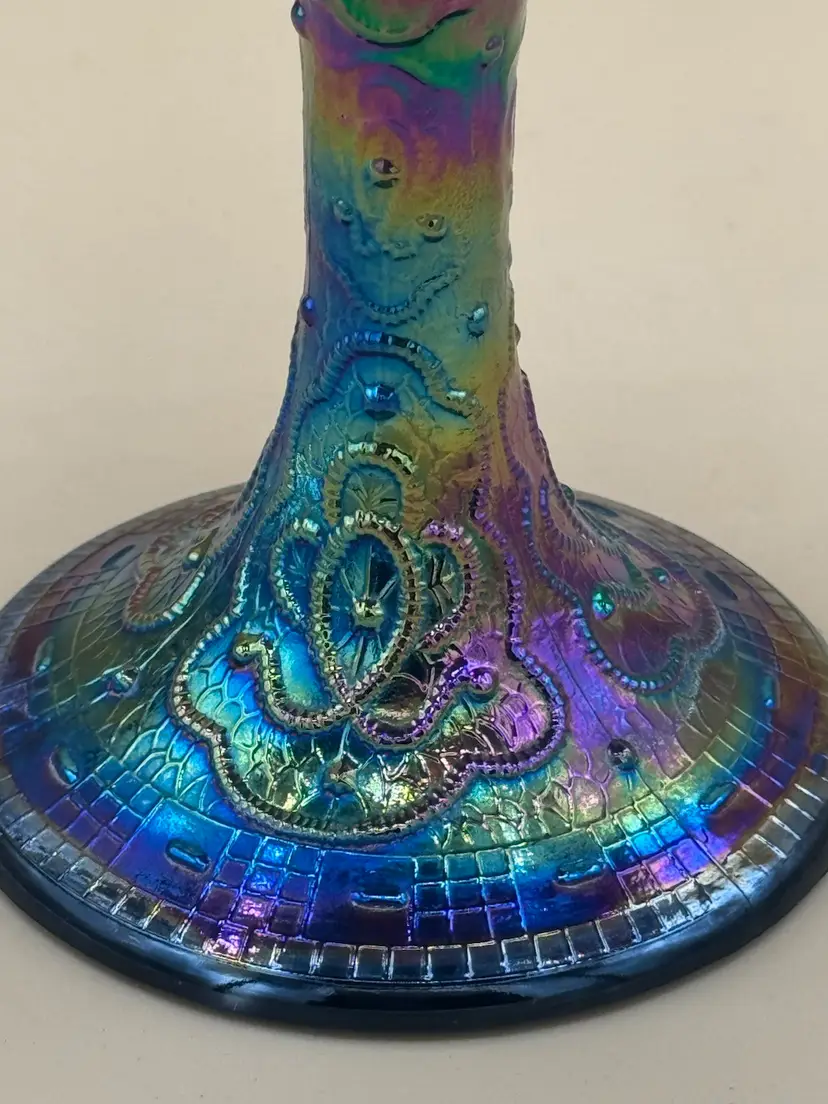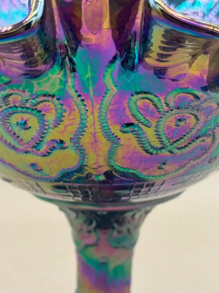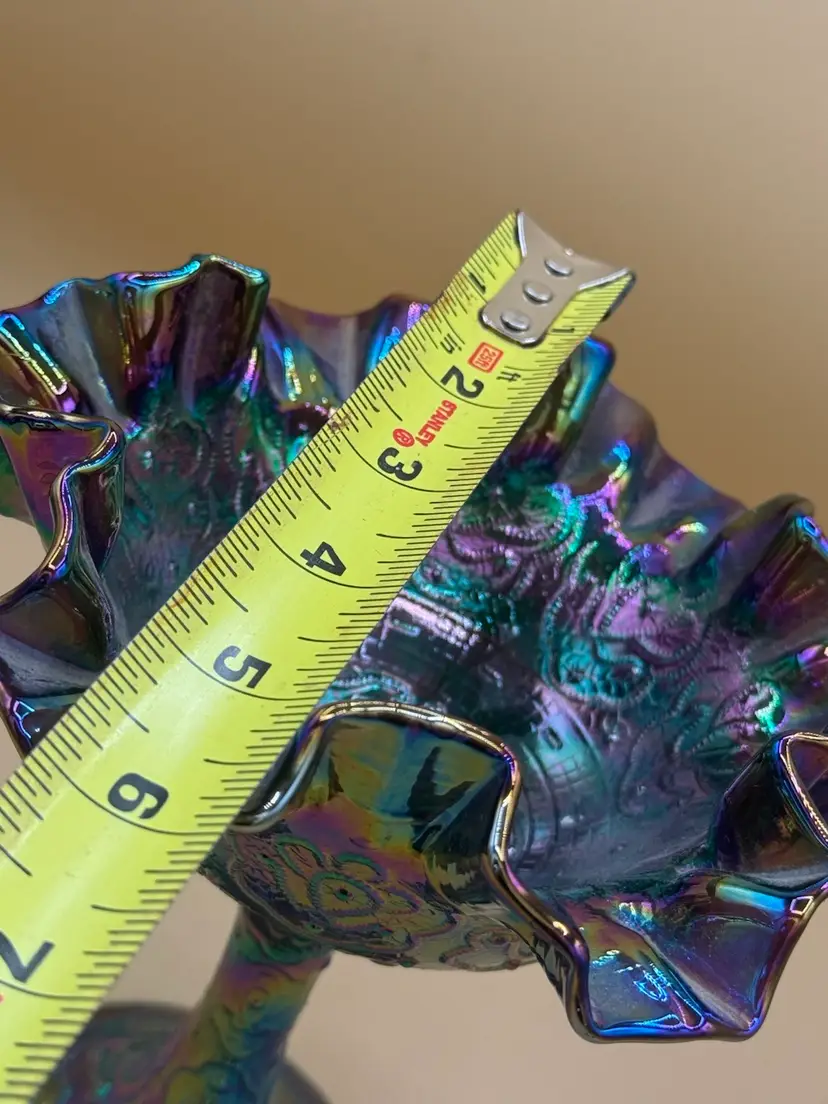 BEAUTIFUL iridescent carnival glass compote with Fenton signature. The depth of iridescence is amazing in this piece. It measures 6.5” tall and 6.25” diameter at the top.