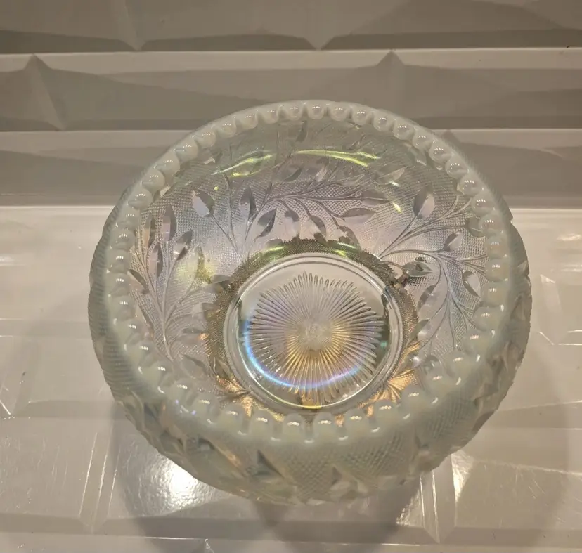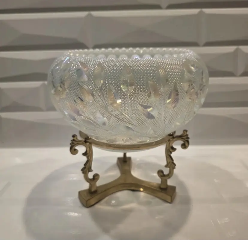 FENTON Art Glass White Iridescent Carved Florals Leaves Bowl Vase On Brass Stand