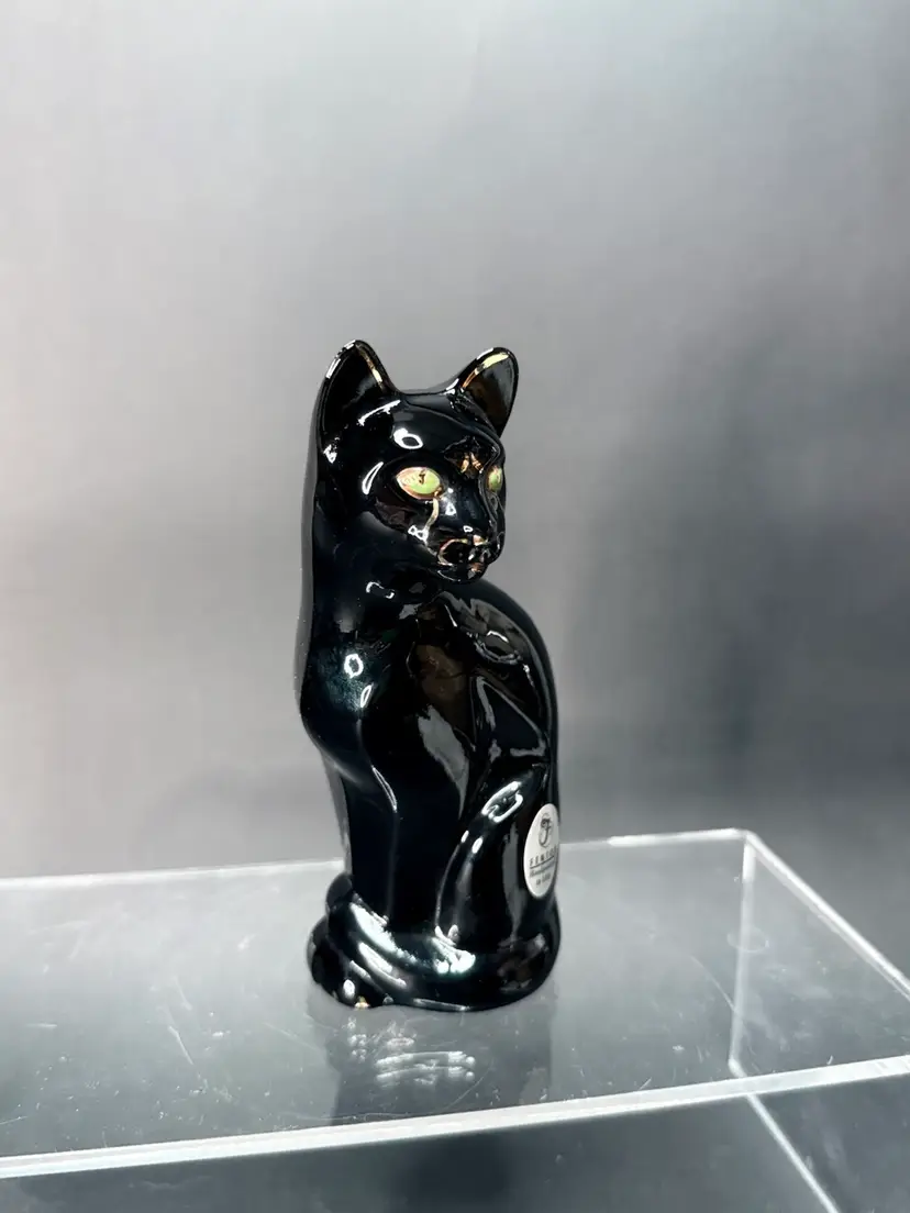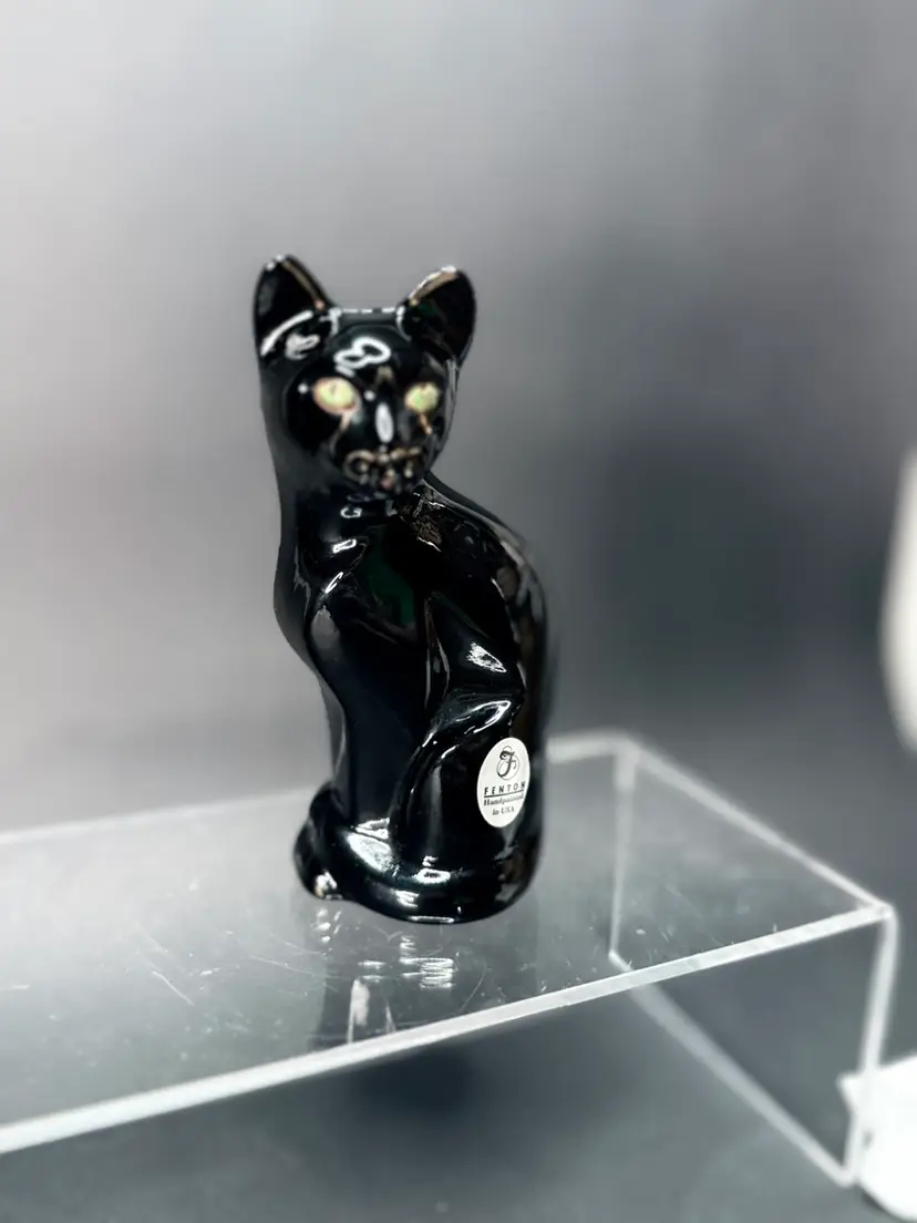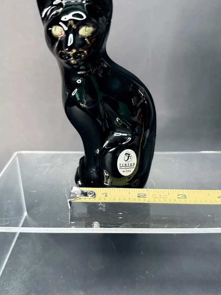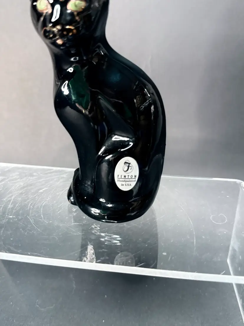 The FENTON Black Panther Leopard Stylized Cat 5065 handpainted figurine is a stunning piece of art glass crafted in the USA by Fenton. This unique figurine features a black panther pattern with a glossy finish, making it a standout decorative item for any home. The handpainted details and signature by J Owens add a personalized touch to this exquisite piece, making it a one-of-a-kind collectible for cat and art glass enthusiasts alike.