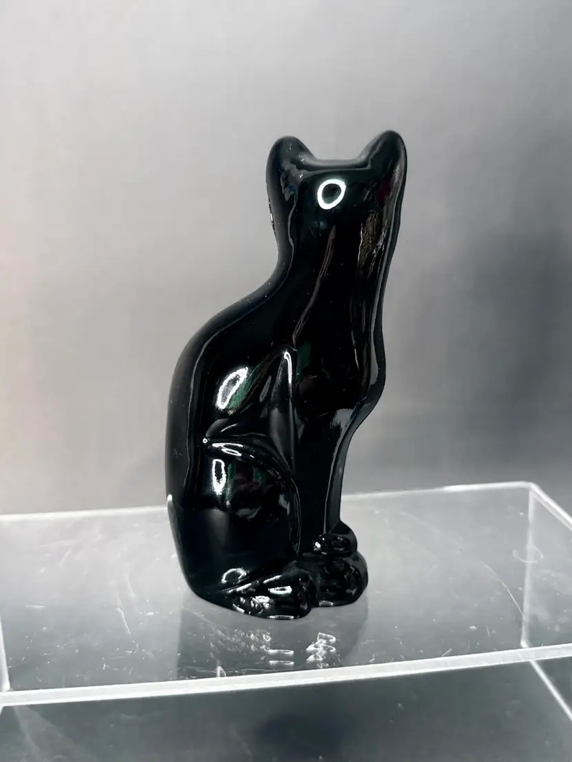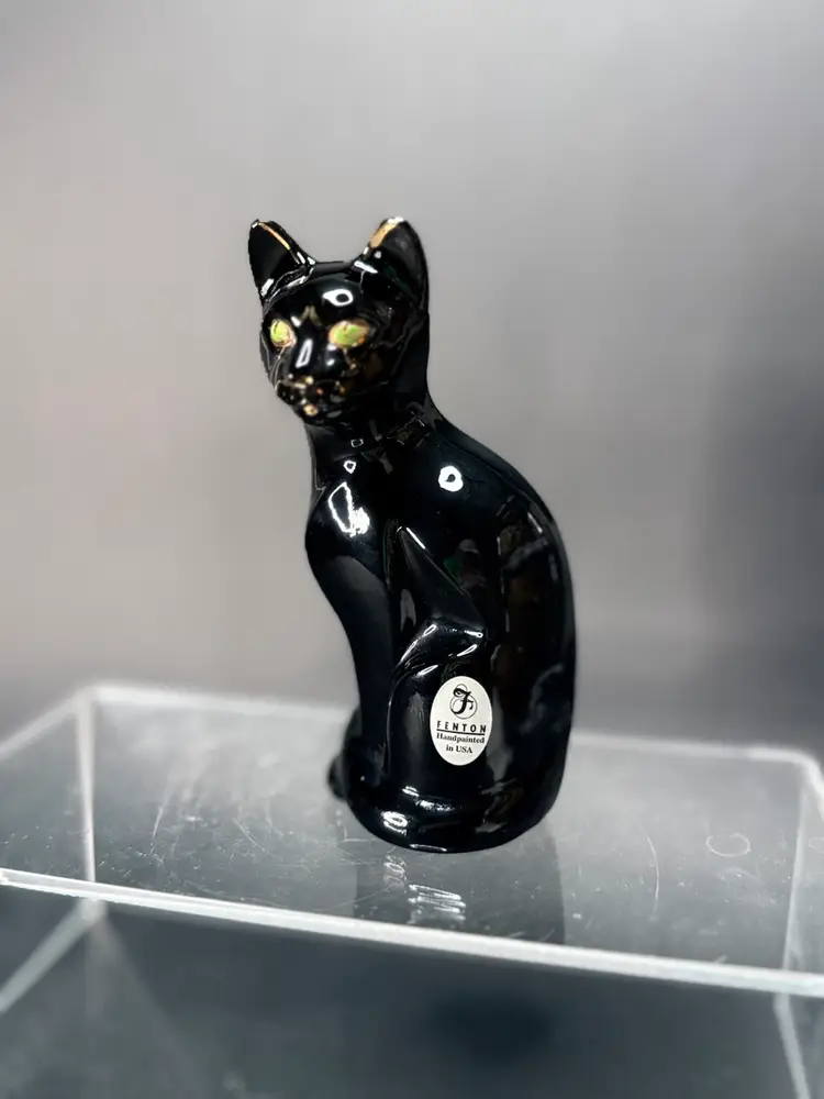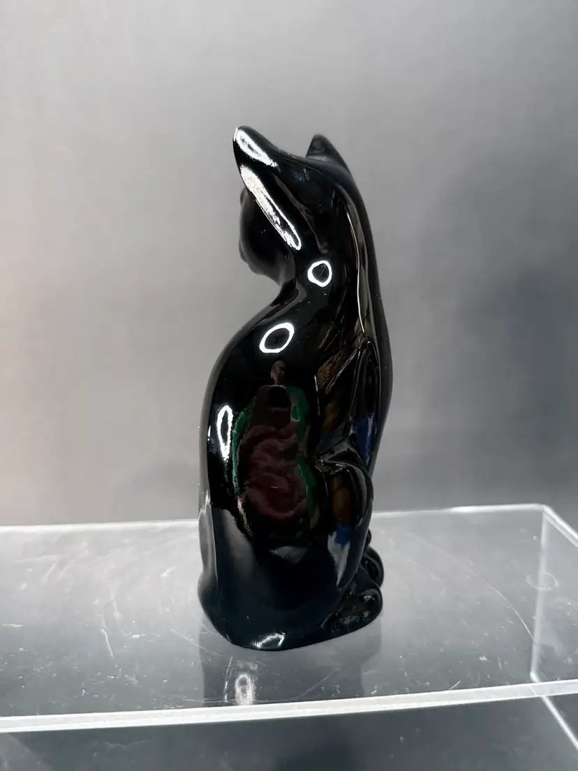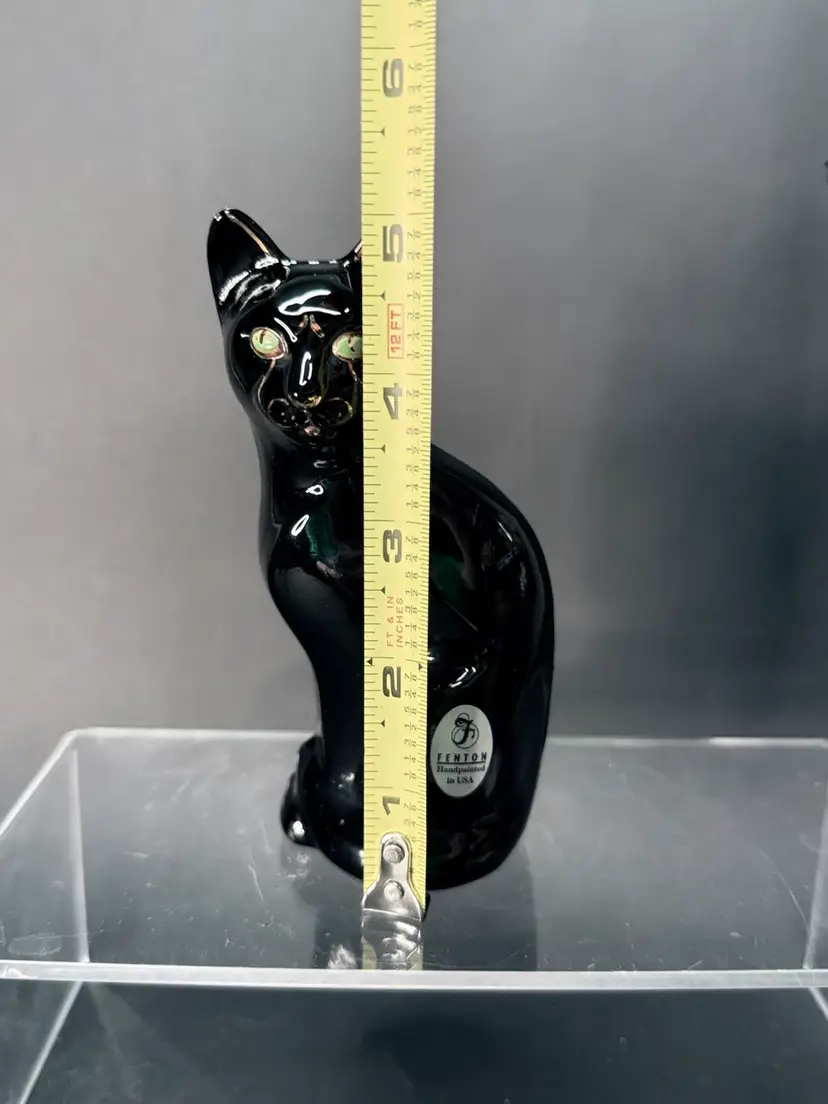 The FENTON Black Panther Leopard Stylized Cat 5065 handpainted figurine is a stunning piece of art glass crafted in the USA by Fenton. This unique figurine features a black panther pattern with a glossy finish, making it a standout decorative item for any home. The handpainted details and signature by J Owens add a personalized touch to this exquisite piece, making it a one-of-a-kind collectible for cat and art glass enthusiasts alike.