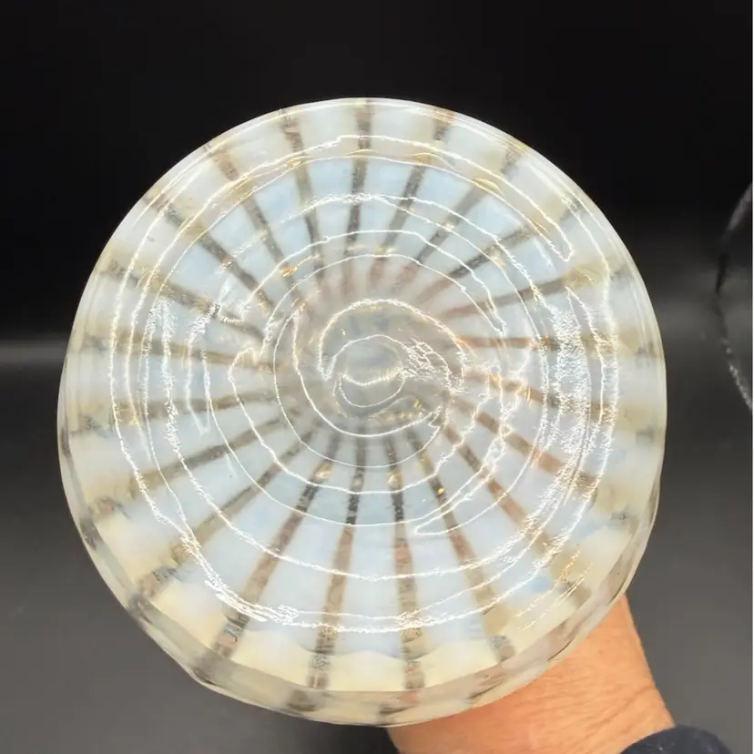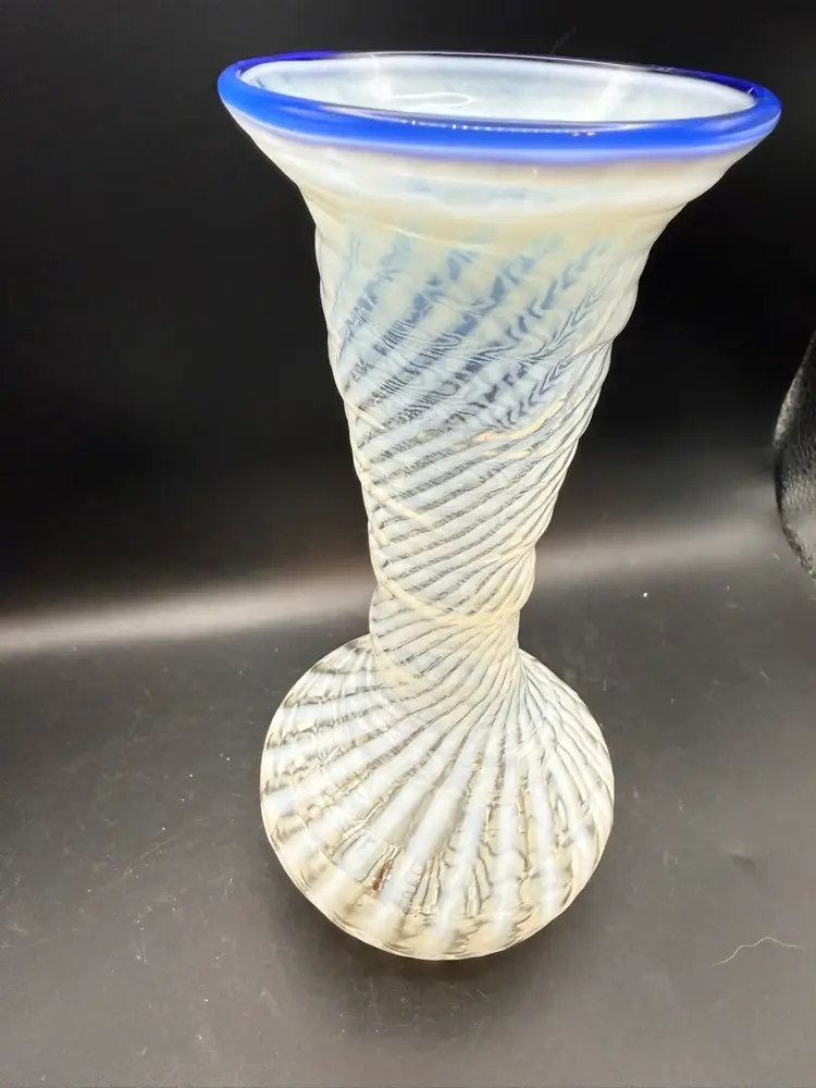 This is a Rare Fenton Blue Ridge Crest Vase with a white swirled design and ruffled cobalt edge. It features a French Opalescent, spiral optic pattern. The vase was hand-blown in 1939 and was only made that year.