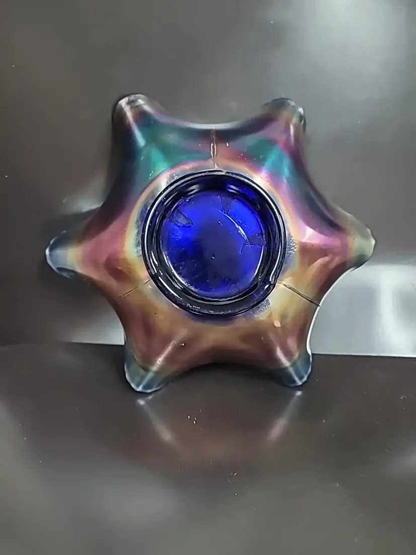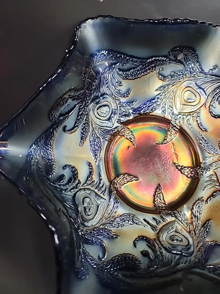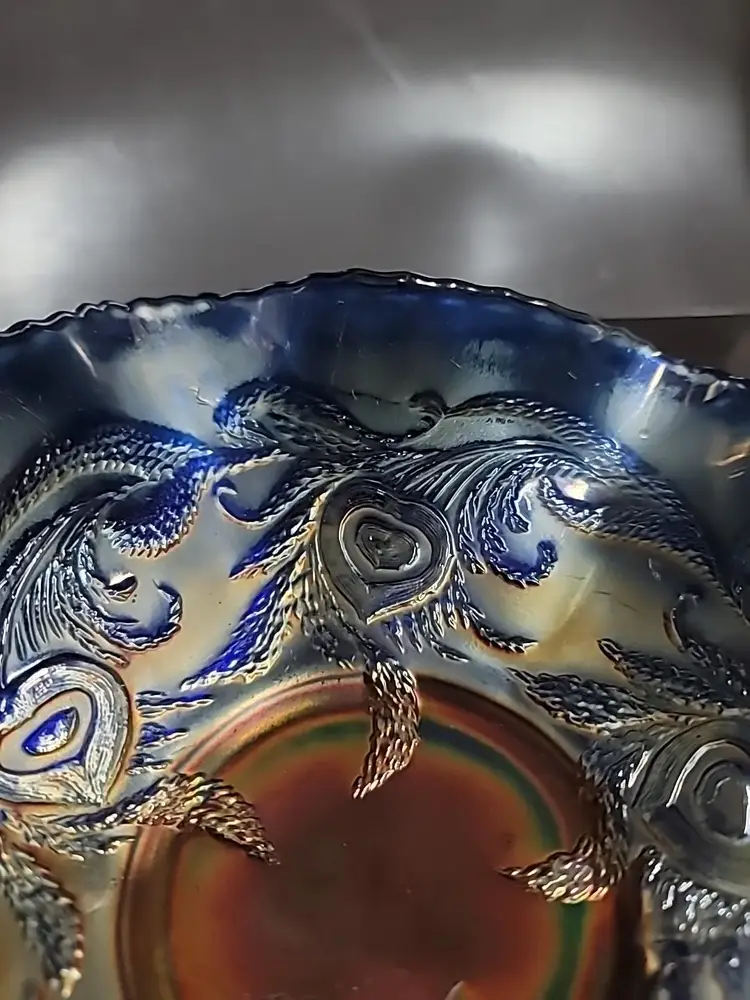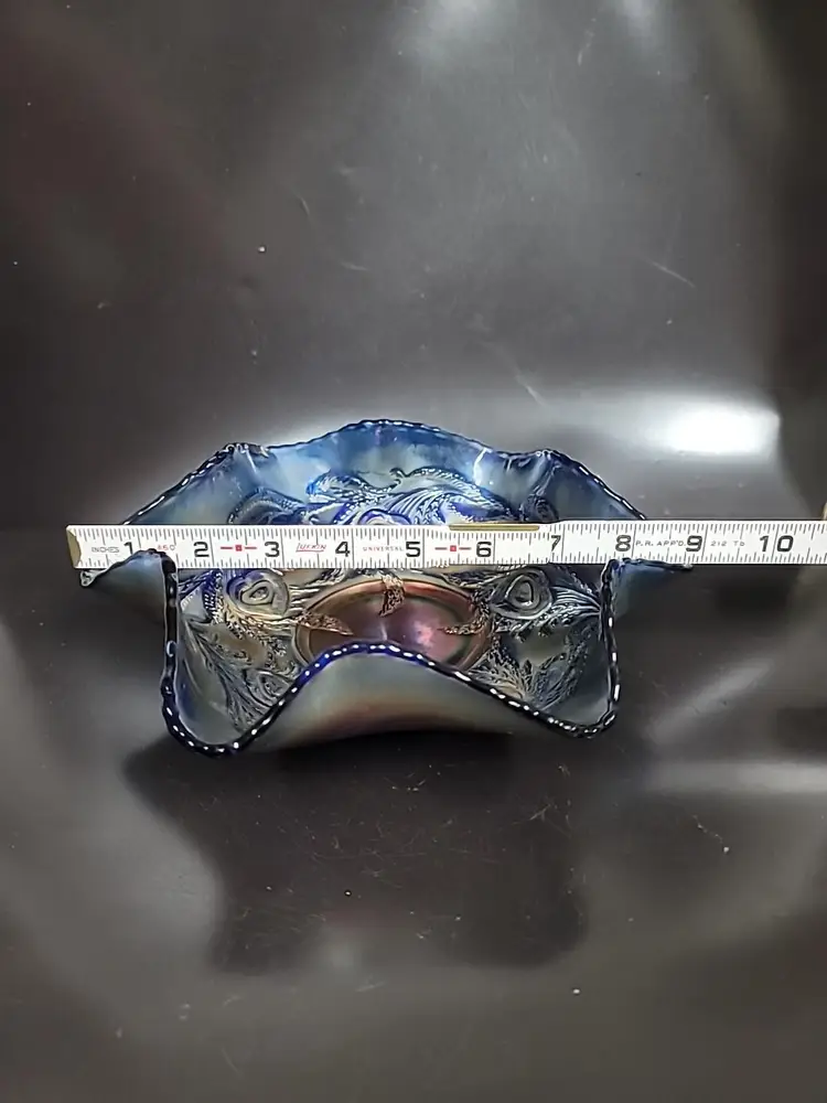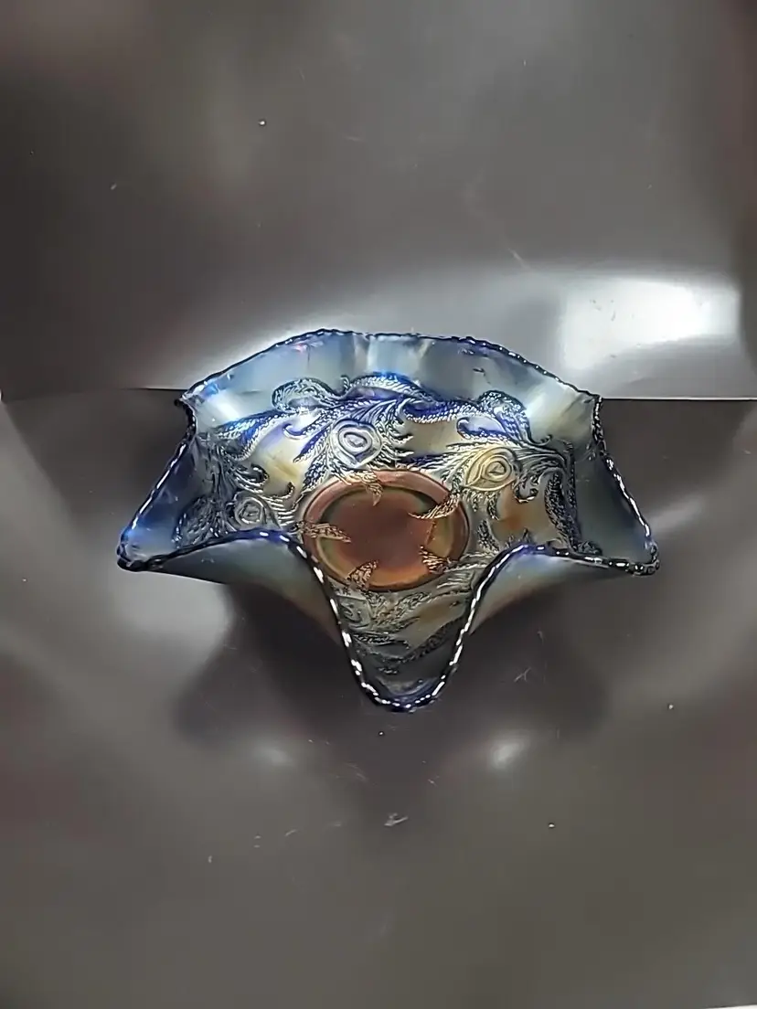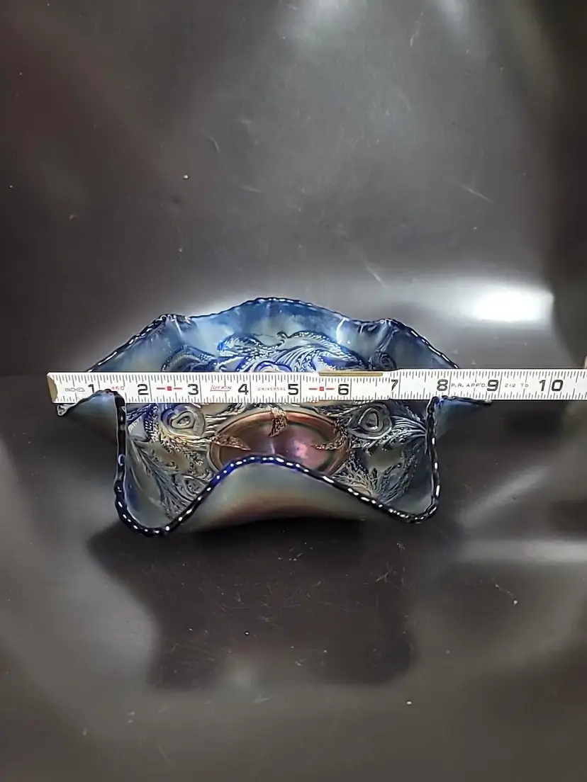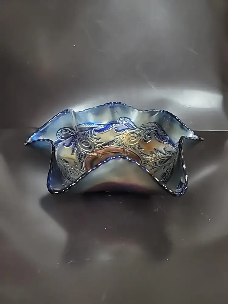 Gorgeous Fenton carnival glass bowl with a ruffled edge. Heart and vine pattern very good condition, no chips or cracks. Some color loss on edges, see pictures. It measures approximately 9" x 3"