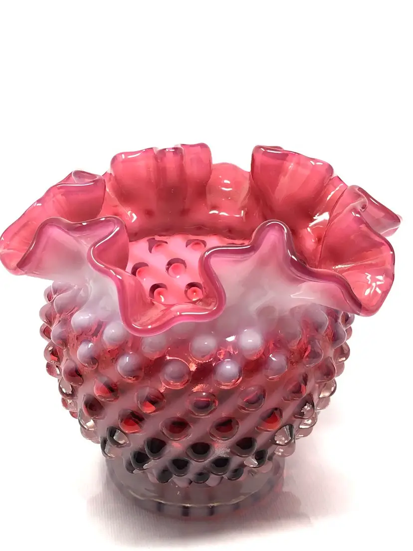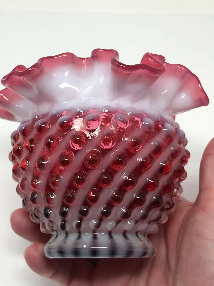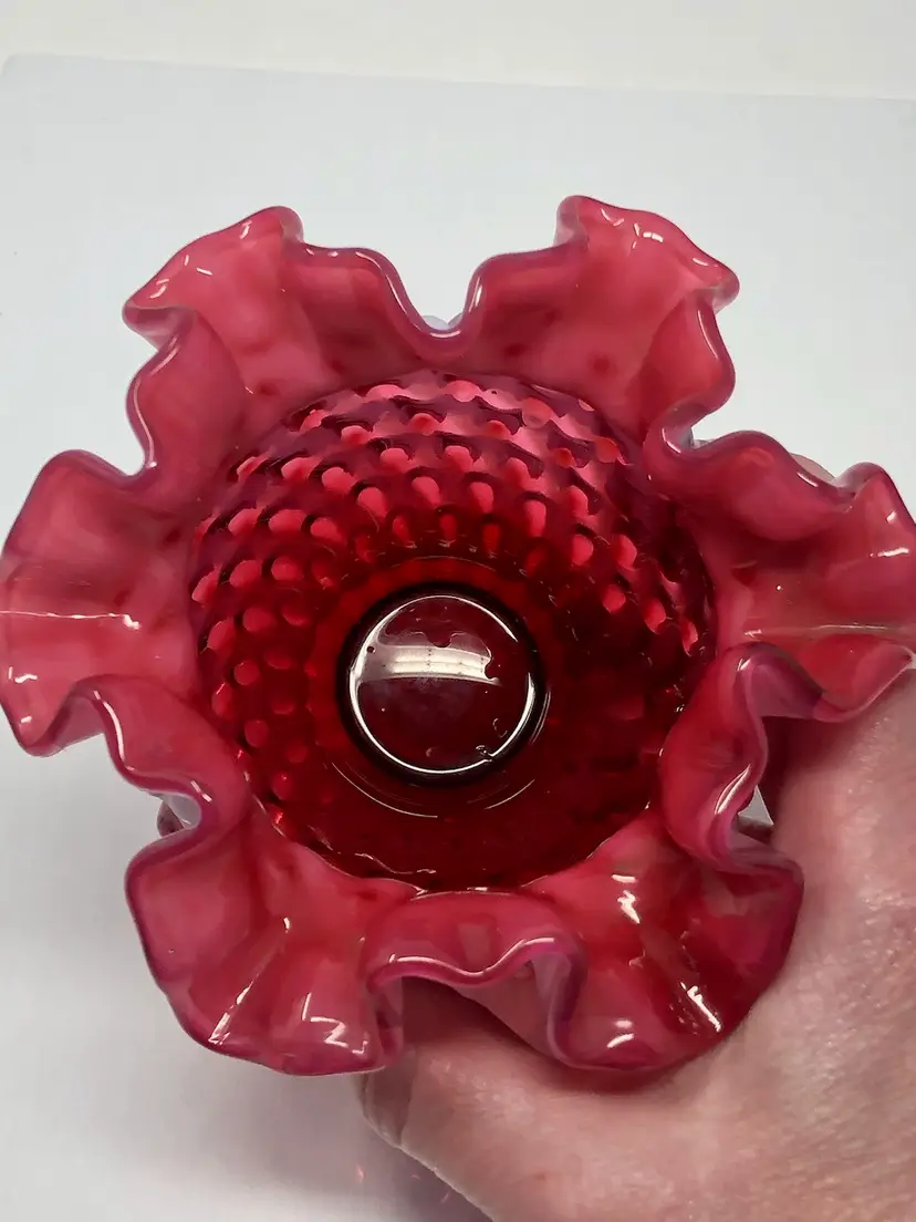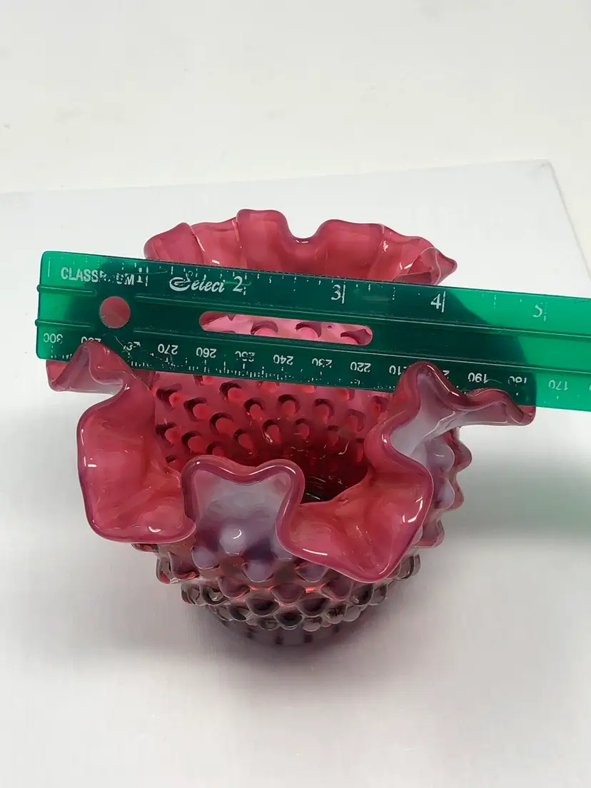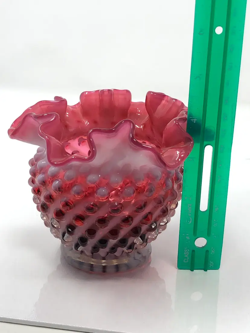 Dark cranberry round vase with a band of white stands about 4" tall and the ruffles make the top about 5" across. Marked with the Fenton oval on the clear base with a number 8 underneath. No chips or cracks.
