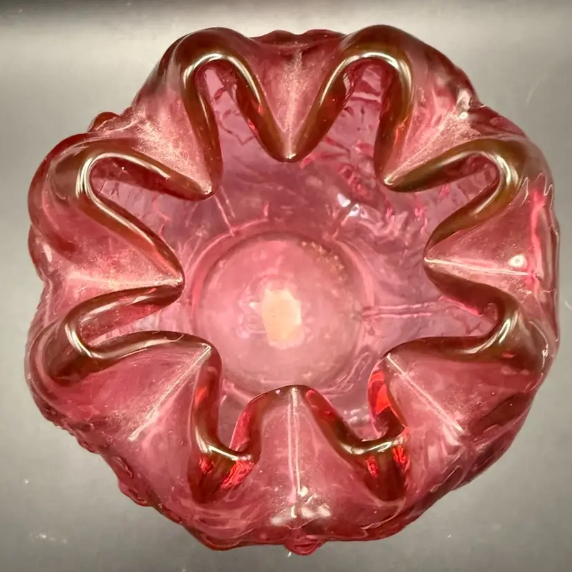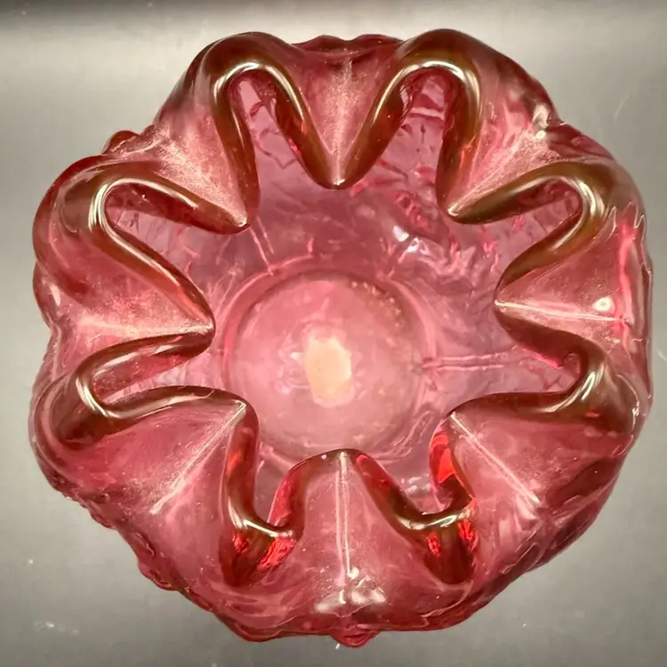 Cranberry glass gets its distinctive red color from the addition of gold chloride to the molten glass. The ruffled rim and raised poppy design are characteristic of Fenton's style. Given its vintage and the popularity of Fenton glass, this vase would be a nice addition to any collection.
