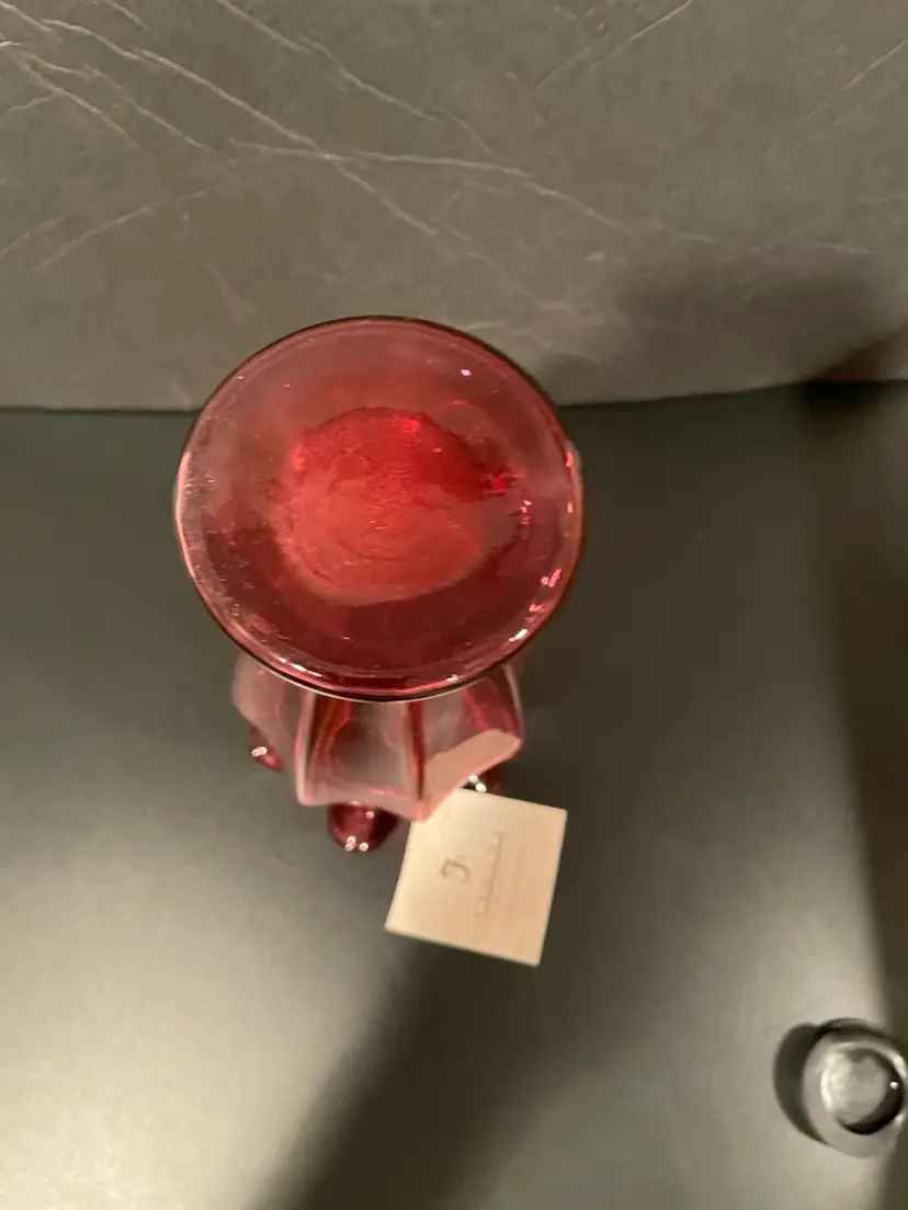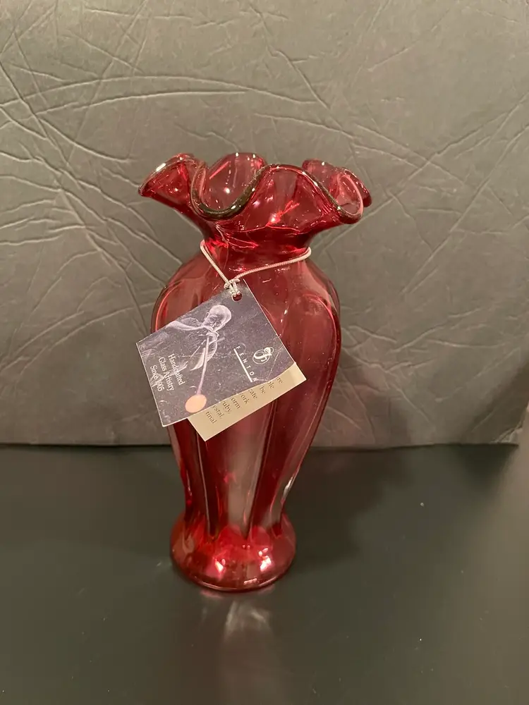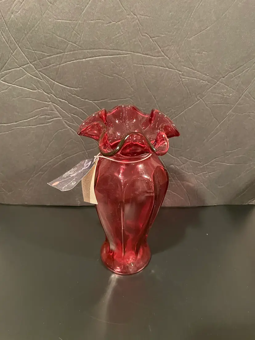 Fenton cranberry ruffled vase with tags no call outs 12” tall