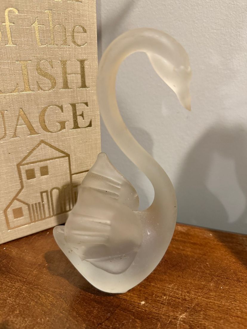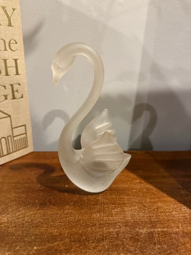 Vintage Fenton Frosted Glass Swan Figurine, 4 inches tall – a beautiful piece for collectors or as an elegant accent. This frosted glass swan from Fenton is a classic decorative item, perfect for display on shelves, mantels, or as part of a centerpiece. The frosted clear glass gives it a soft, ethereal appearance, highlighting its graceful curves. Excellent pre-owned condition. No chips or cracks.