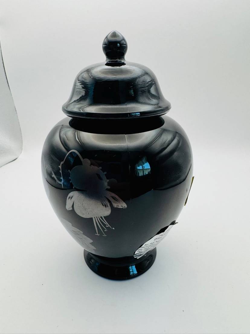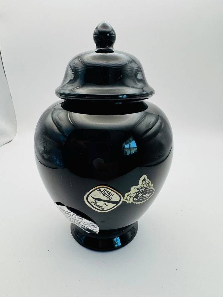Beautiful Hand Painted Floral in Silver Over Black Ginger Jar. Fenton Mark, Stickers and Signature still Intact.
