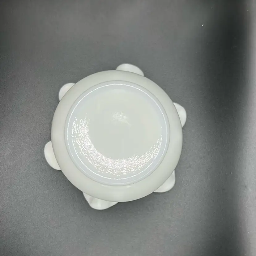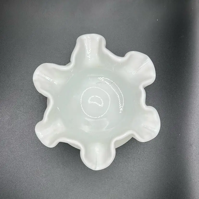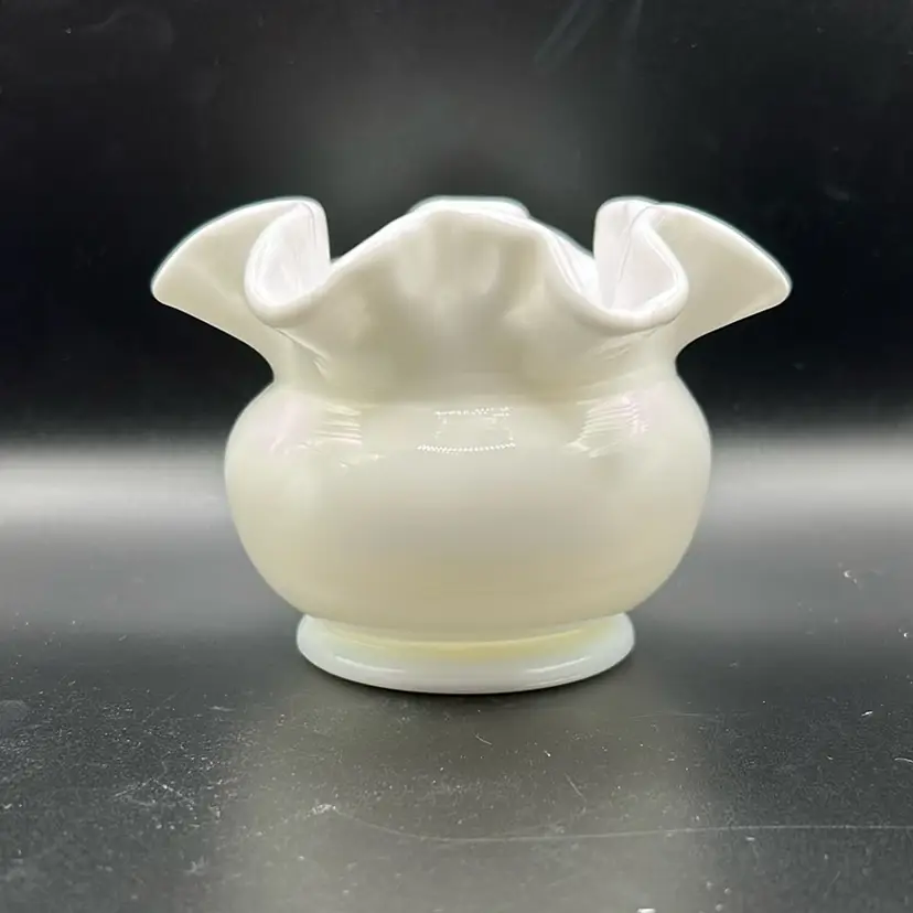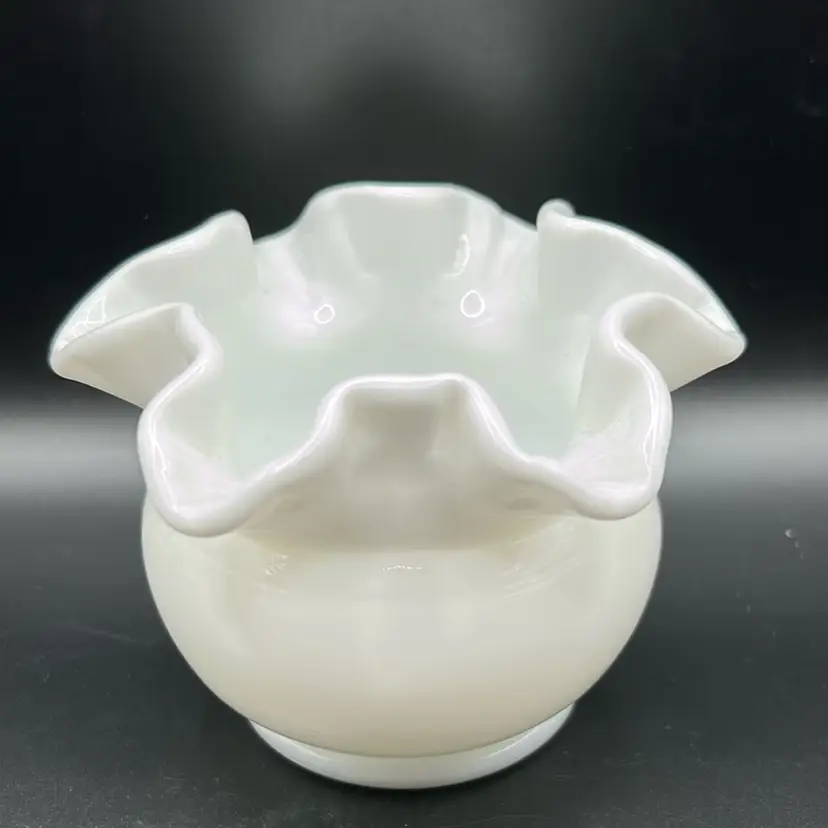 This piece is a vintage Fenton milk glass, small vase or bowl with a ruffle or cramped edge 3 inches tall and approximately 4 inches across there’s no damage no chips or cracks