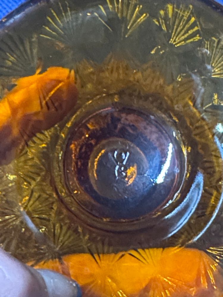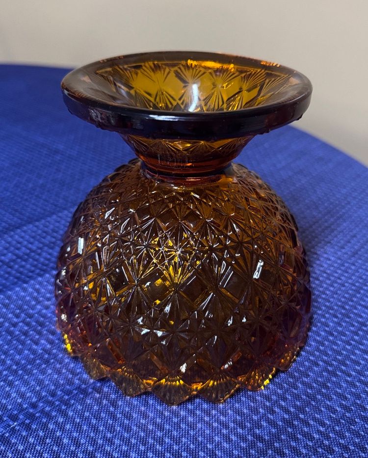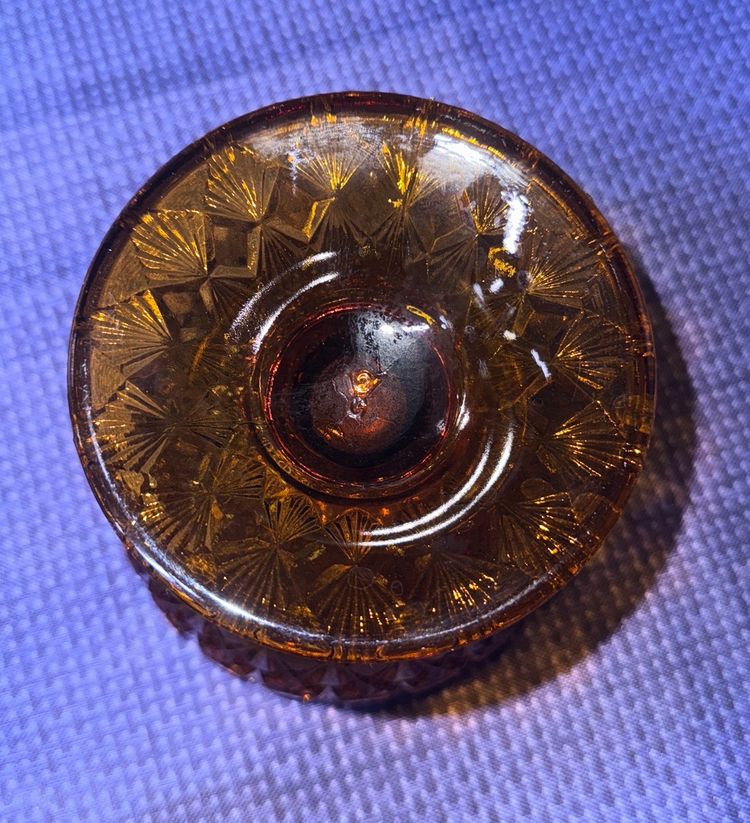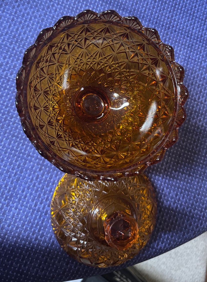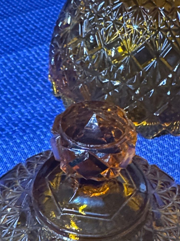 Fenton "Olde Virginia" amber glass covered candy dish Elegant amber glass candy dish with intricate diamond pattern. Comes with a matching lid. 9” tall with lid 5” without lid 5.5” diameter This style of candy dish was produced by Fenton Glass Company in the 1970s. It features a diamond fan pattern and a pedestal base Excellent condition with no breaks or chips the top handle feels a little rough on the edges but I don’t feel or see any chips (11381020258)