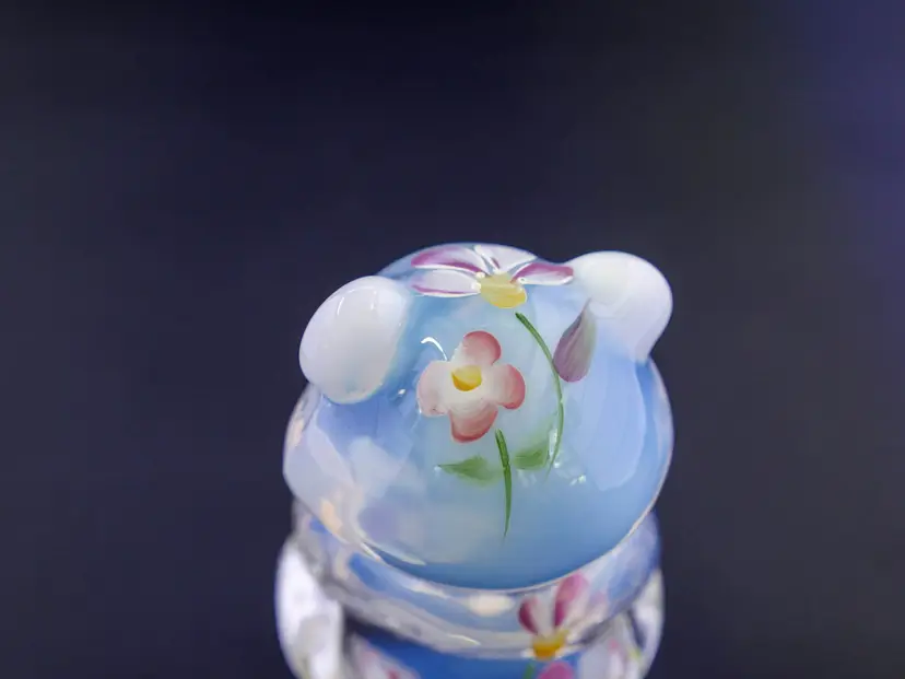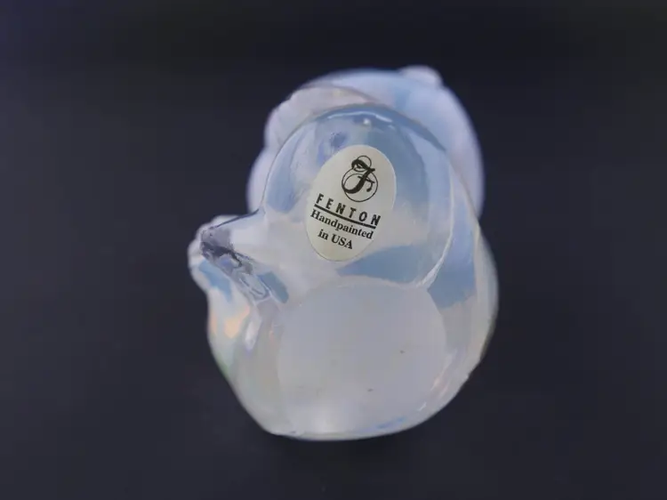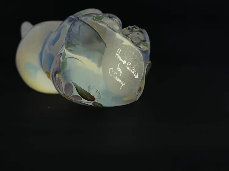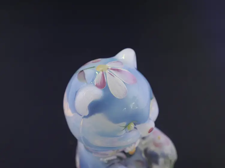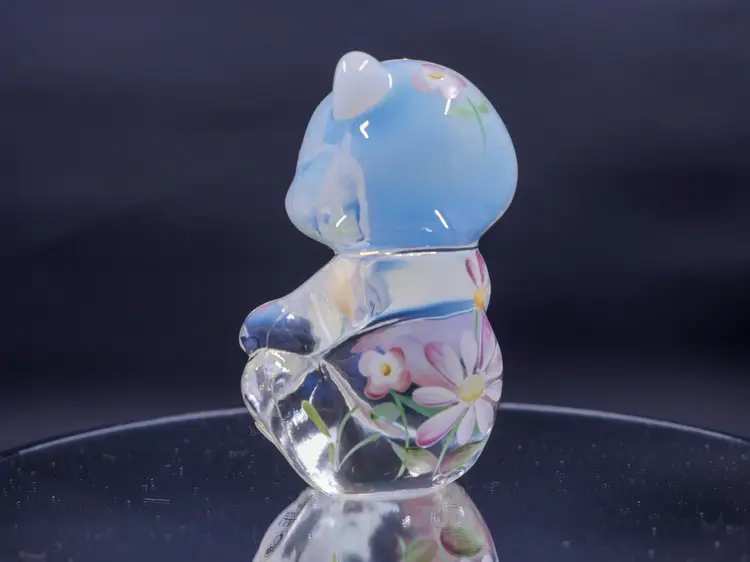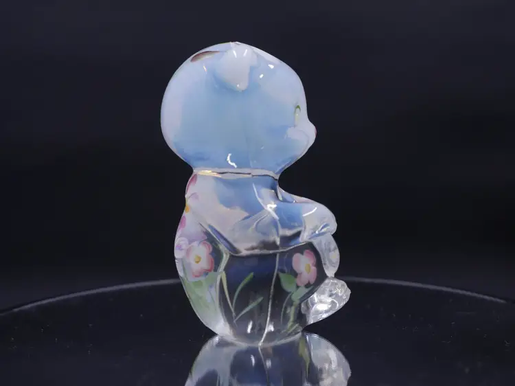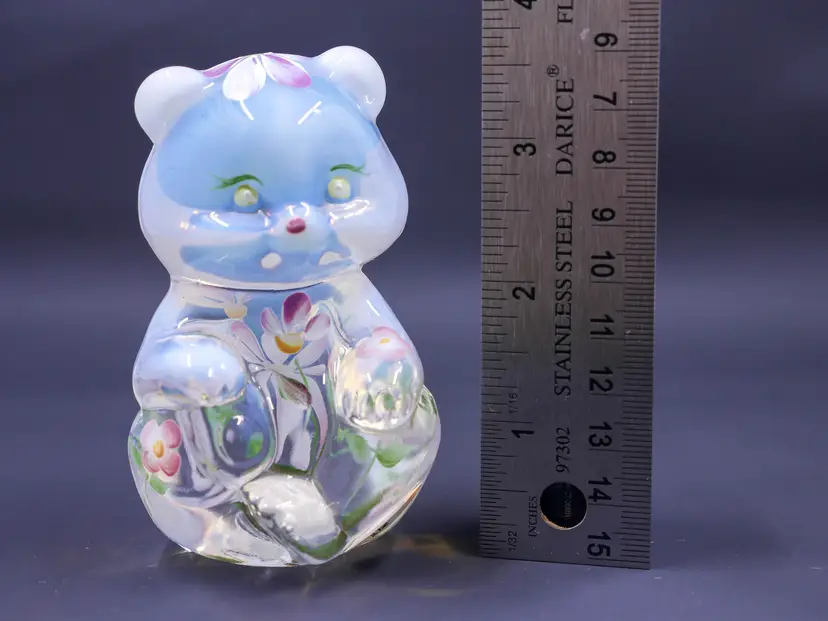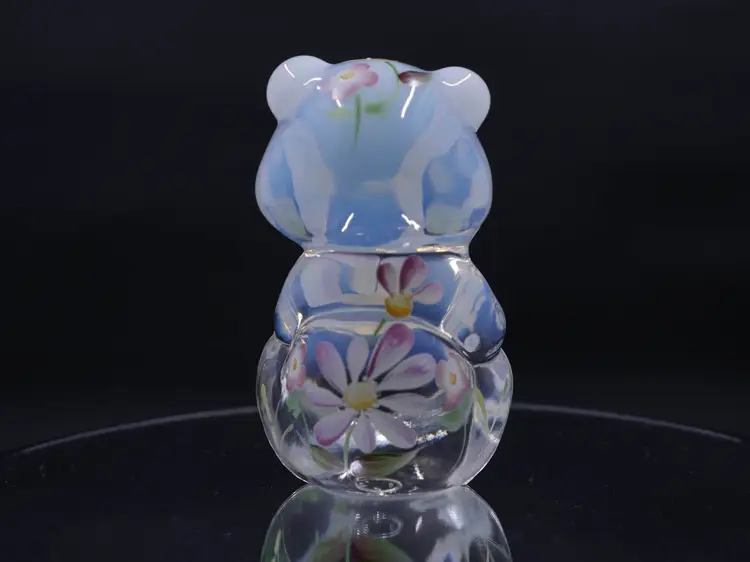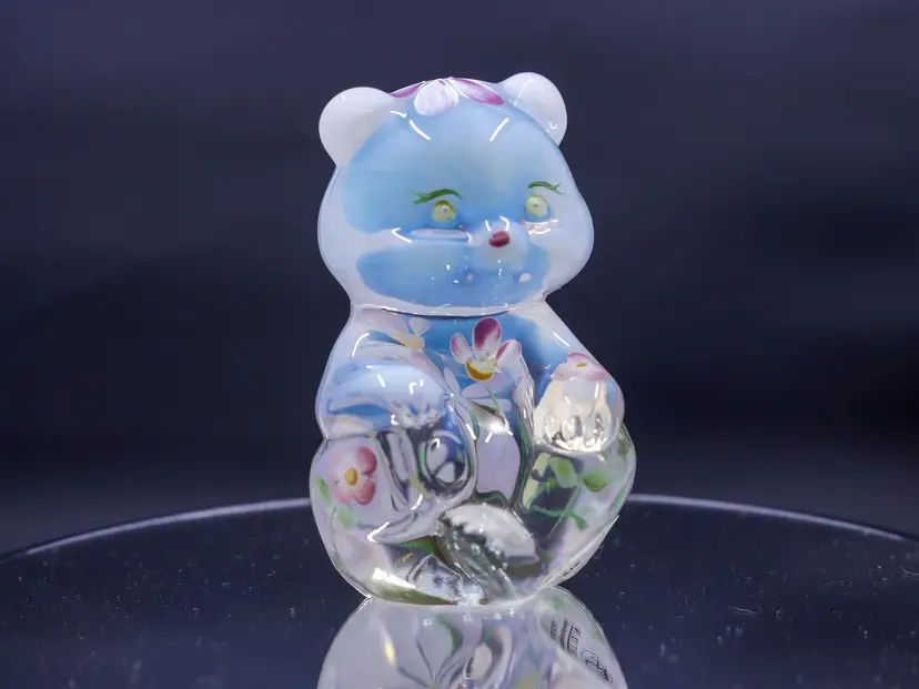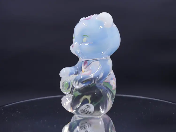 A 3.5" sitting Fenton opalescent bear figurine in excellent condition with hand-painting of delicate pink, white, and purple flowers with green leaves. The bear is in a sitting position with its paws together. It has its original label and stamp along with the signature on the bottom that reads, "Hand painted by C. Curry."