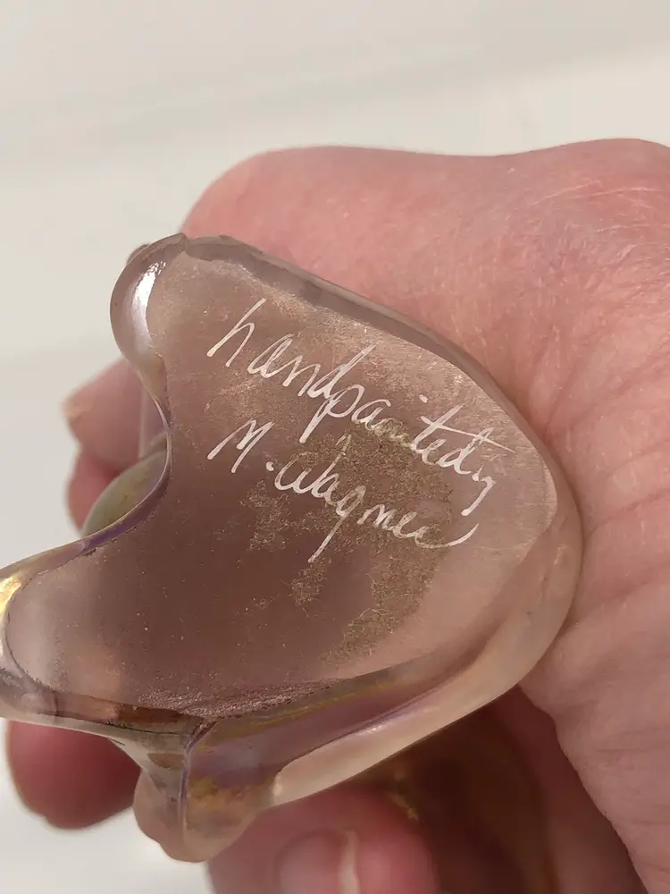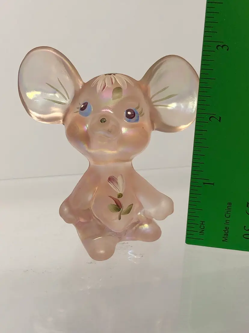 2 3/4" pink iridescent Fenton mouse hand painted by beloved designer Marilyn Wagner with sweet flowers. Excellent condition, no chips or cracks, Fenton oval stamp and artist signature on the base.