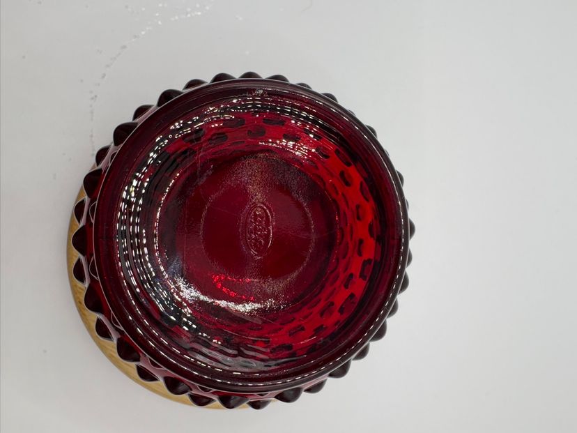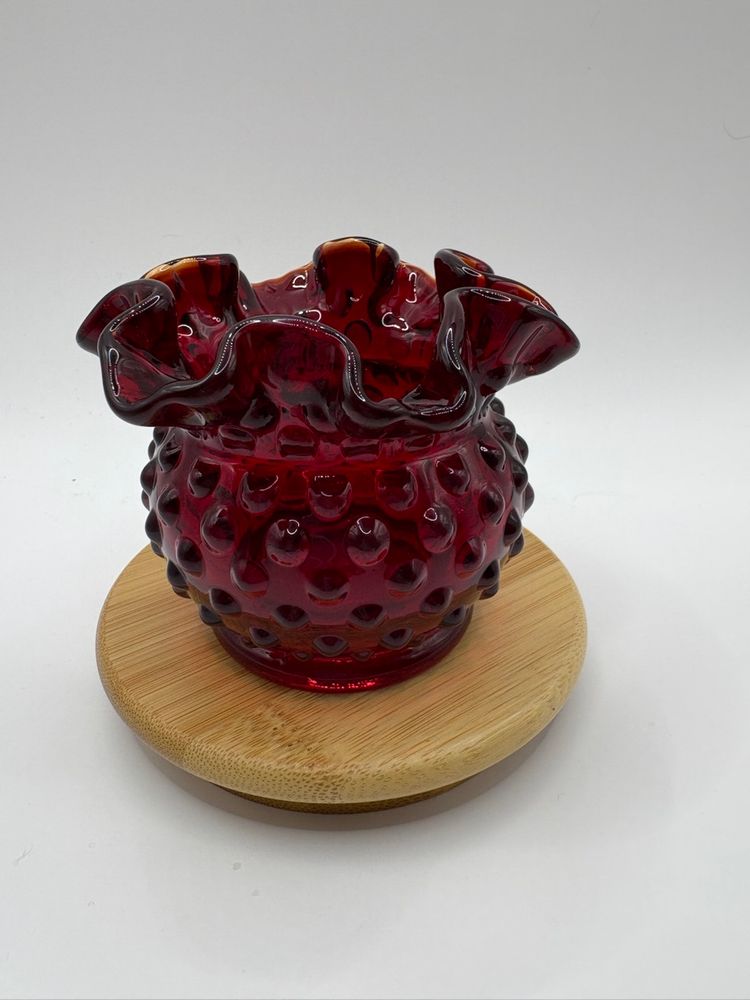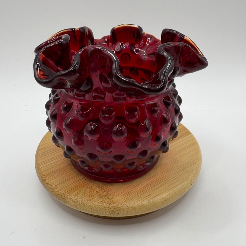 Fenton Red Hobnail Ruffled Edge Measures 3 inches tall and 3 1/2 inches at widest No chips or cracks.. in excellent condition