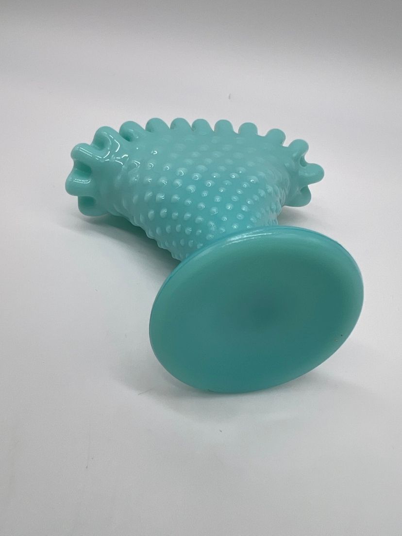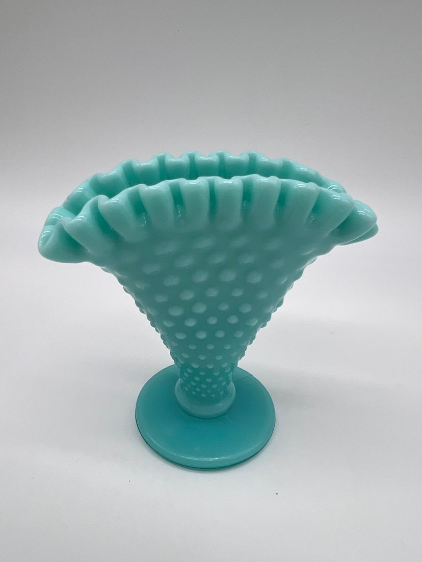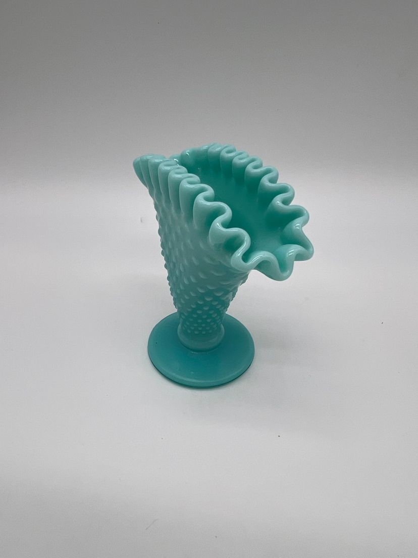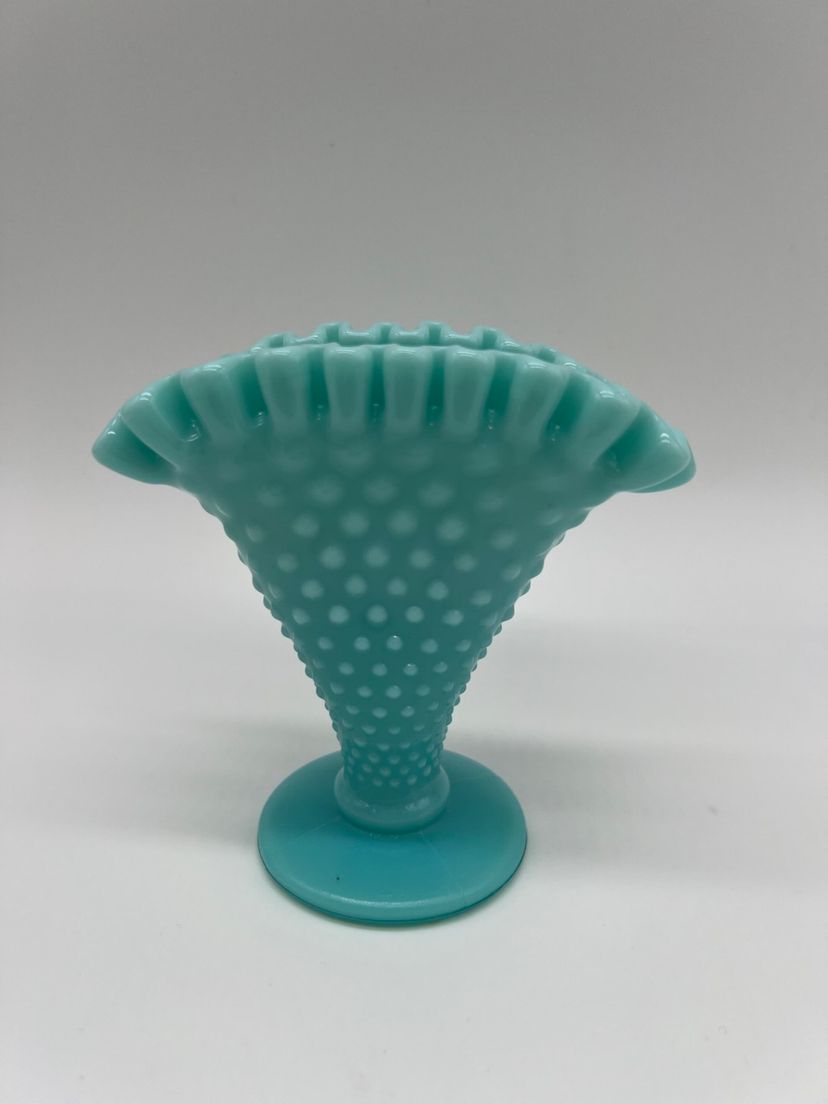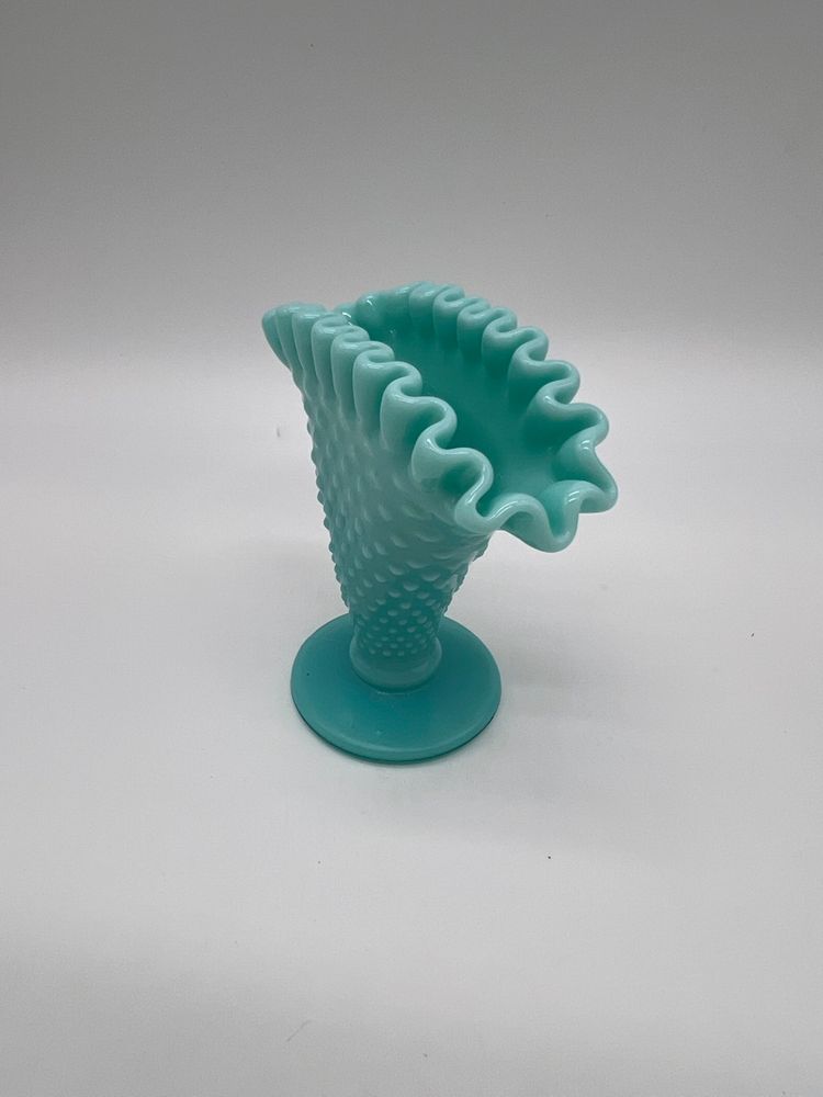 This listing features a beautiful Fenton Turquoise Glass Hobnail Small Fan Vase, standing at 4 inches tall. The vibrant turquoise color, coupled with the classic hobnail pattern, makes this piece a striking addition to any collection or decor.