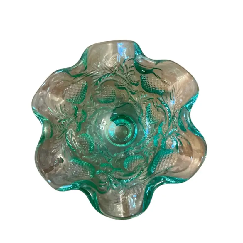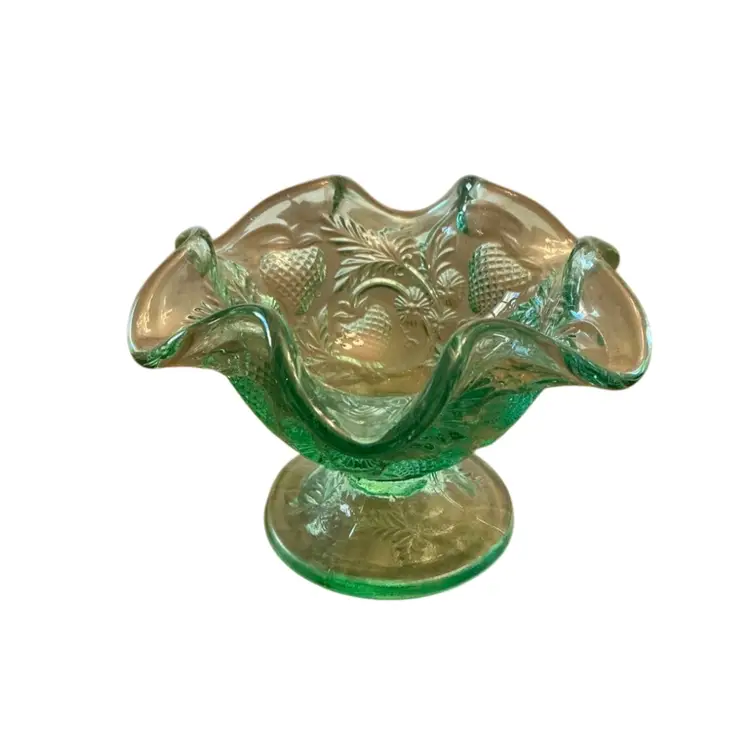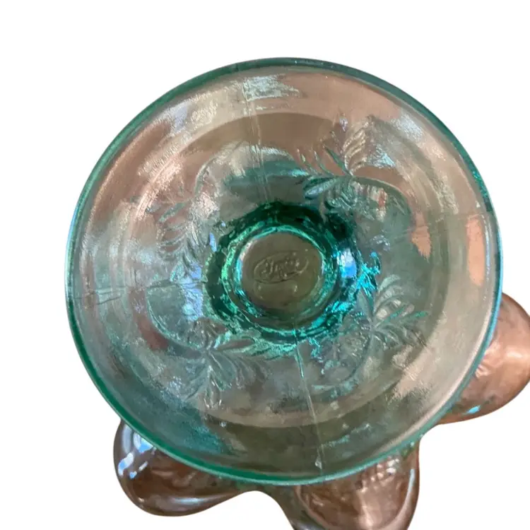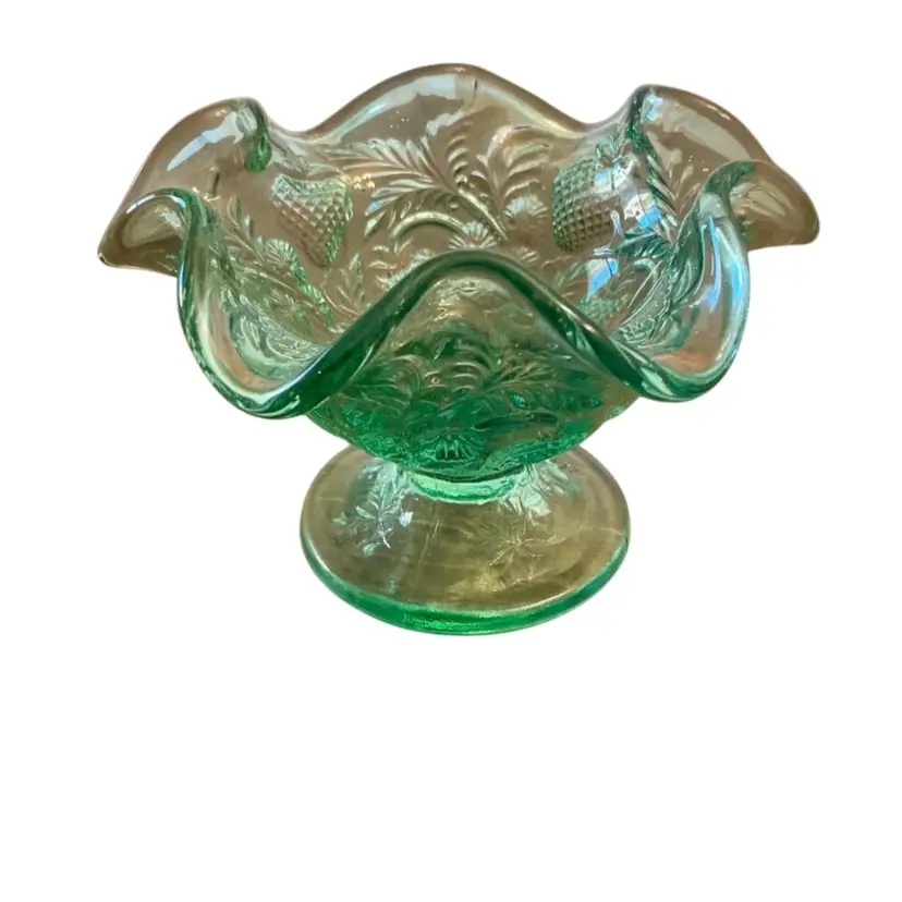 Beautiful soft green color glass compote. Photos do not show the true color of this piece. 3” x 5” the perfect size for some M&M’s. Has the Fenton stamp on bottom.