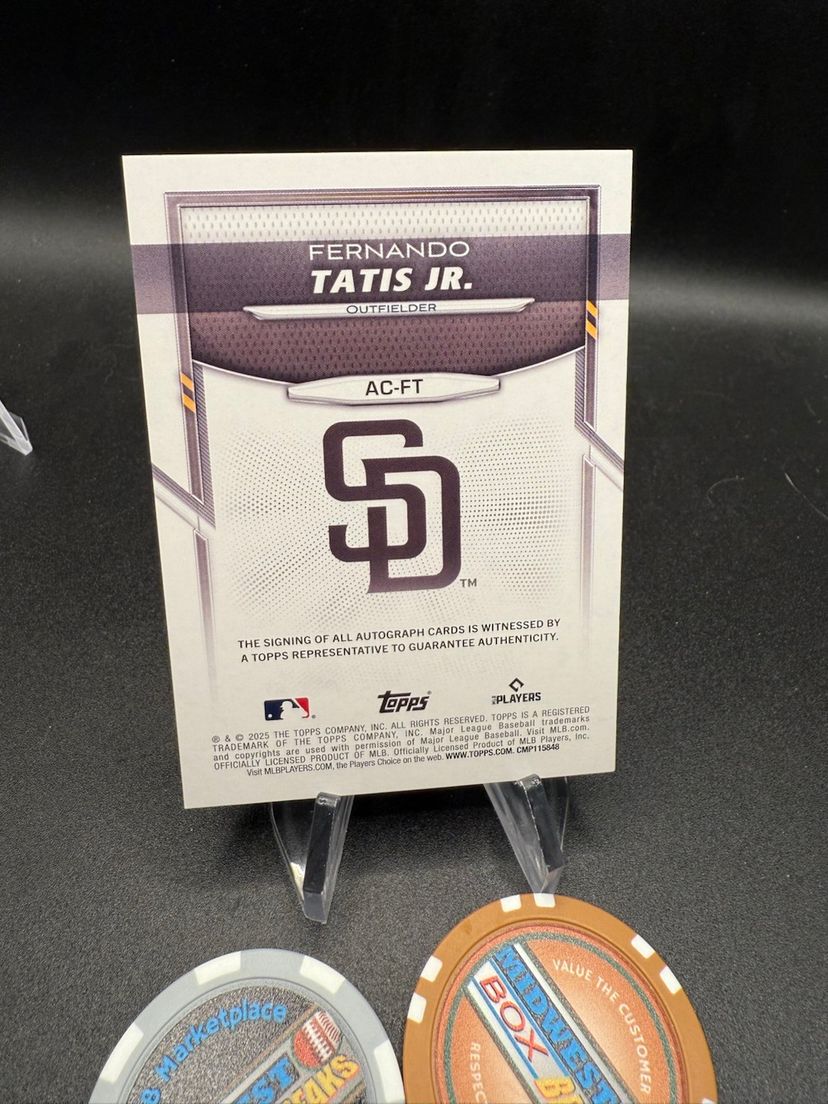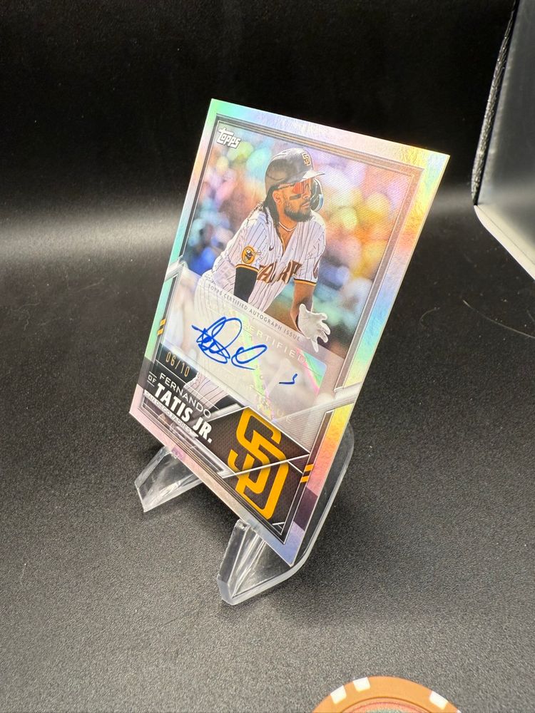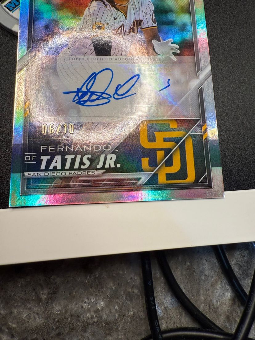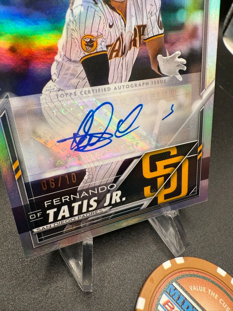 This is an auto of Fernando Tatis #6/10. This is a rare auto from Topps Chrome Mitchell and Ness. Only 10 produced and this is only one listed anywhere. Two soft corners and one blemish (last pic) so will not gem.