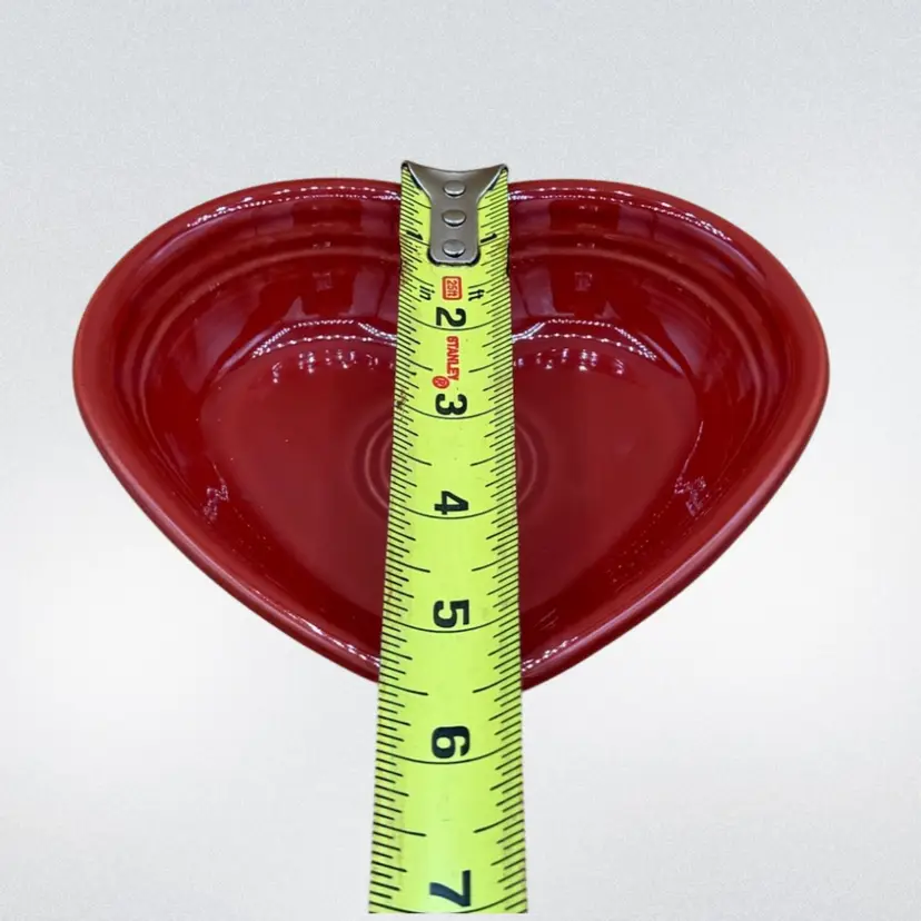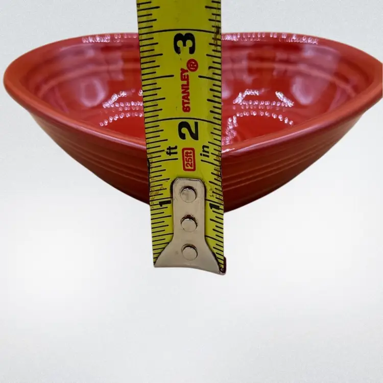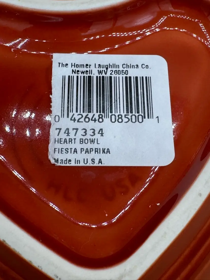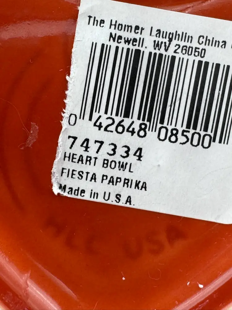 This sweet little dish is embossed with the Fiesta signature and has the original sales sticker attached. It measures 5 1/2” in length & about 6” wide w/ a 1 1/2” depth. Excellent condition w/ no chips or cracks
