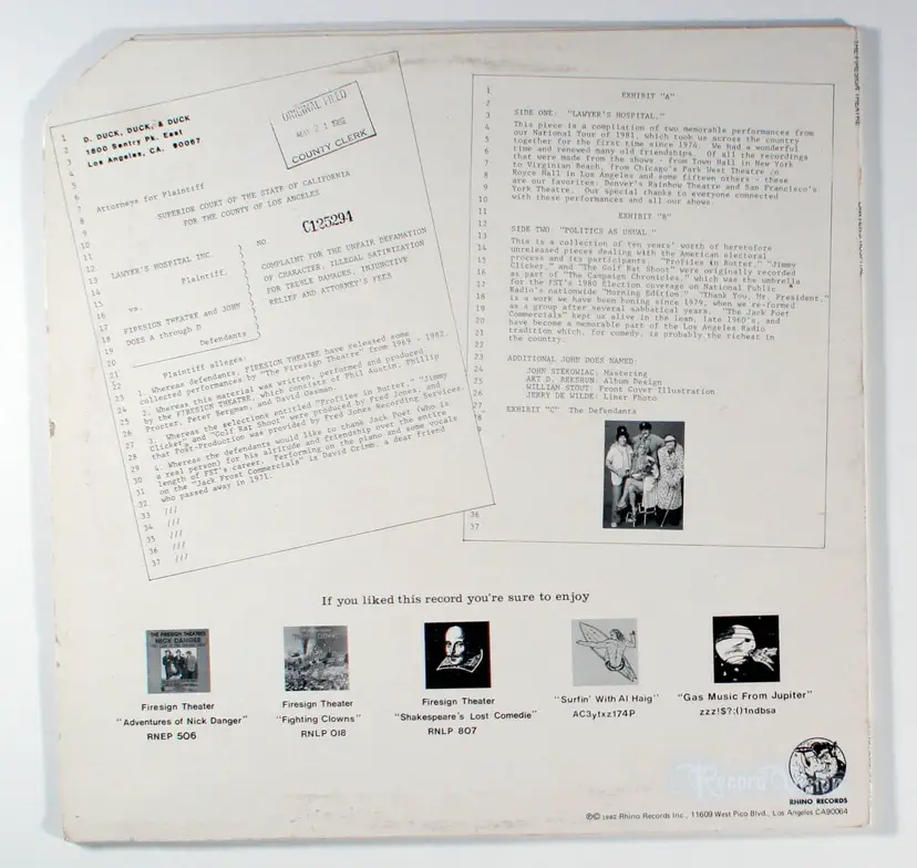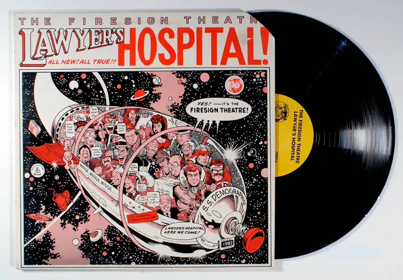 Lawyer's Hospital, by Firesign Theatre, is a collection of live performances dating back to 1969, National Public Radio segments from the 1980 presidential election coverage known as "The Campaign Chronicles," and classic radio ads like the Jack Poet Volkswagen commercials. The album satirizes the absurdities of American bureaucracy, media, and politics through surreal sketches that blend wordplay, sound effects, and layered dialogue, continuing the troupe's signature style of audio theater. Historically significant as one of the Firesign Theatre's later works amid their declining popularity during the Reagan era, it reflects the group's adaptation to a shifting cultural landscape by repurposing earlier material into a cohesive critique of institutional madness. Rhino's support during this period helped preserve and repackage the Firesigns' legacy, marking a transition from their Columbia heyday to independent releases. The album produced no hit singles, consistent with the group's focus on full-length comedic recordings rather than standalone tracks.