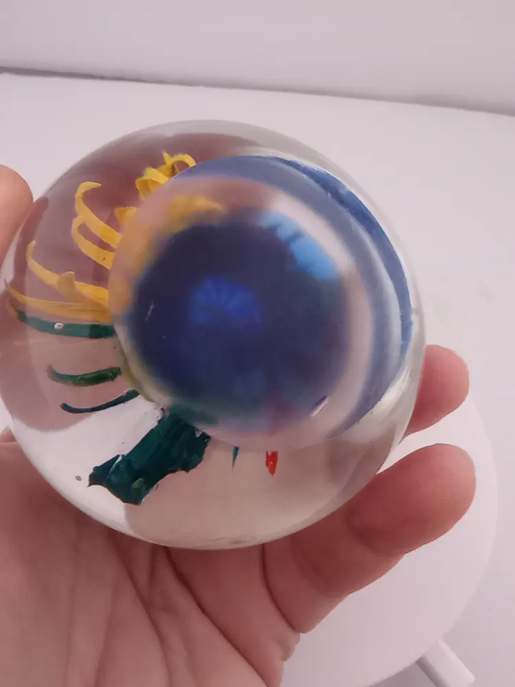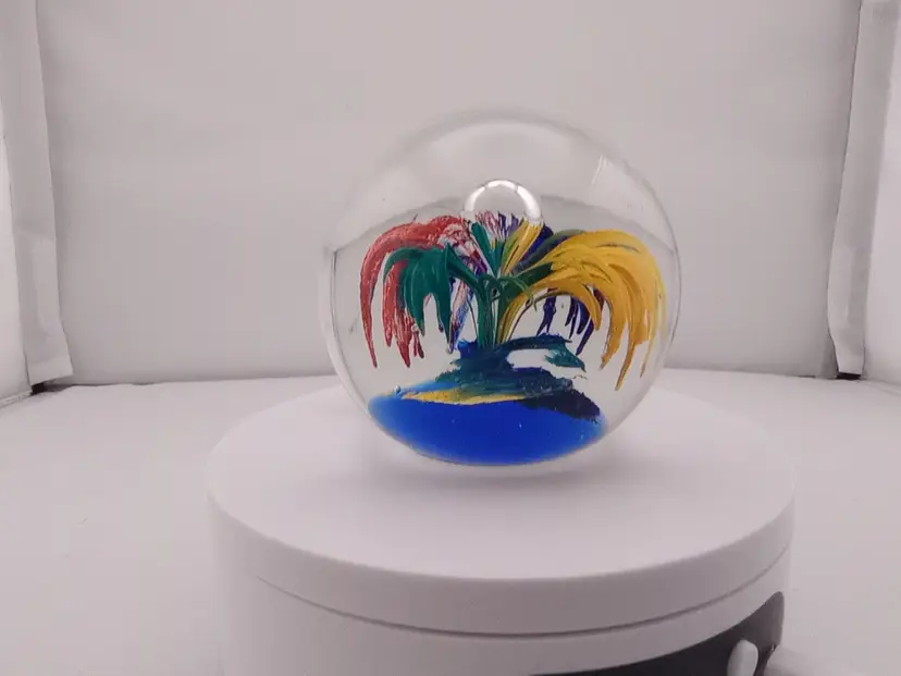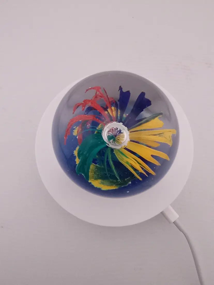This is a lovely multicolor paperweight with a fireworks flower and captured bubble. It's in excellent condition with no noted flaws.