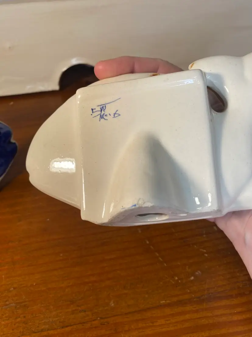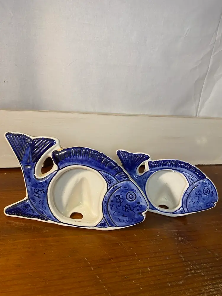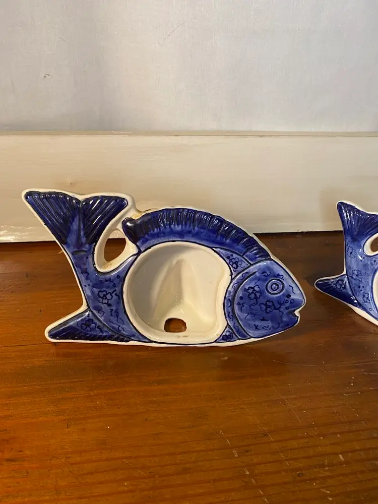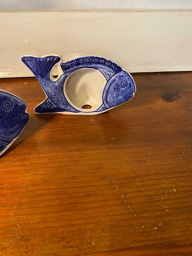Ceramic Blue Fish Pocture Frames. One has opening 3 inches and the other is 3 1/2 inches.