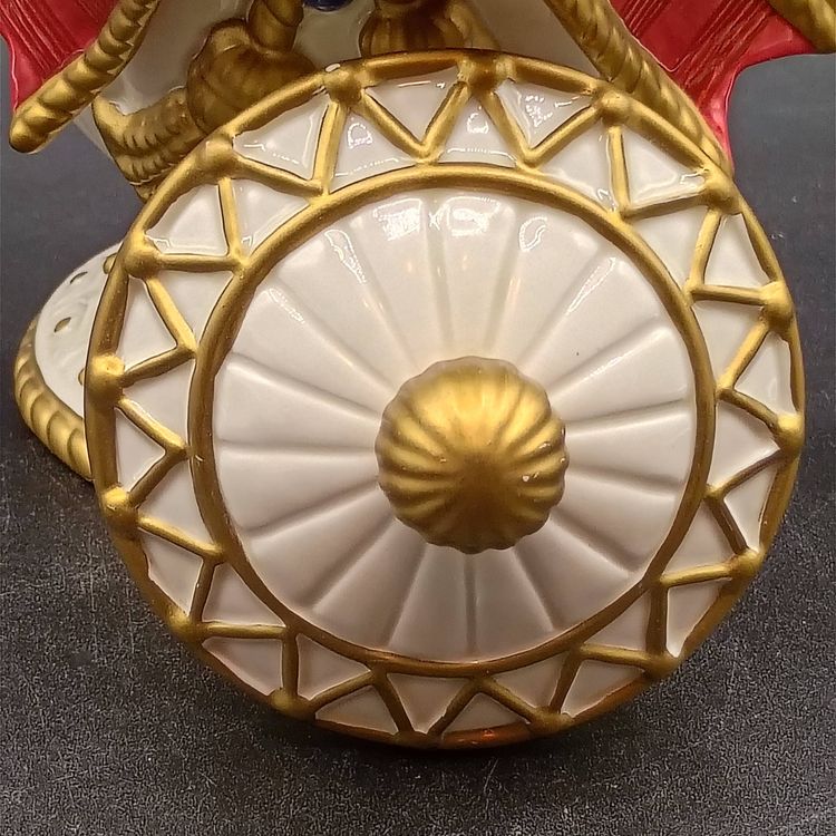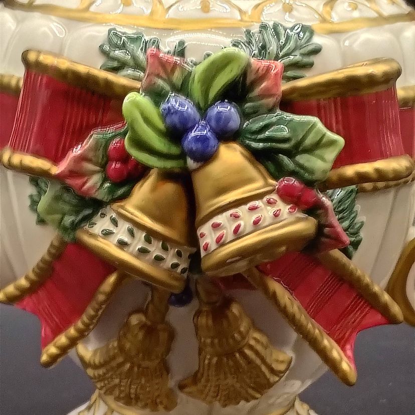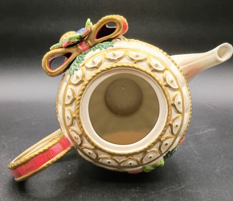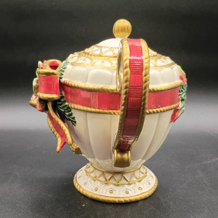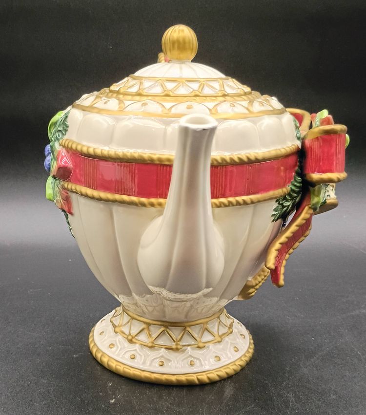 The Fitz and Floyd Christmas Deer Holiday Teapot with Lid is a vintage collectible perfect for holiday entertaining. This medium-sized tea pot has a festive Christmas pattern with intricate details of bells, tassels, and bows, adding a whimsical touch to your kitchen decor. Made of ceramic and porcelain, this original Fitz and Floyd Classics piece is a unique and delightful find for collectors of seasonal decor. Discontinued Pattern: Actual: 1998 - 2001 Measures approx.: 8 x 9 1/12 x 7