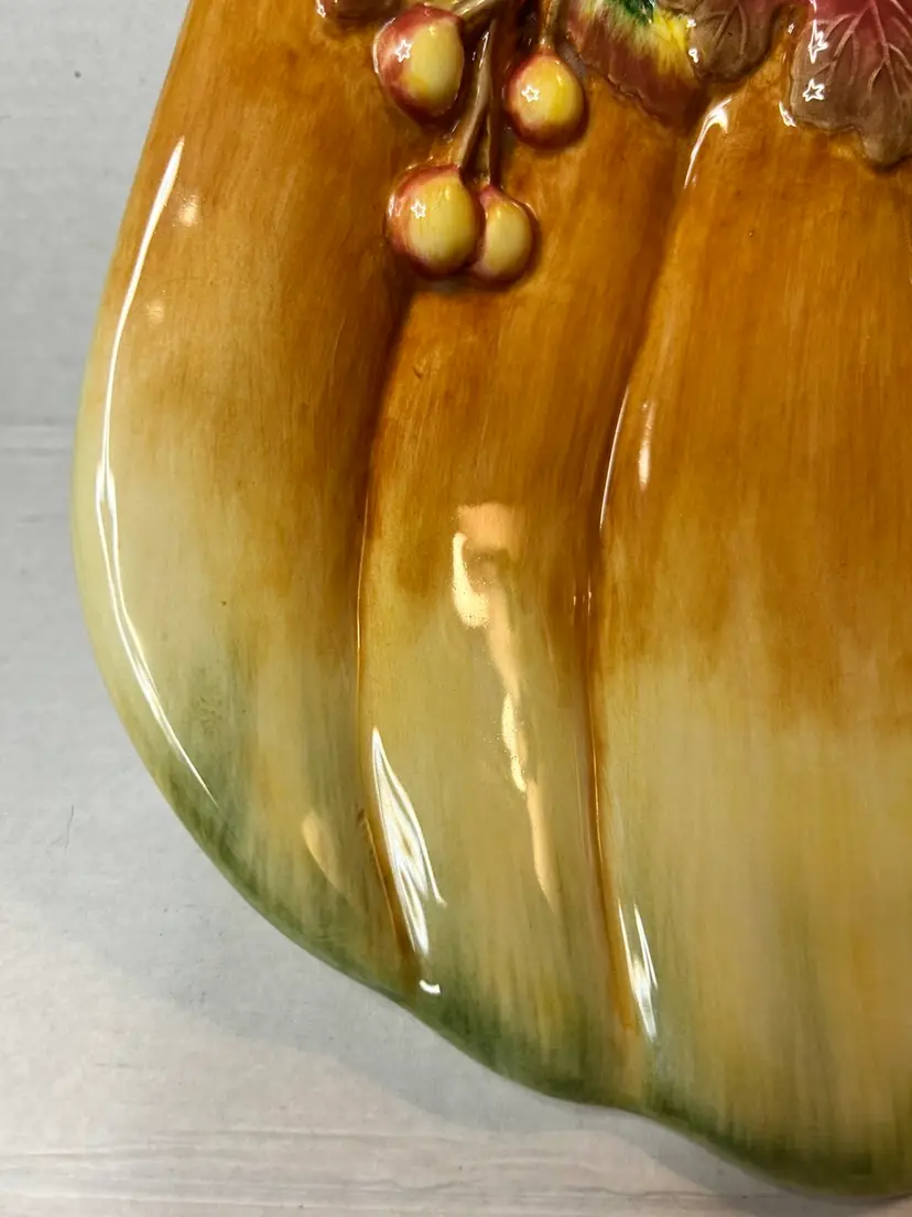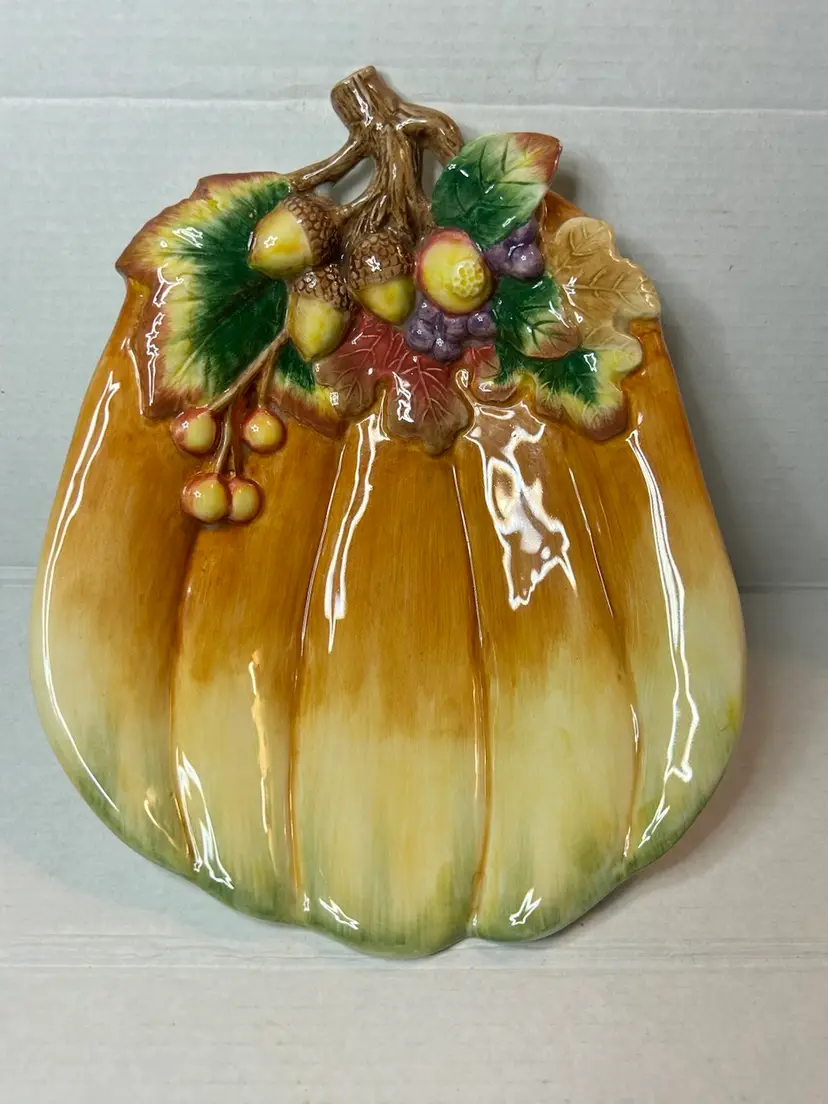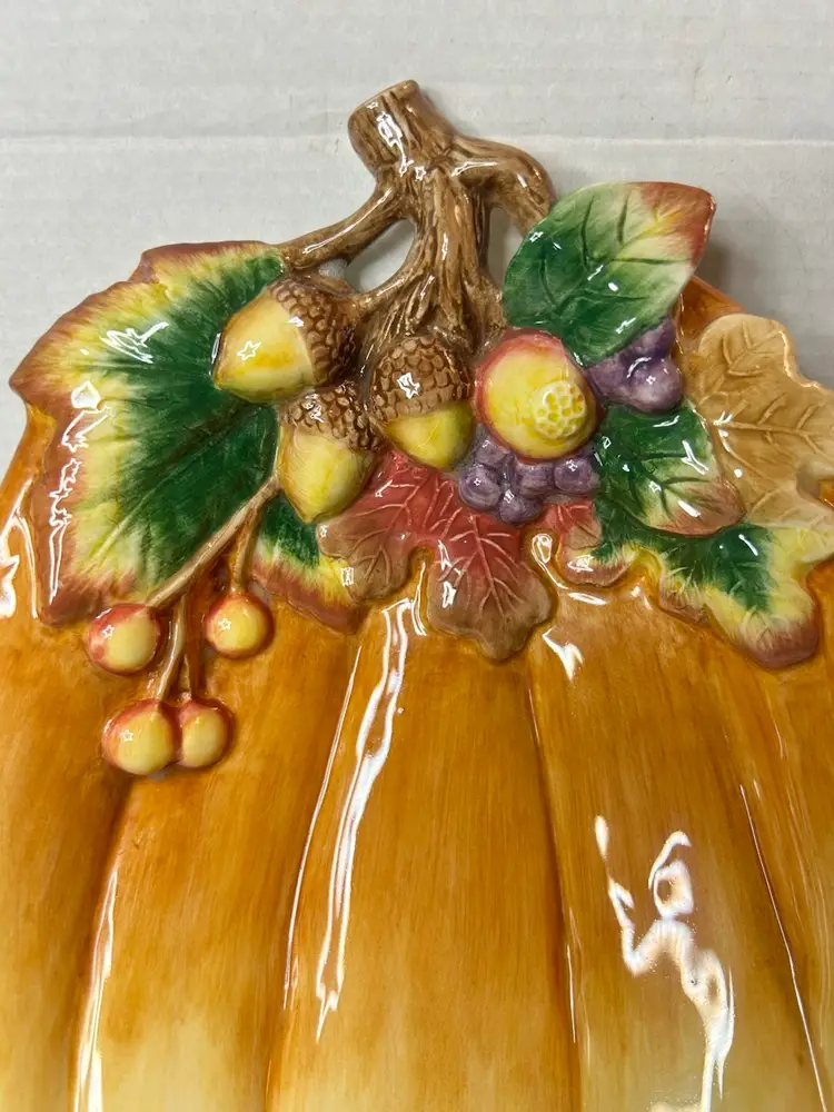 It is part of the "Autumn Splendor" collection by Fitz & Floyd, featuring an autumn-themed design of a pumpkin, acorns, grapes, and leaves.