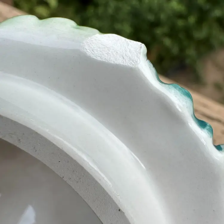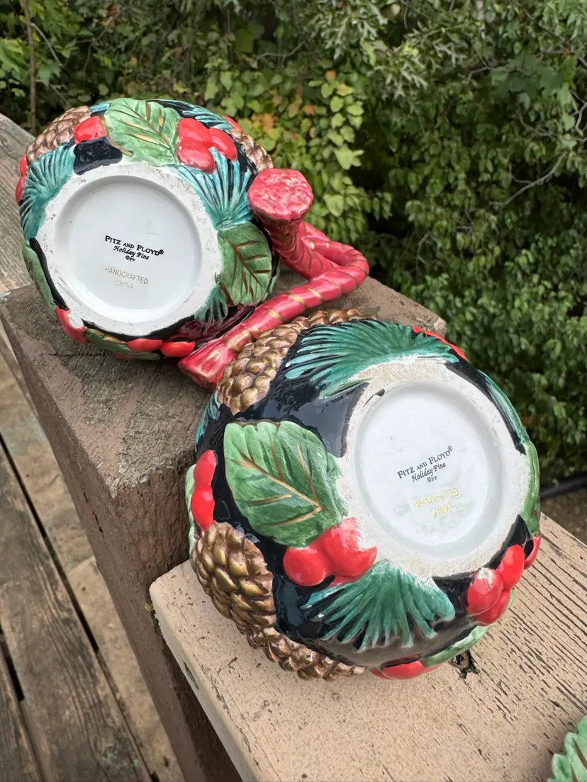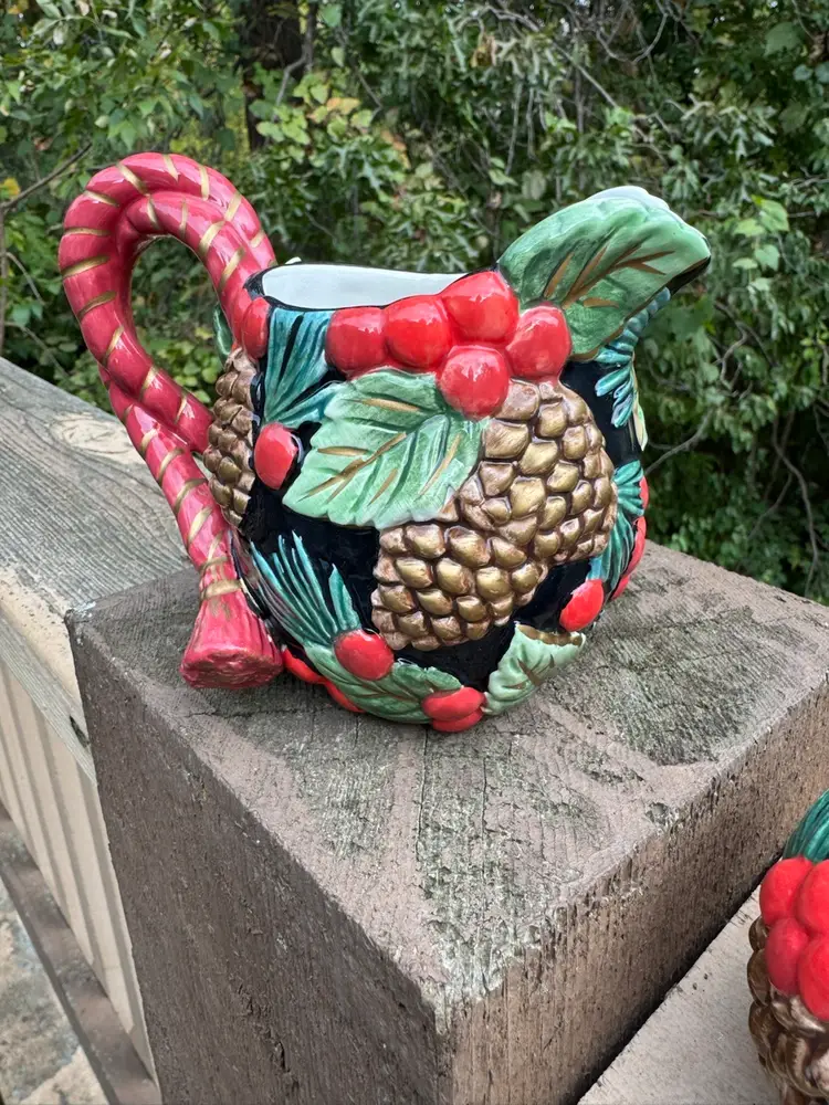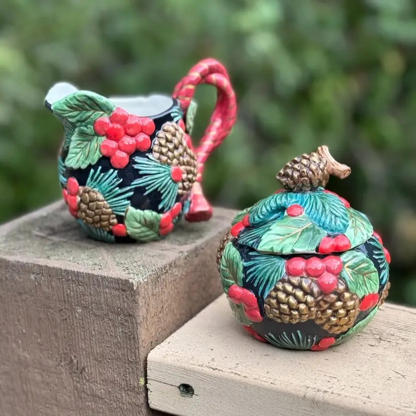 A beautiful cream and sugar bowl set for your holiday table setting! No paint loss or cracks. Small chip on interior of sugar bowl lid. Not visible from the outside. Both measure about 4 inches tall.