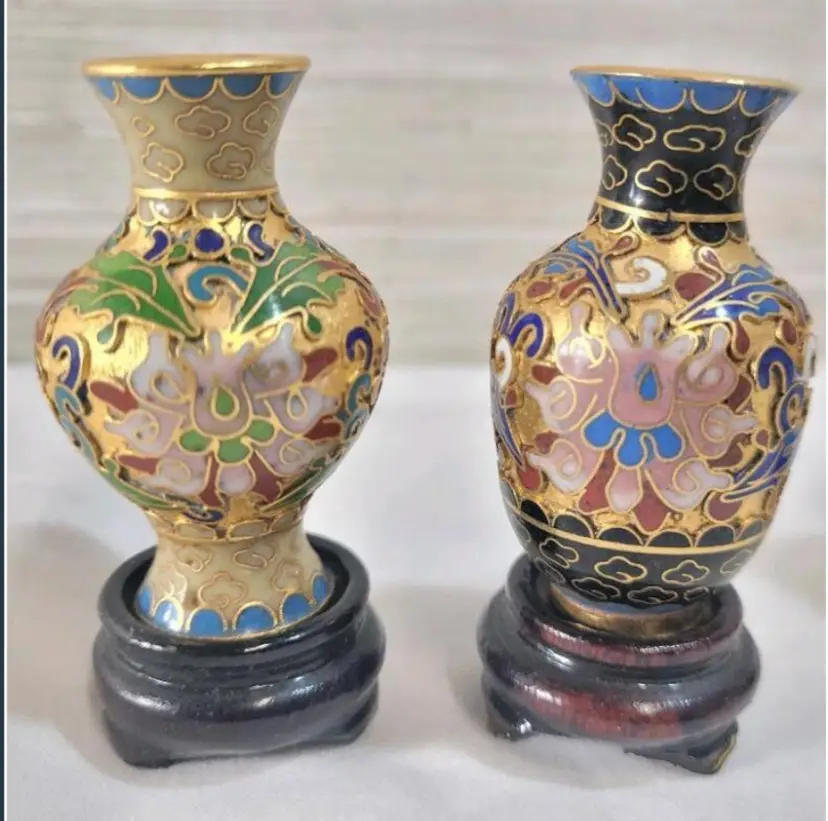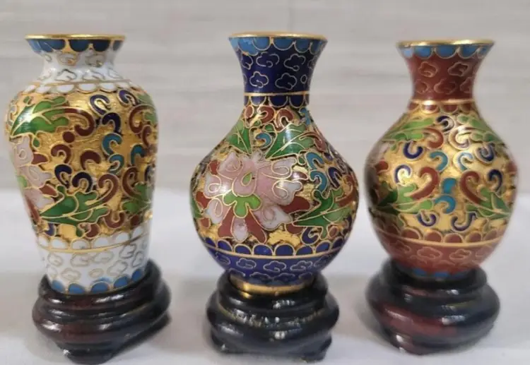 Five (5) Vintage Mini Chinese Cloissoné Vases on Wooden Stands . Measures 2 ½" tall w/stand