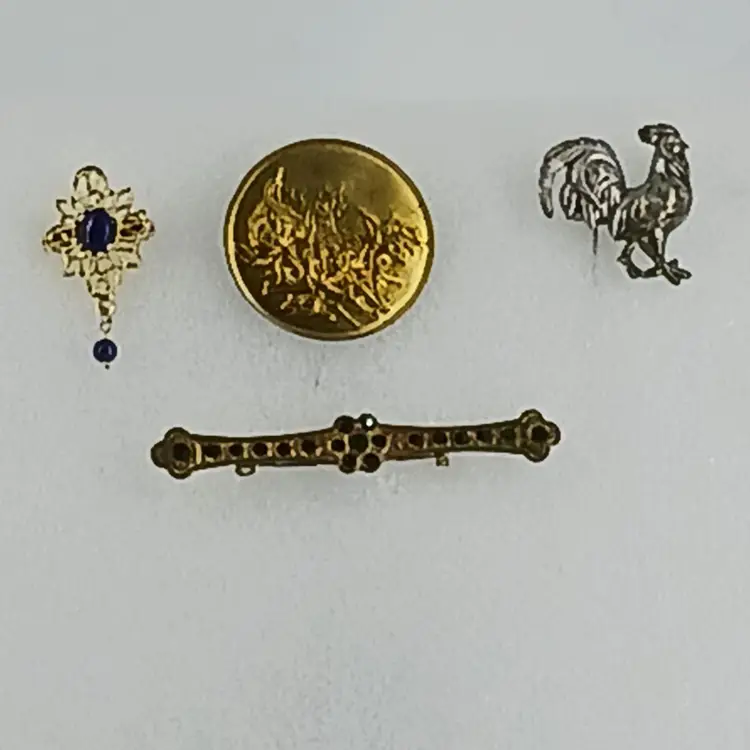 PM71– A handsome Rooster struts his stuff in this brass stamped which has a silver highlight added, pin measures 1 1/4x 1 1/4inches.