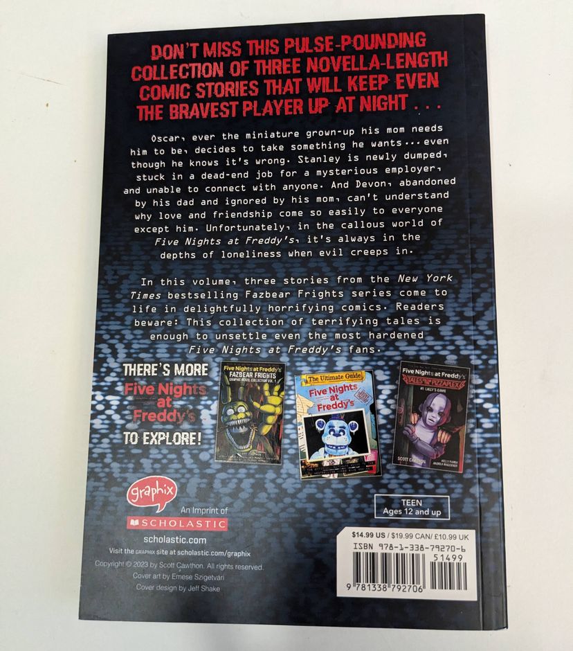 In this volume, three stories from the New York Times bestselling Fazbear Frights series come to life in delightfully horrifying comics. Readers beware: This collection of terrifying tales is enough to unsettle even the most hardened Five Nights at Freddy’s fans.