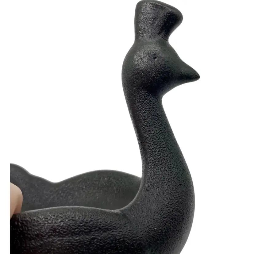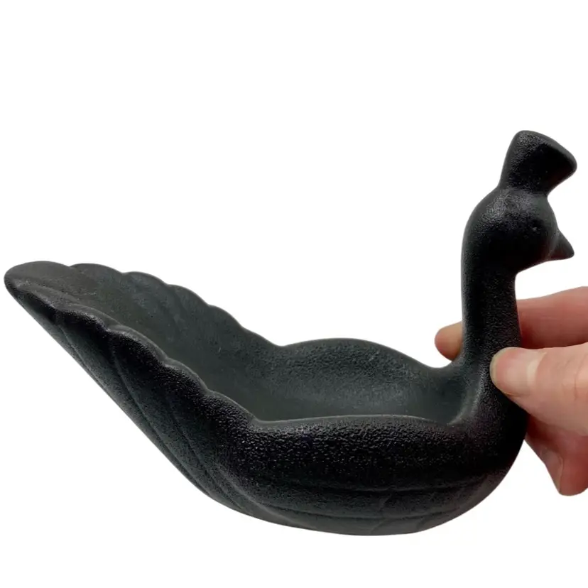 This unique black matte ceramic bowl/trinket dish features a beautiful peacock design. Measuring 6 inches by 2.5 inches, it is the perfect size for holding spices, small items, or as a decorative piece. The piece is made by Floor 9, adding to its collectible value. The intricate details of the peacock's feathers and the use of high-quality ceramic material make this item a must-have for any bird lover or collector.