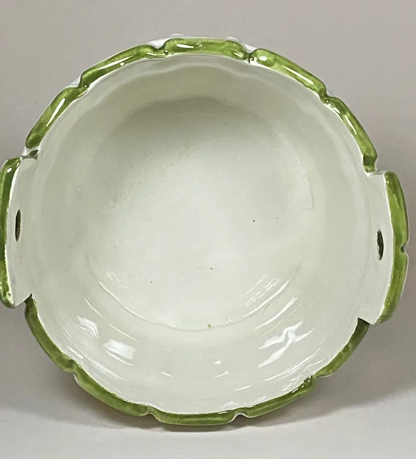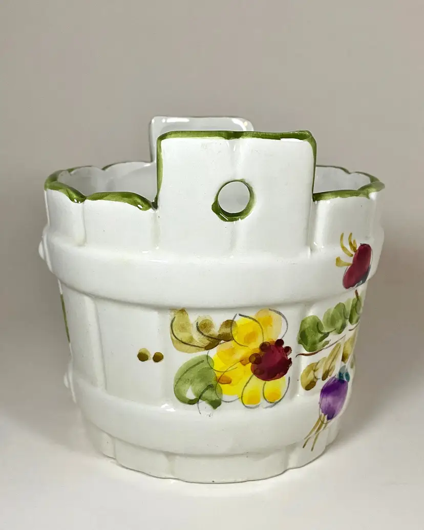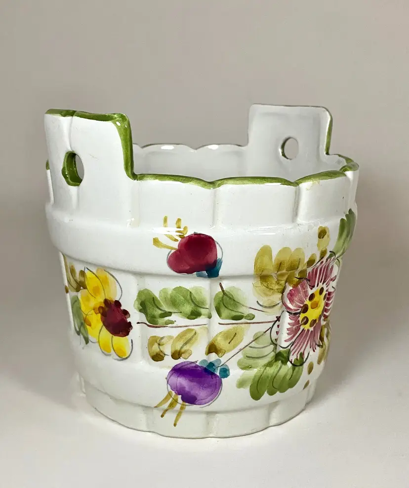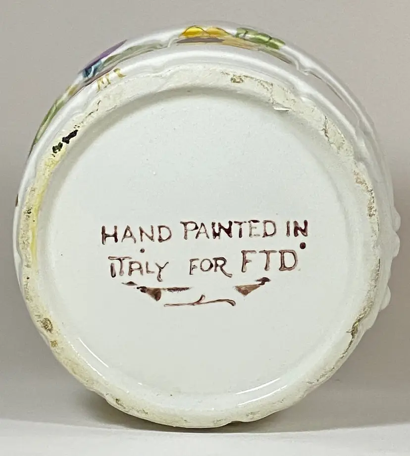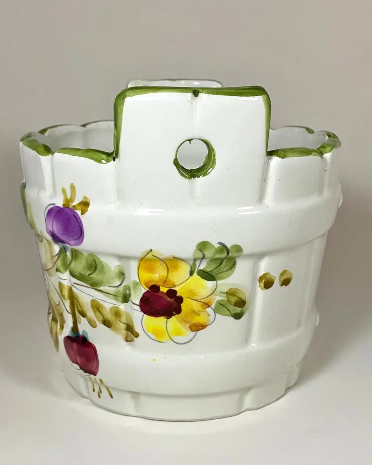 Hand-painted in Italy for FTD, this original piece is a must-have for any collector of beautiful high-quality home decor. The intricate floral design is eye-catching. The round shape and glossy finish make it a versatile addition indoor and outdoor. There are holes on the handles for attaching wire for hanging as an option. The backstamp is painted to ensure authenticity. Dimensions: 5" to top of handle, 5 3/8" diameter. This item is in excellent pre-owned condition - no chips or cracks.