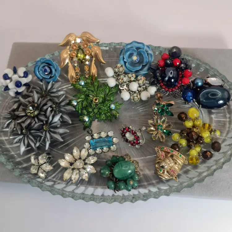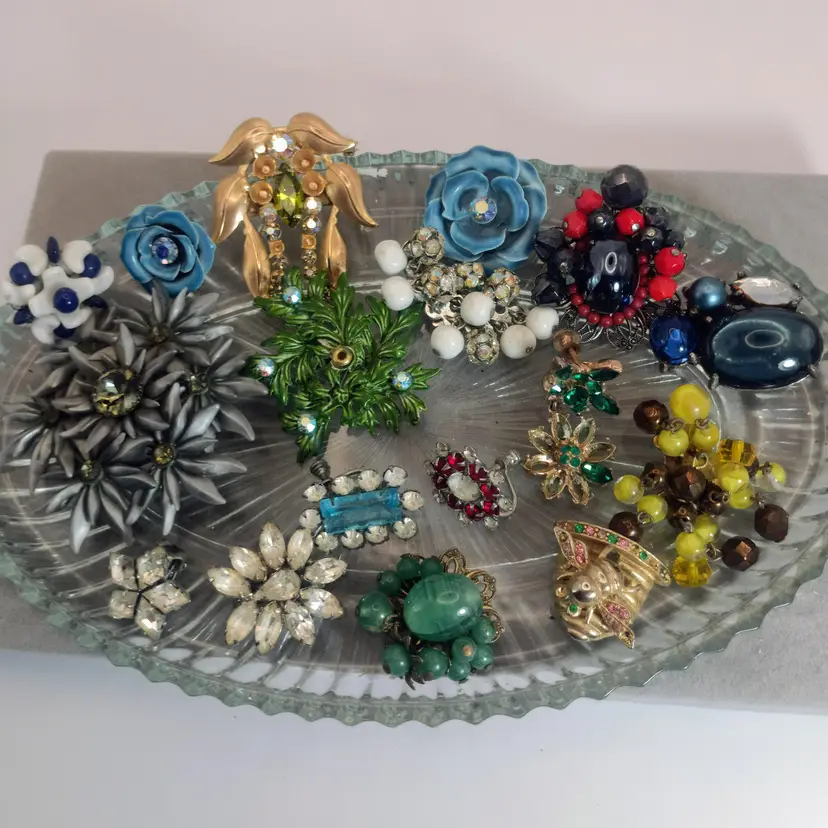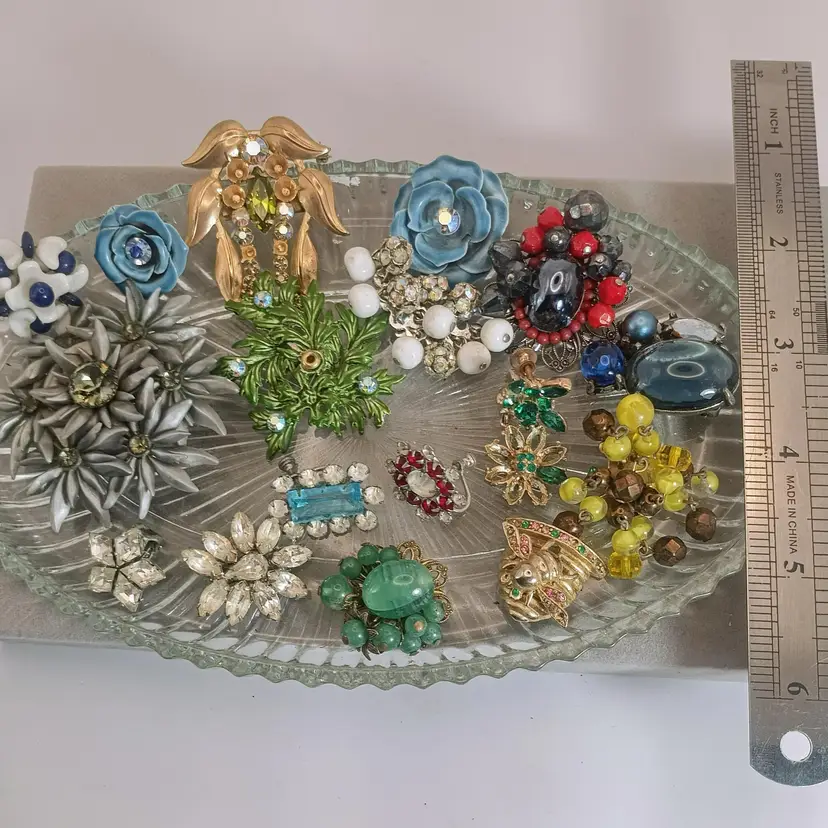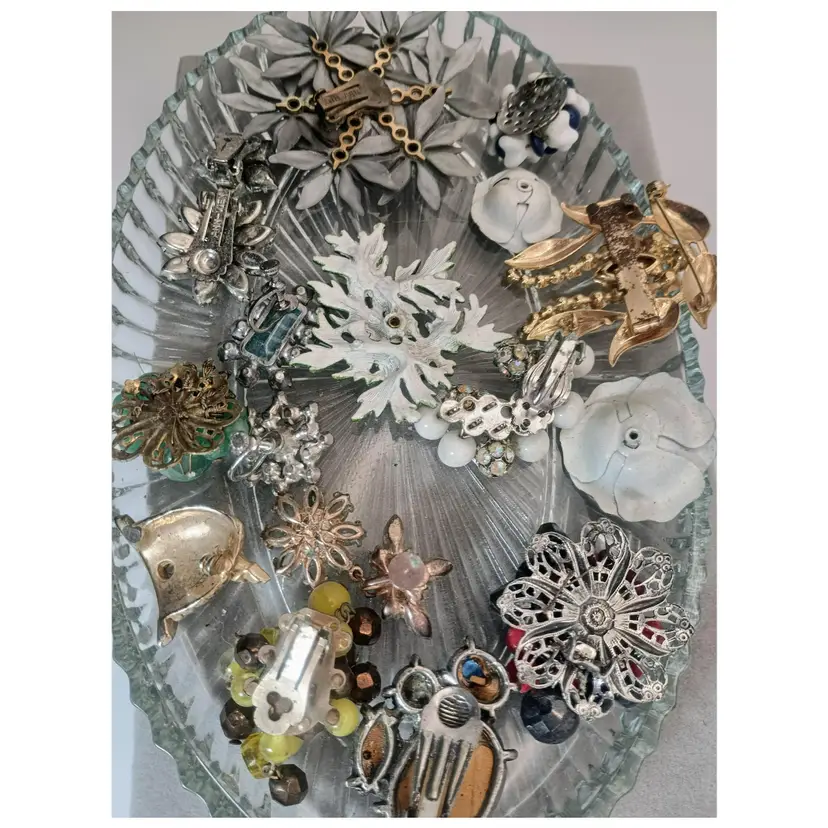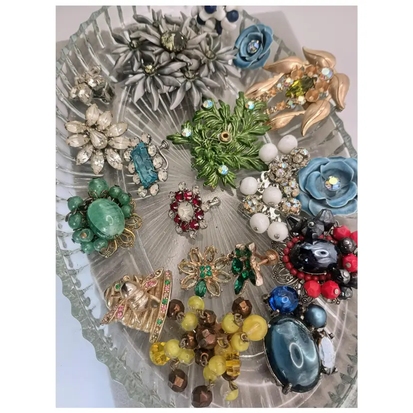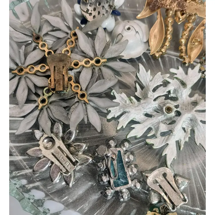 Hi Thanks for looking. In this vintage bulk lot, you will receive 17 pieces. You will receive over 60 beads that consist of milk glass, rhinestone ball beads, and Czech Glass beads. You also will receive many single clip-on earrings and a brooch. Some are signed Ann Vien. This lot has a flower theme. Some pieces are missing rhinestones and are perfect for repurposing, mixed media, and making your own creative pieces.