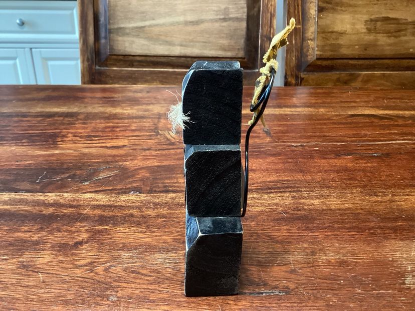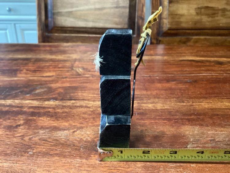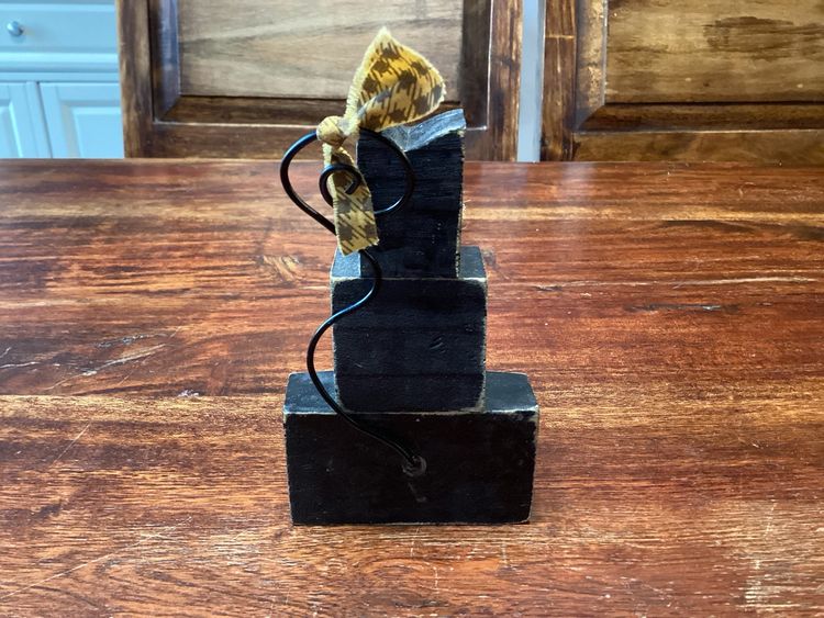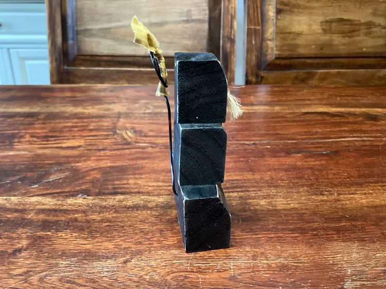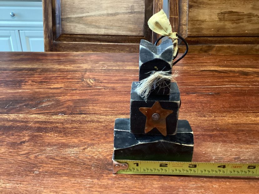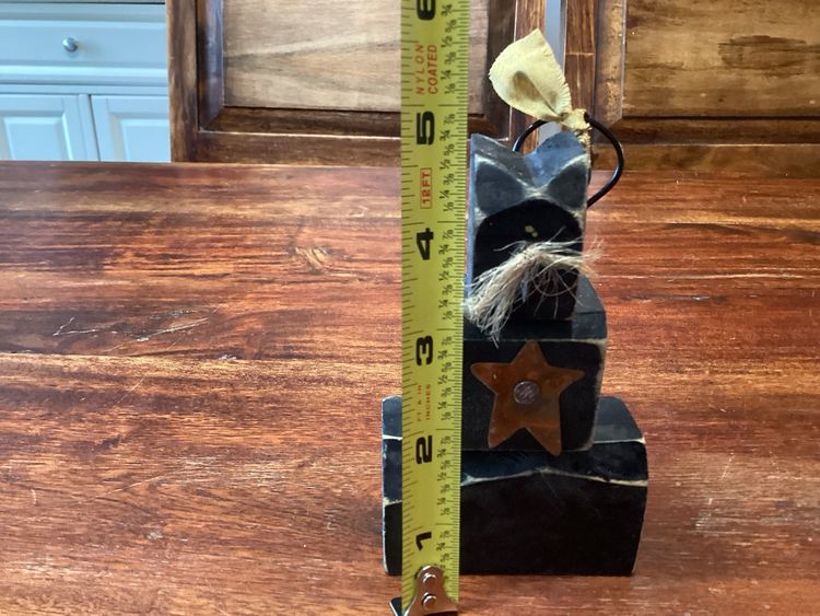 This black cat has a star on its chest and jute whiskers. He stands 4 3/4 inches tall and 2 3/4 inches long. He has a metal wire tail that can be posed with a tiny little bow. No condition issues noted.