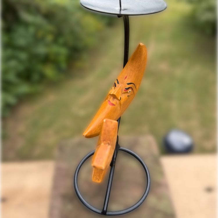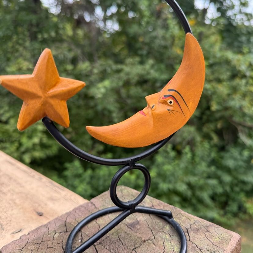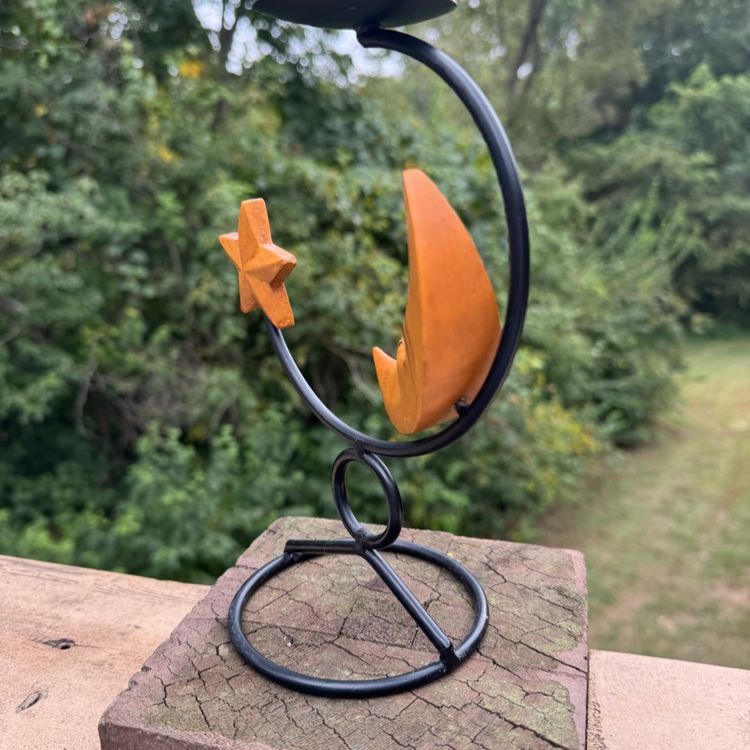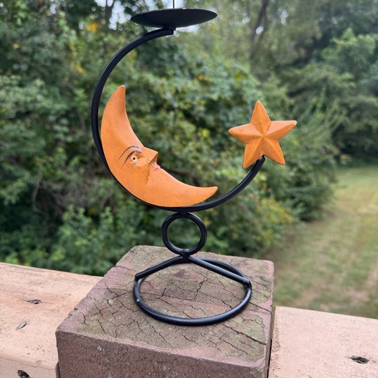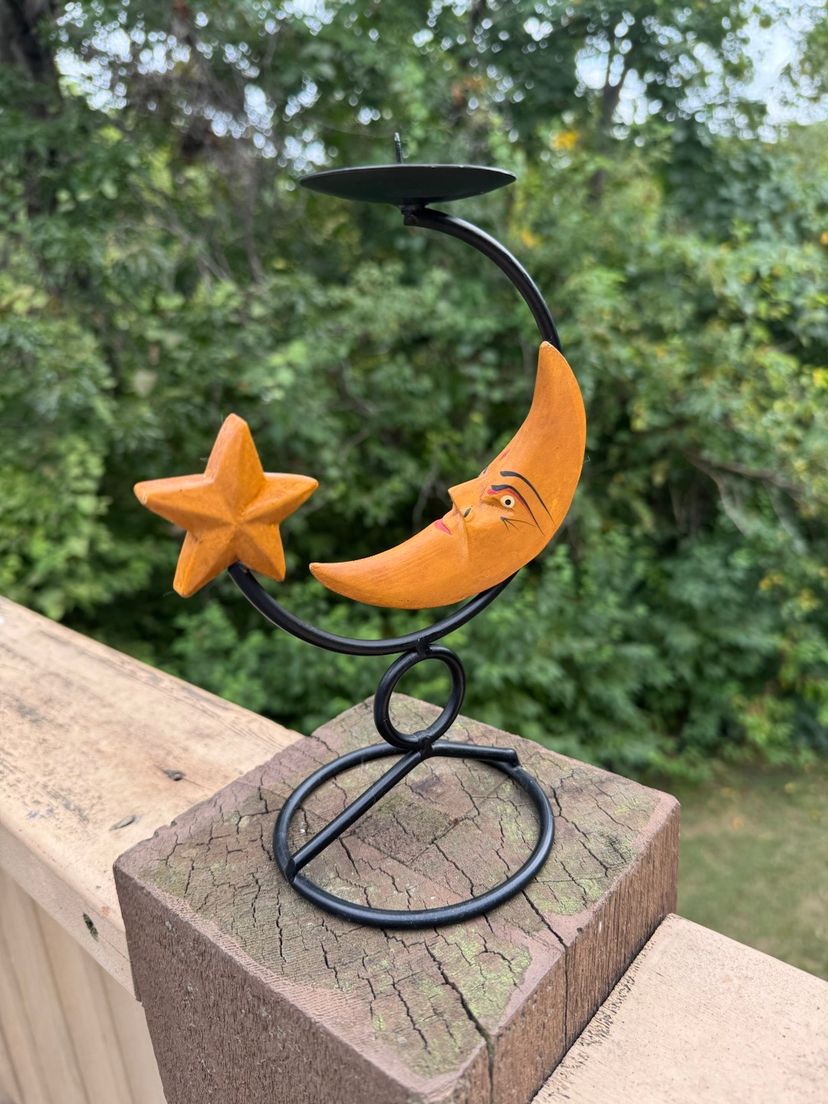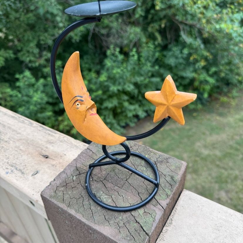 Moon and star candle holder. Unique painting on the moon‘s face. Measures about 8 inches tall. Wonderful condition.