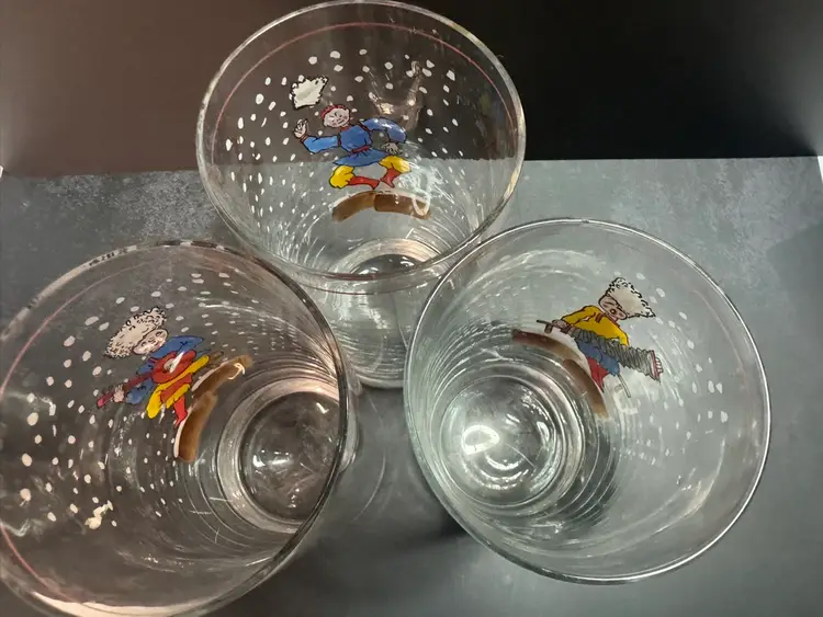 Set of 3 folk art hand painted glasses. Unknown artist. Fun set. Glasses are 6” tall.