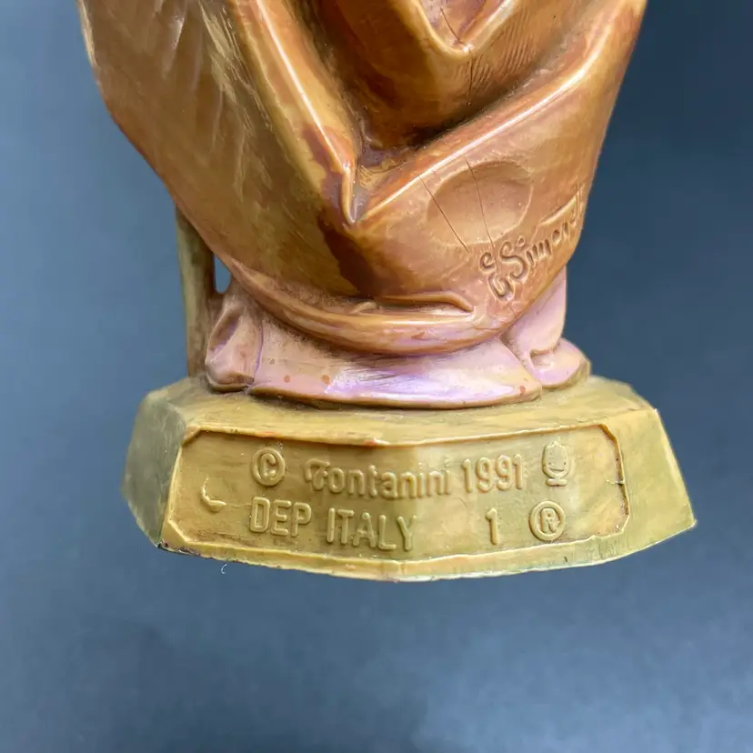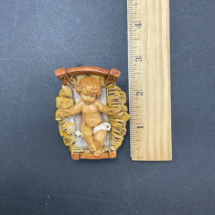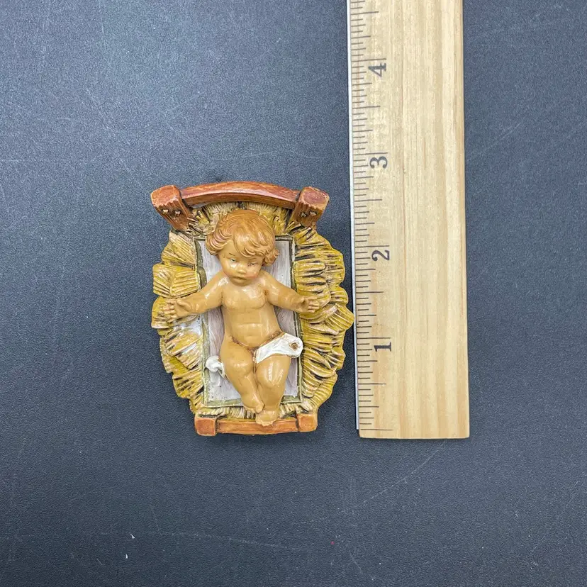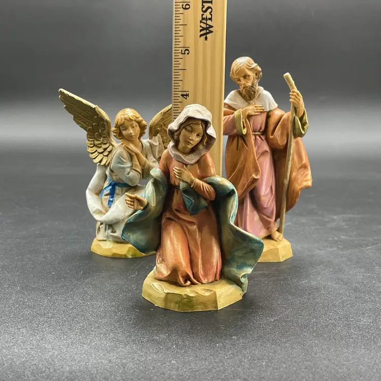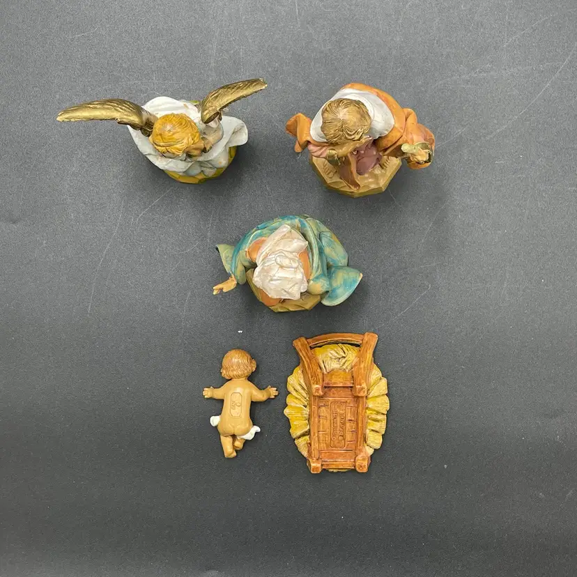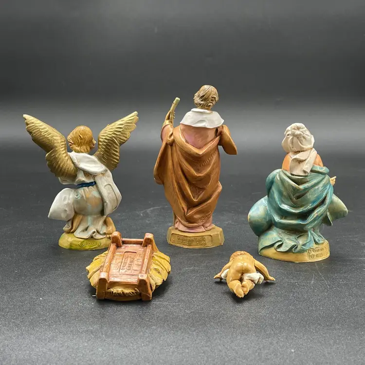 This is a set of 5 vintage 1991 Fontanini Depose Italy nativity set. It includes Mary, Joseph, baby Jesus and crib, and the holy angel. Each piece is marked. Joseph measures approximately 4.5" tall. Mary is approximately 4" tall. Baby Jesus is approximately 2.5" long. The angel is approximately 4" tall. No box. No major flaws.