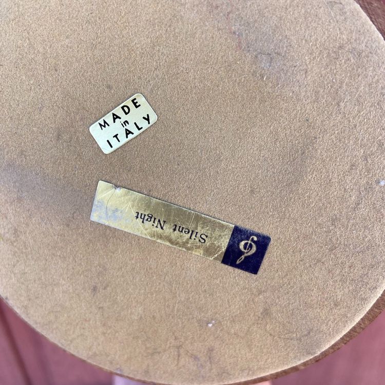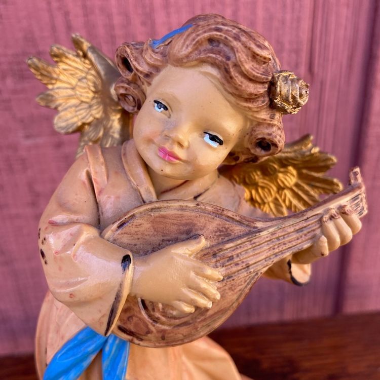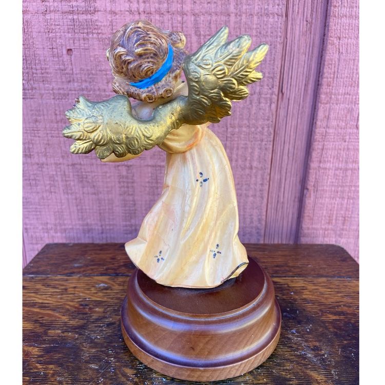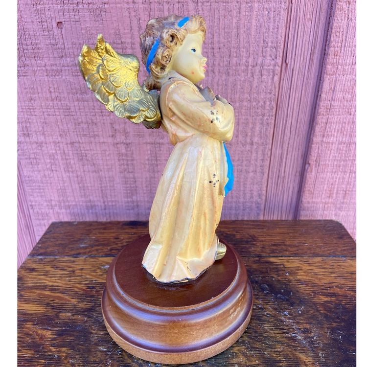 Approx: 7.5”h x 4.25”w. No chips or cracks. Pre-owned condition. Rough spot on bow of hair ribbon and some scratches on wooden base. See images as part of description.