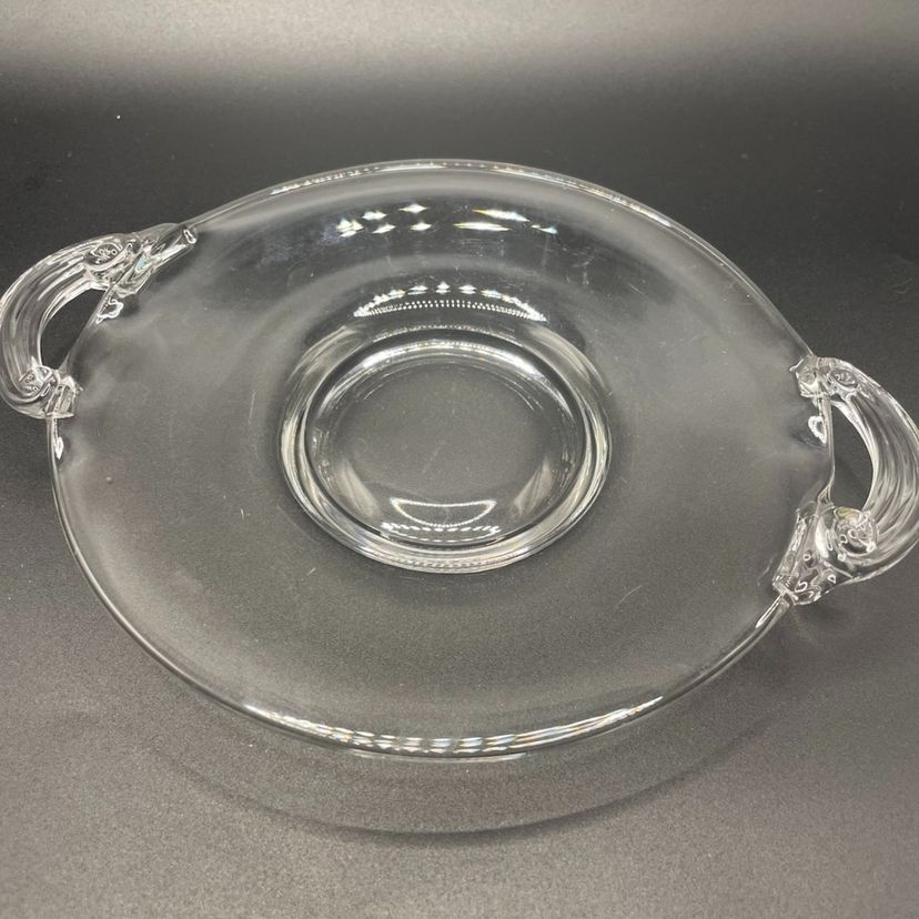 Based on the handles, this appears to be a vintage glass dish, possibly a bonbon or lemon plate, from a manufacturer like Fostoria or Steuben.