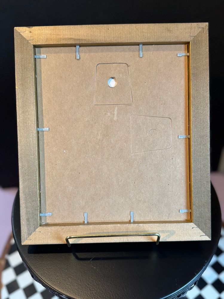 Brushed gold frame featuring a print by Ammi Phillips. The original was painted in the 1830s. There is no glass in the frame. Measures 8.5”x7.5”. Print features a young girl tightly holding a white cat with a dog at her feet.