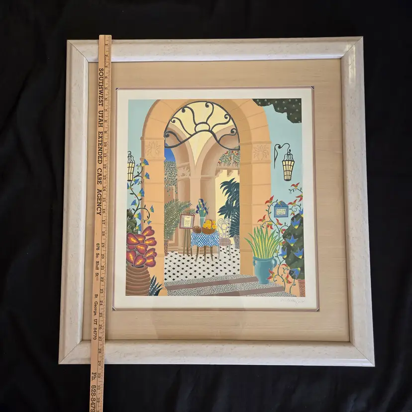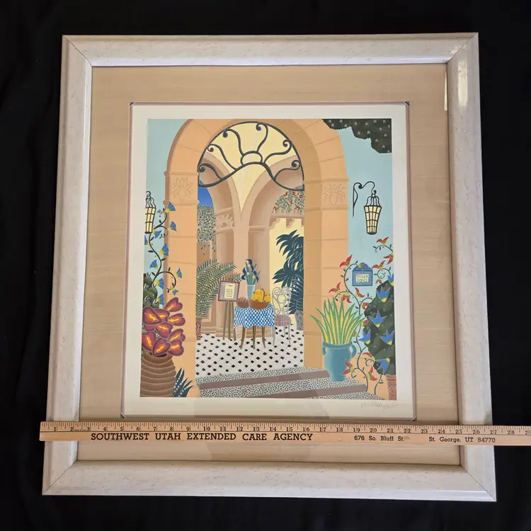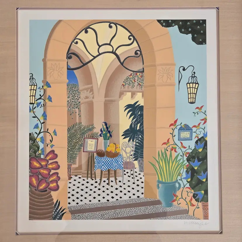 Framed (27"×29") Lithograph Thomas McKnight "Positano Restaurant" Limited-Edition 3 of 150. Used condition with signs of wear to frame, plastic and paper backing, print itself looks good. Please view all the photos and please ask any questions prior to purchase when possible.