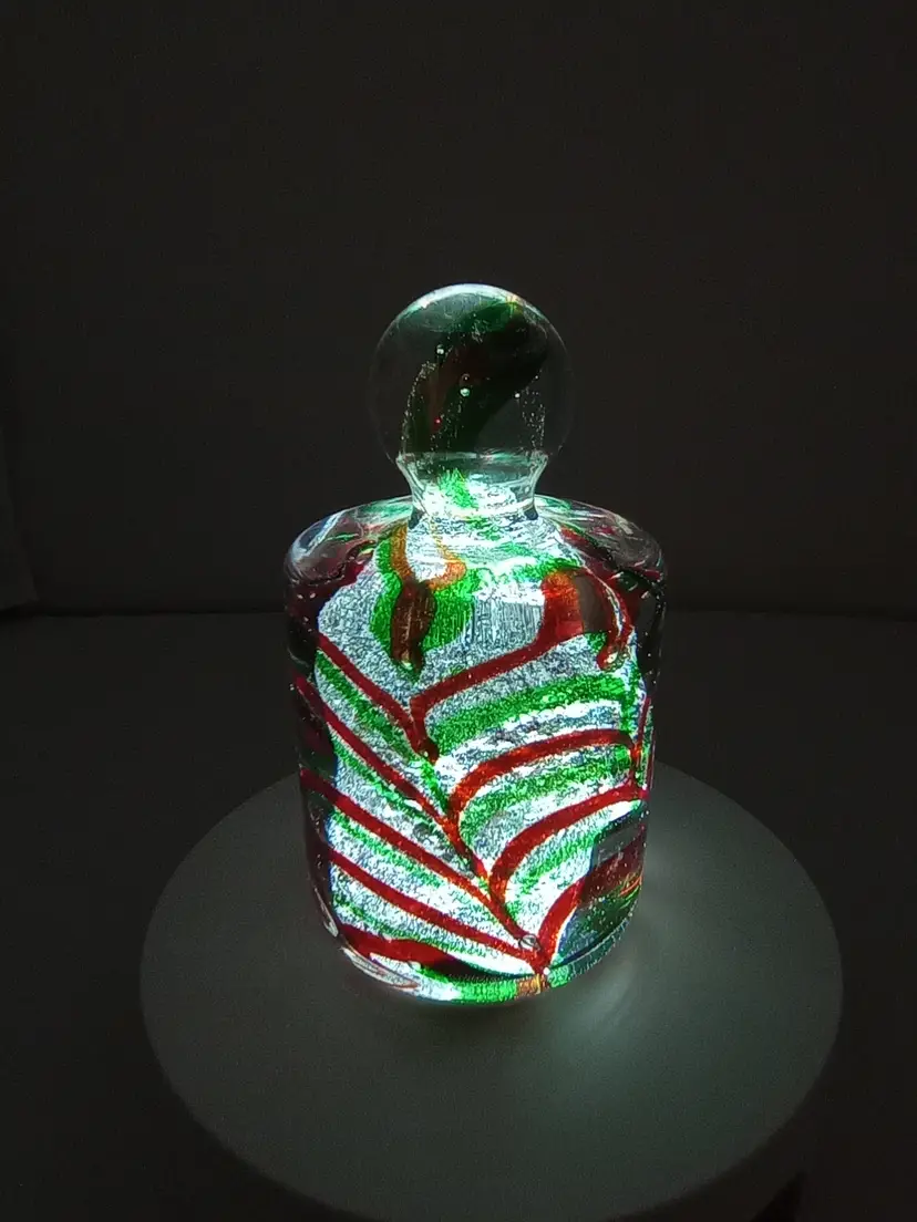This is a beautiful cylinder paperweight with knob by Fratelli Toso, Murano. It's got red and green pulled swirls with the shimmer of aventurine. It's in excellent condition with no noted flaws.