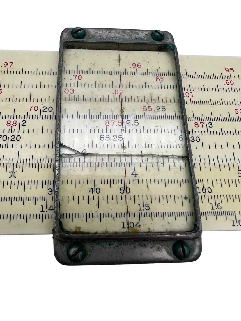 Rule shows normal use and light oxidation on metal parts; case has surface wear and scuffs along with the original owner name imprint. There is a crack on the cursor glass on one side of the slide rule. See pictures for further details on condition.