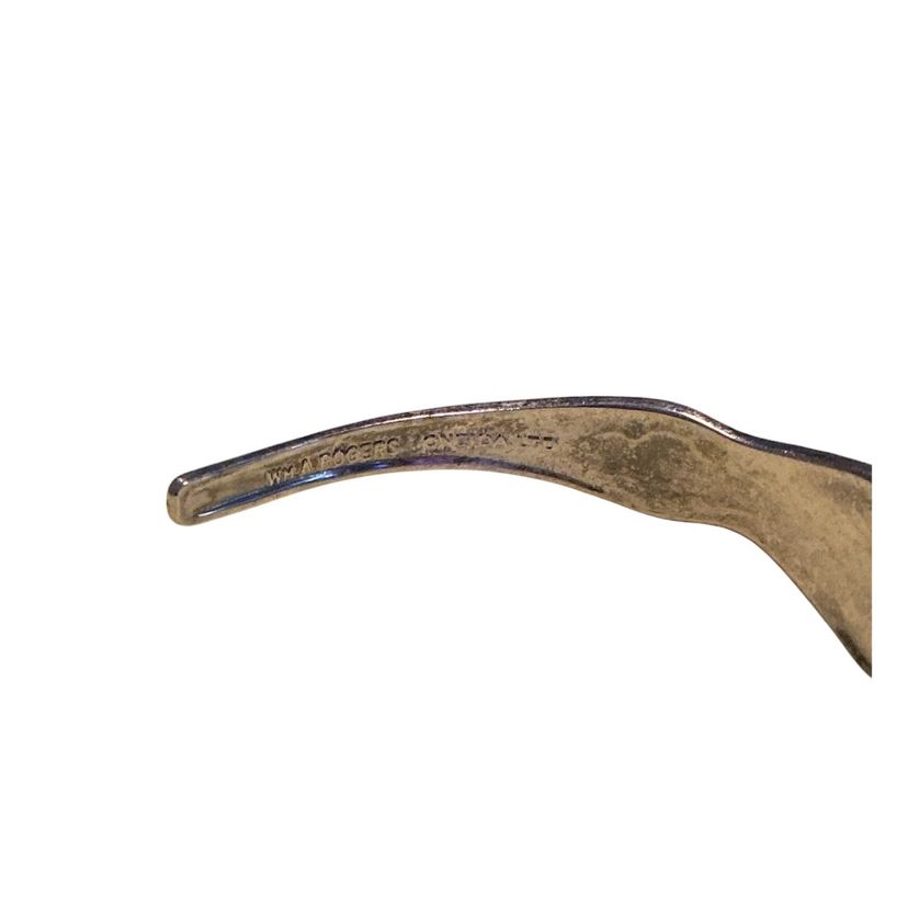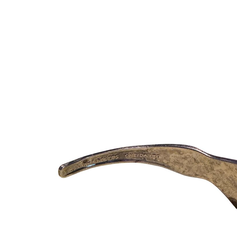 This is a vintage W.M. A. Rogers Oneida LTD cuff bracelet.Made of mixed materials with a silver plated finish, it features a beautiful floral design with a double spoon shape. The bracelet is 2-3/8" in length with a 1" gap and 1/2" in width, making it a comfortable fit for most wrists. The engravable top adds the ability personal touch.